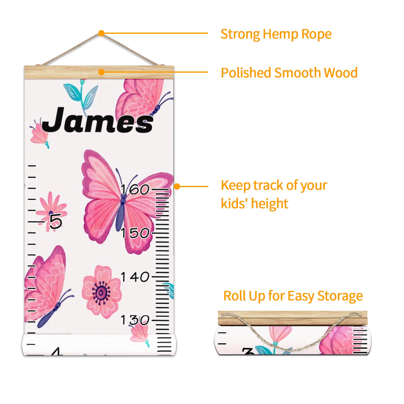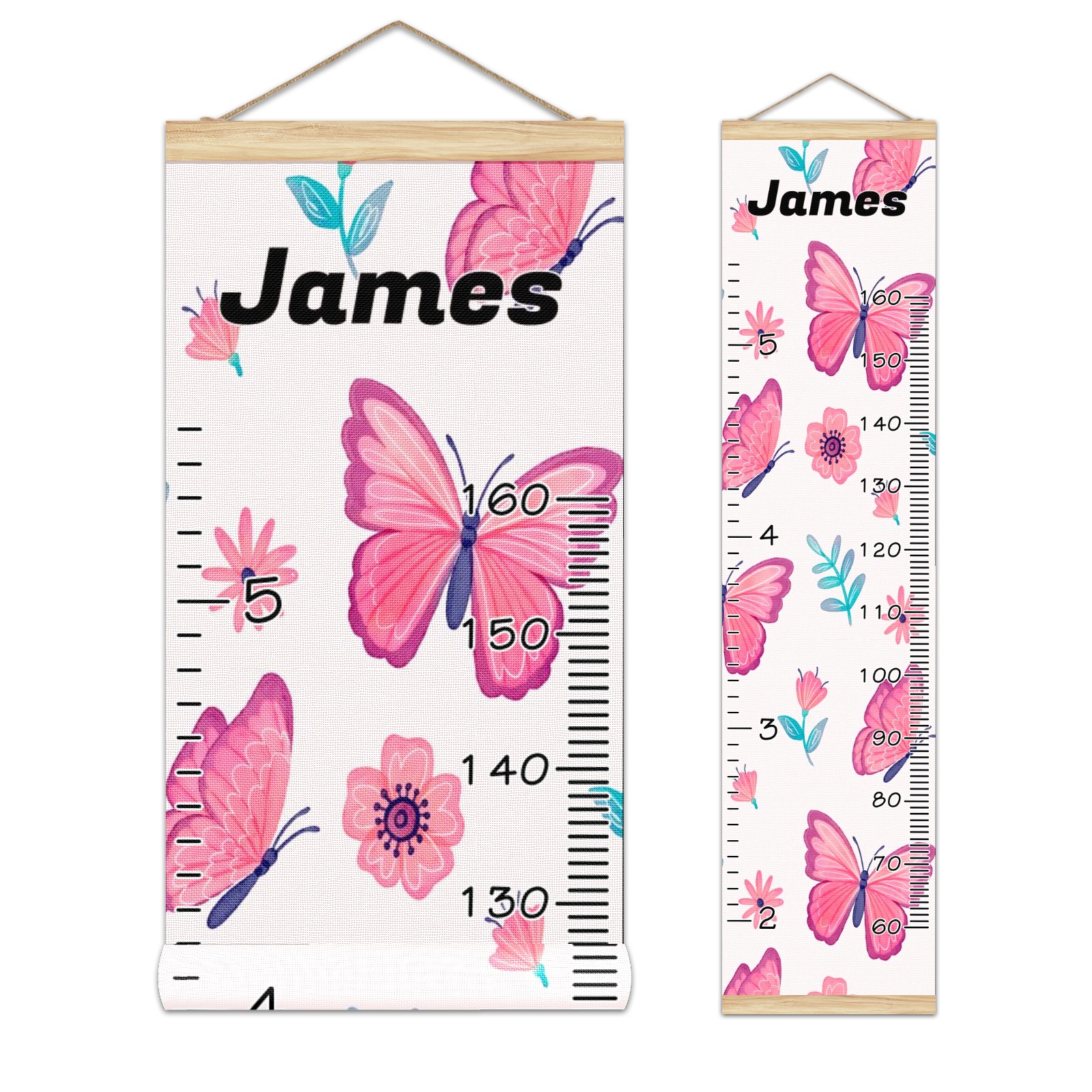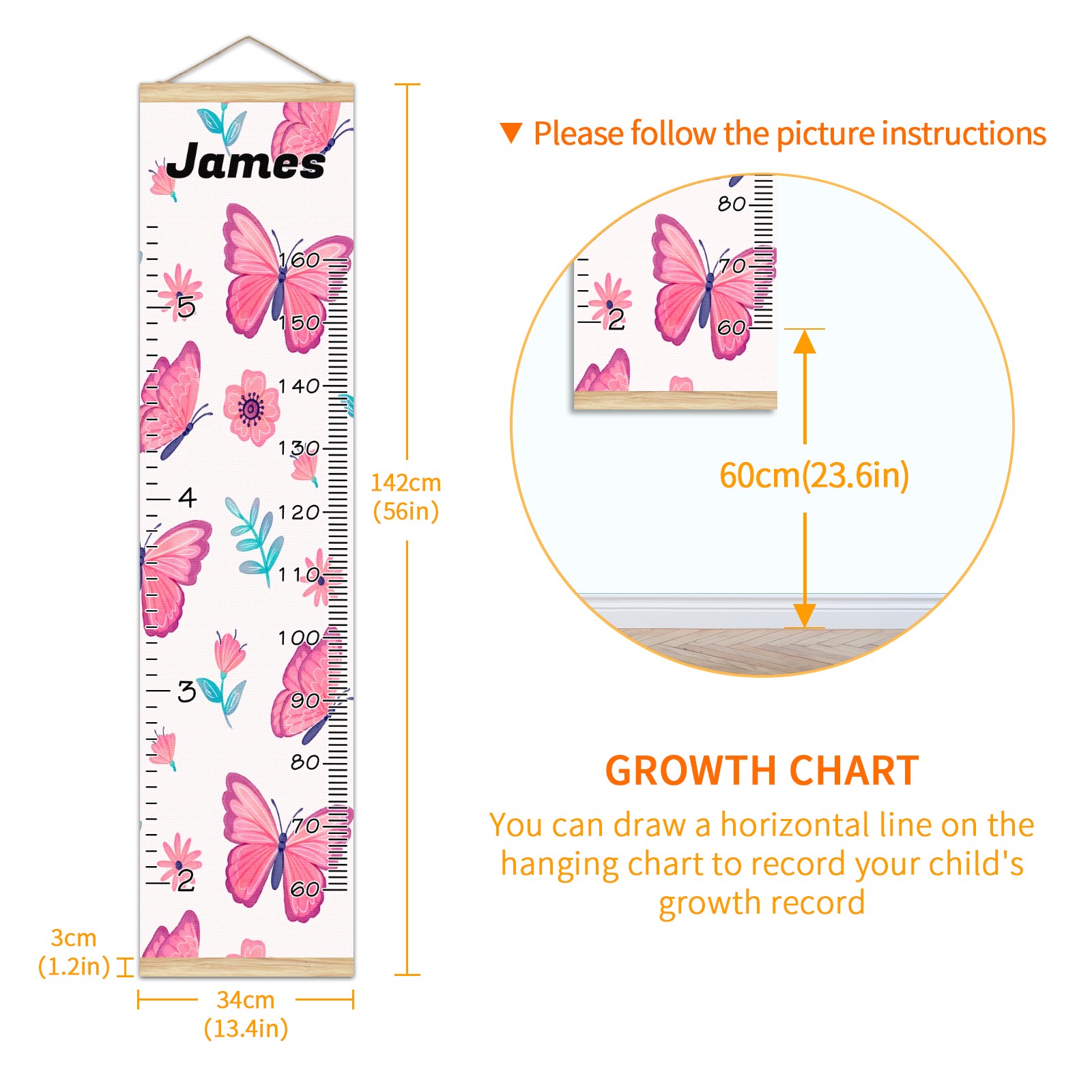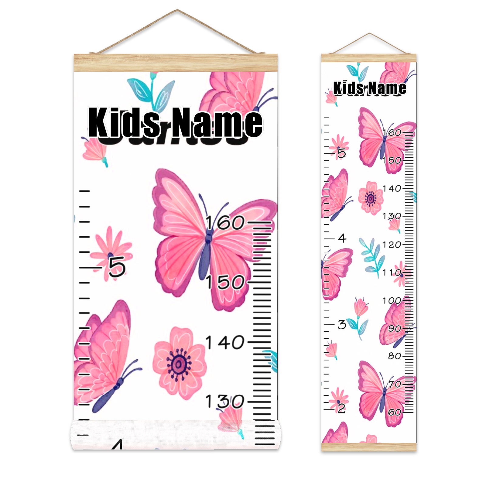 Personalized Kids Name Growth Chart Ruler for Wall Wood Frame Canvas Height Measure Chart 13.4x56 in Hanging Growth Chart Pink Butterfly & Flower3.18 Boys Girls Room Decor