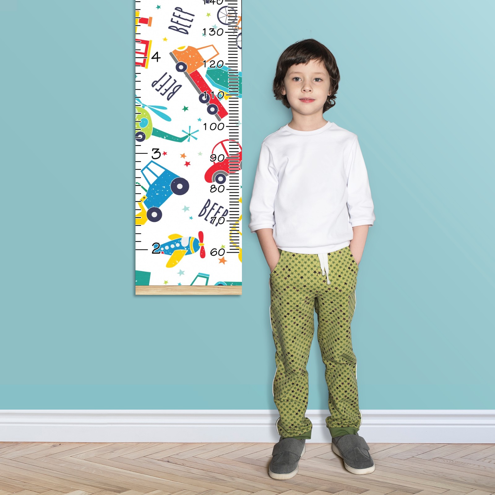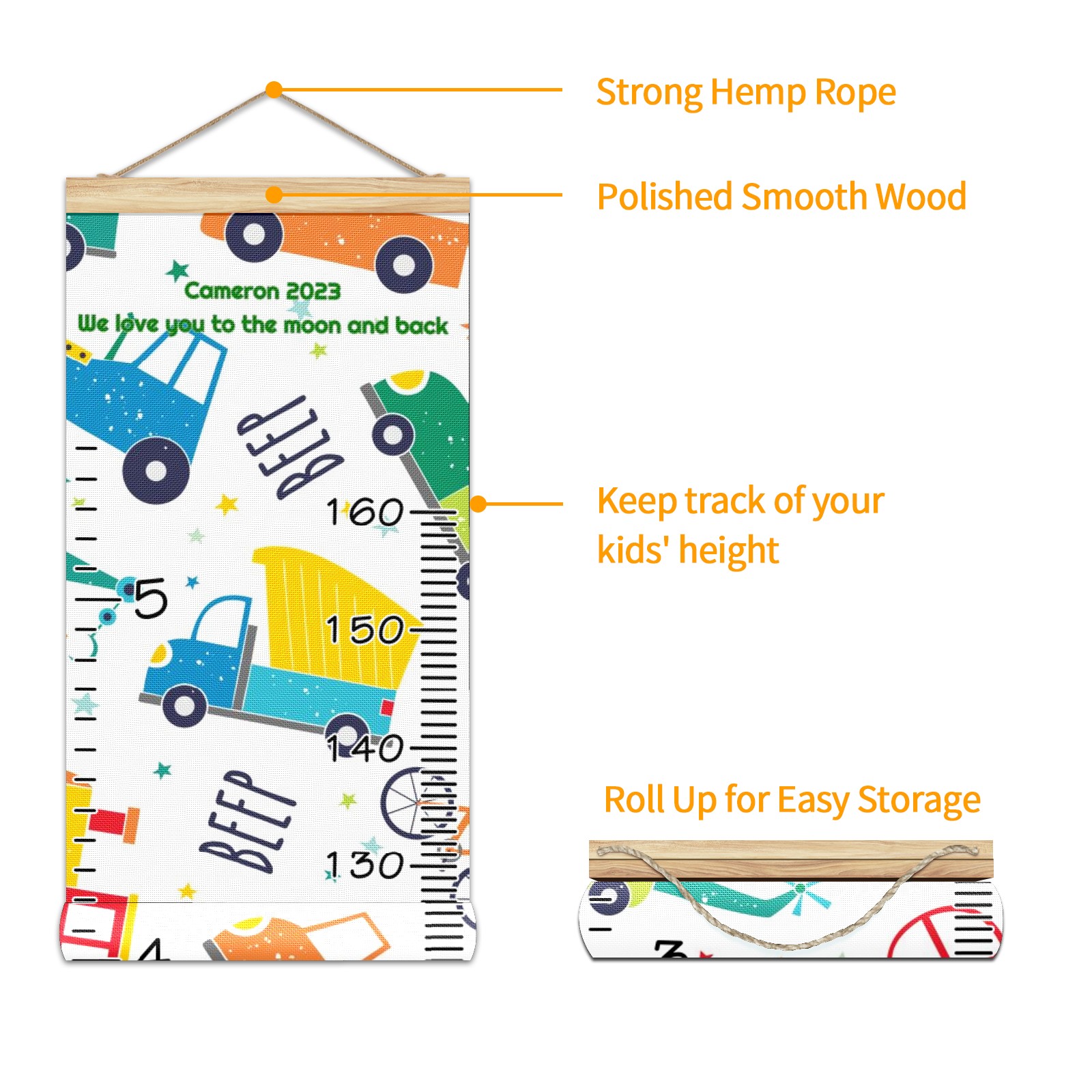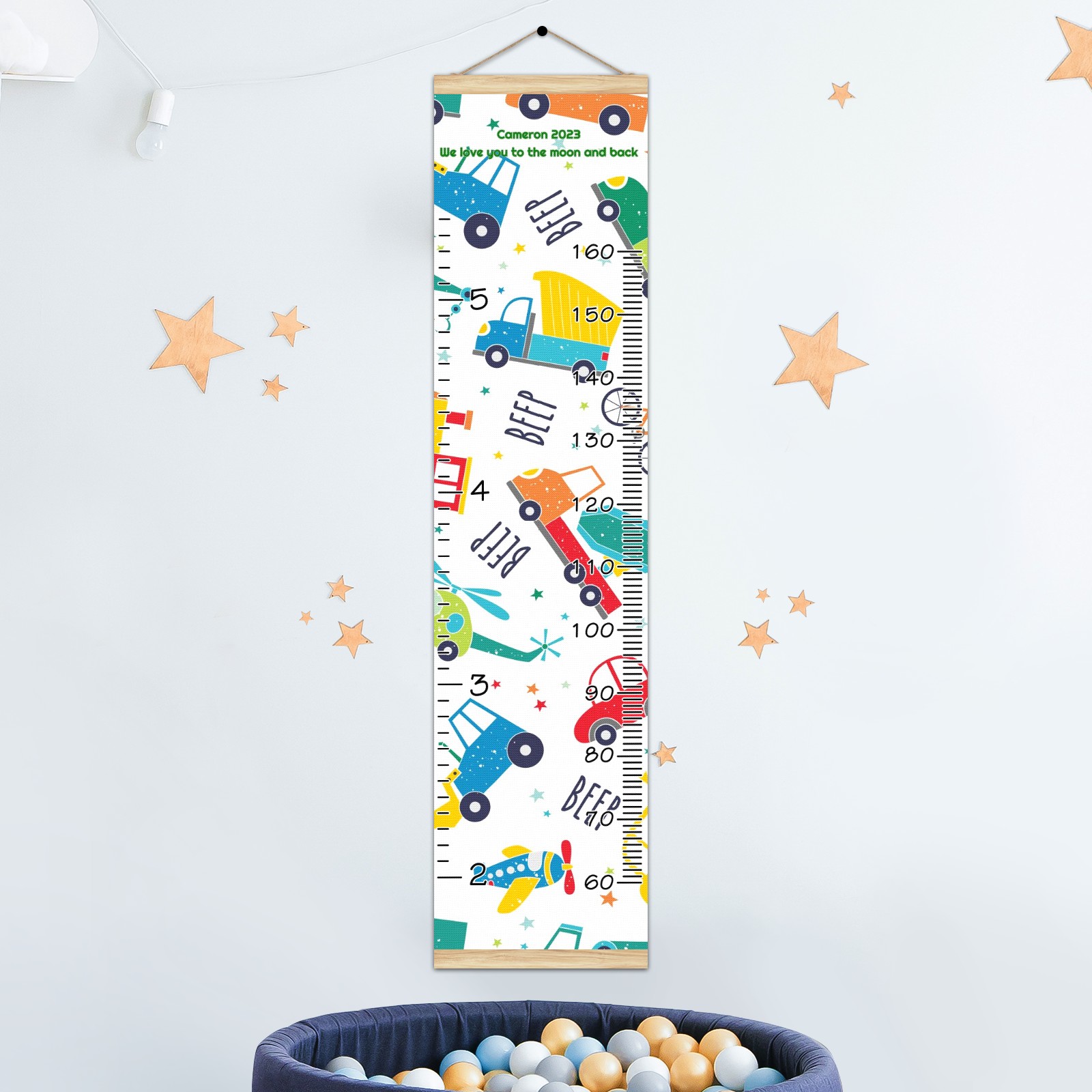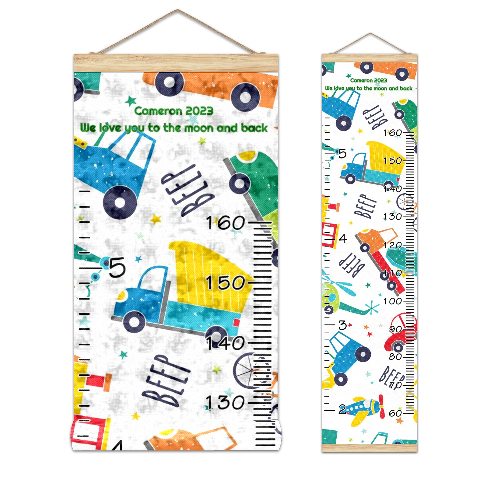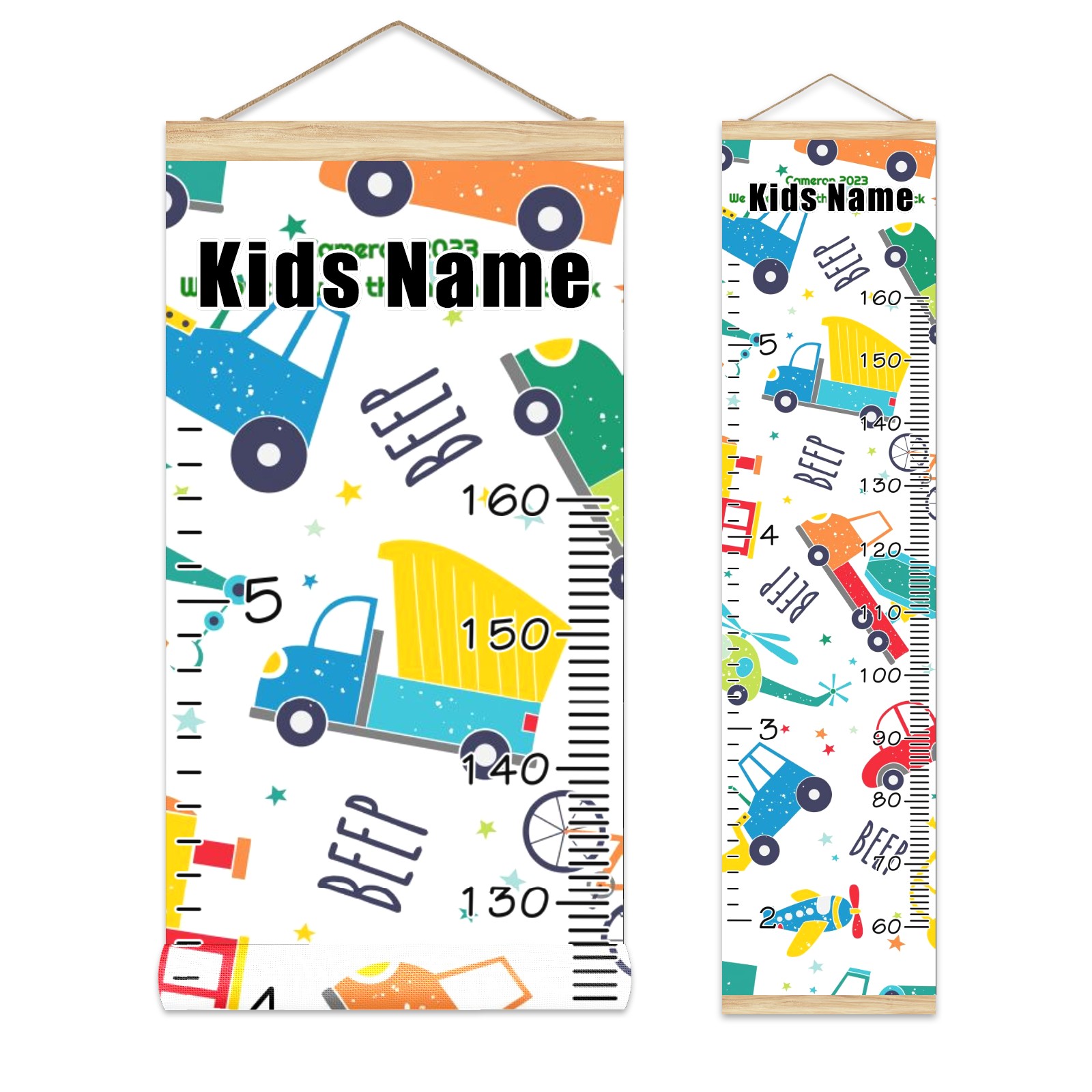 Personalized Kids Name Growth Chart Ruler for Wall Wood Frame Canvas Height Measure Chart 13.4x56 in Hanging Growth Chart Cartoon Car Truck3.18 Boys Girls Room Decor