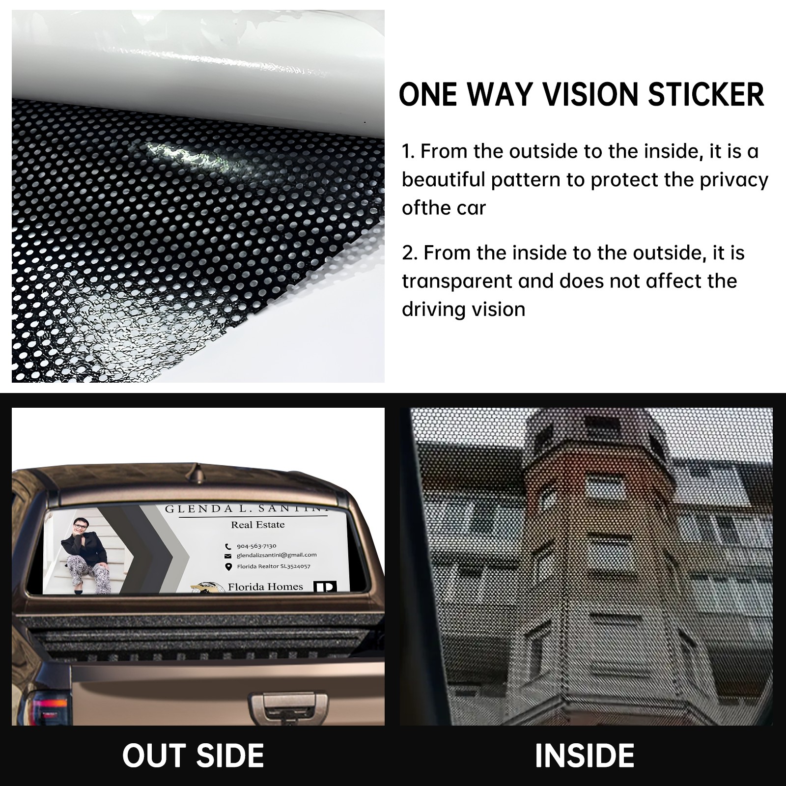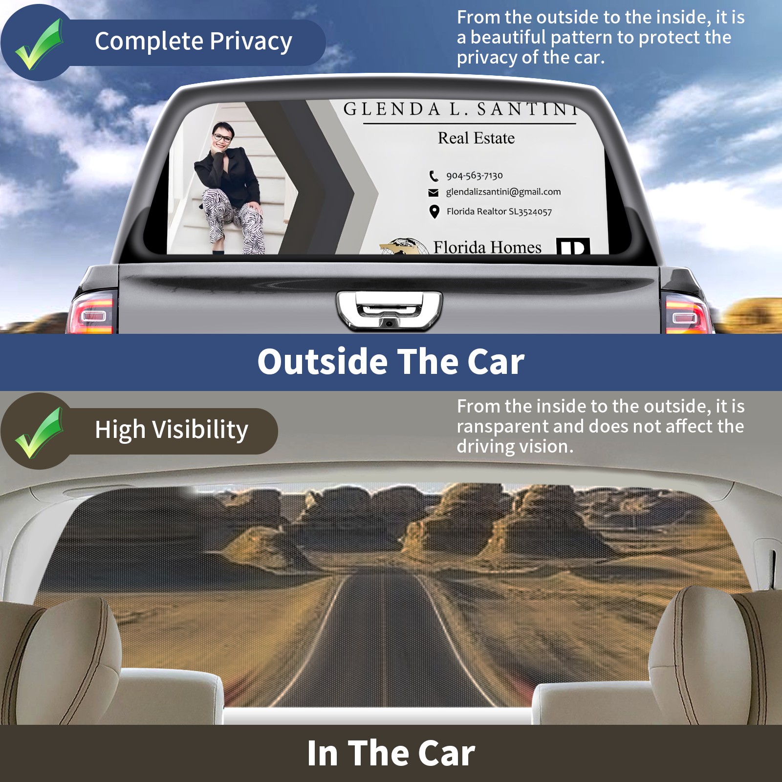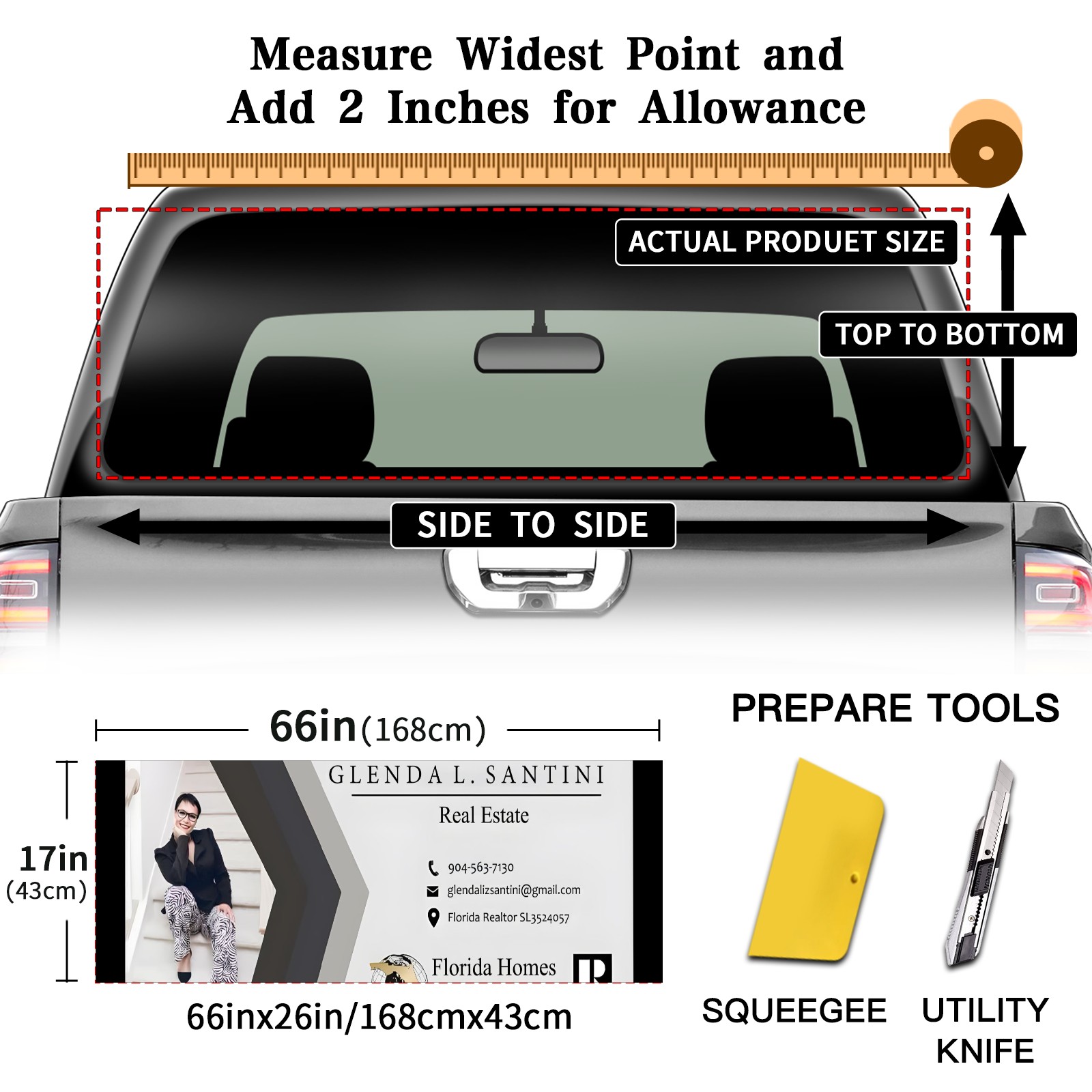 <p><strong>Truck Rear Window Graphics Decals Pickup Trucks Back Window Film Stickers 66" x 22" Perforated Vinyl Wrap Stickers Decorations for Car Rear Window</strong></p><p><strong><br /></strong></p><p><strong>Features :</strong></p><p>- Size of the rear window decals for trucks is 66x22 Inches (168x56cm).</p><p>- High quality perforated vinyl window film, one way vision sticker.</p><p>- Perforated is see through from the inside but not from outside.</p><p>- Clear printing, waterproof and durable.</p><p>- The car back window graphics stickers fits most truck and makes your vehicle more beautiful.&nbsp;</p><p><br /></p><p><strong>【Installation Instructions】</strong></p><p><strong>1. CLEAN SURFACE -</strong> Clean the rear window thoroughly and make sure the surface clean.</p><p><strong>2. STICK THE DECALS -</strong> Tear off the paper on the back and stick the decal on the window.</p><p><strong>3. SCRAPE OFF AIR BUBBLES -</strong> Use a squeegee or other card to scrape off the excess air bubbles.</p><p><strong>4. TRIM THE EXCESS -</strong> Use a knife to cut off the excess stickers of the window, finally complete.</p><p><br /></p><p>1. Please measure the size before purchasing, back window graphics decal for truck can be cut to your desired size.</p><p>2.The graphics stickers for truck back window is a great gift for yourself also can as a birthday / halloween / christmas gift for your friends and family.</p>