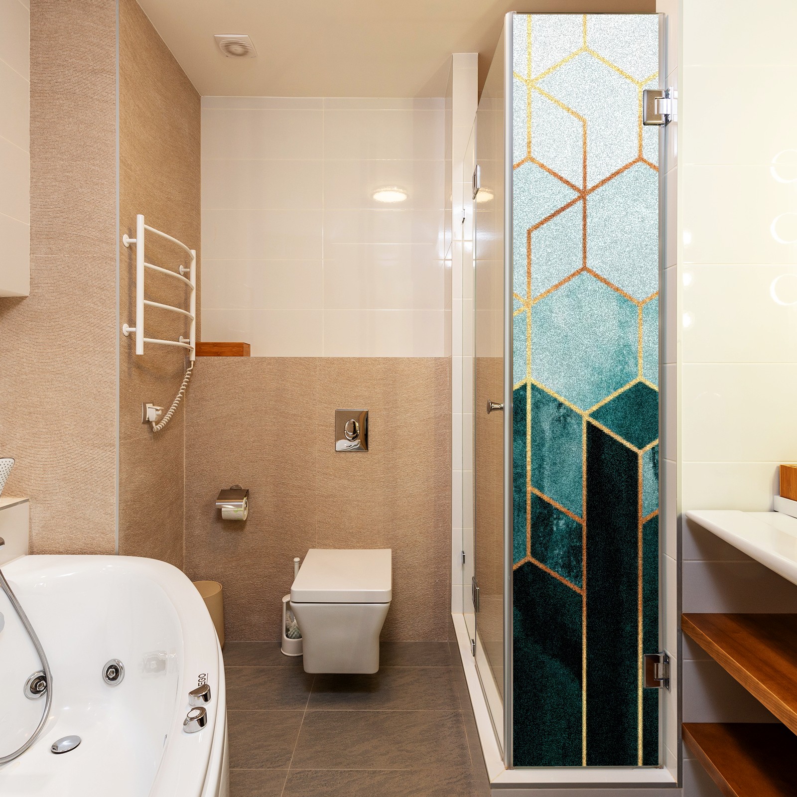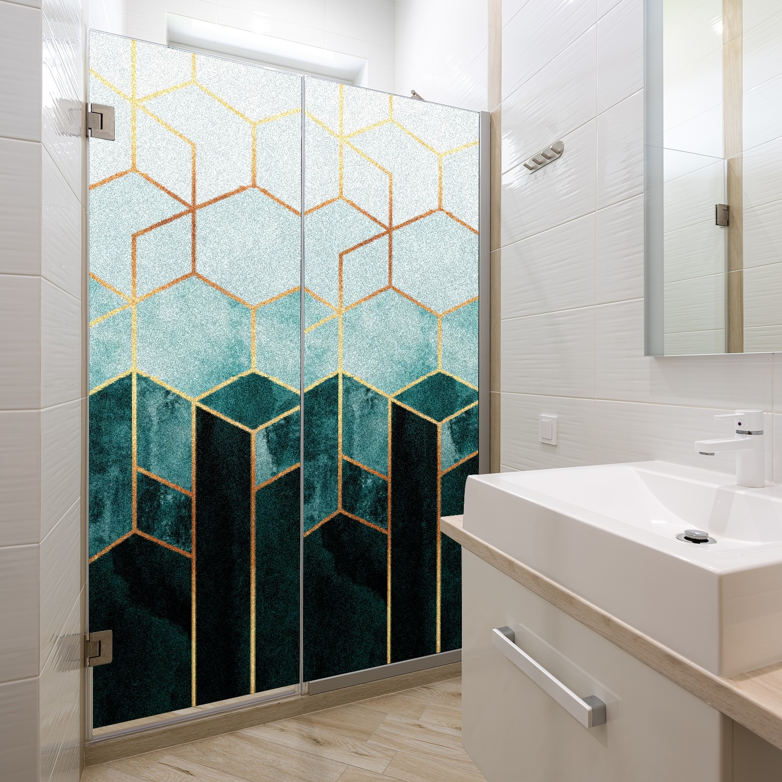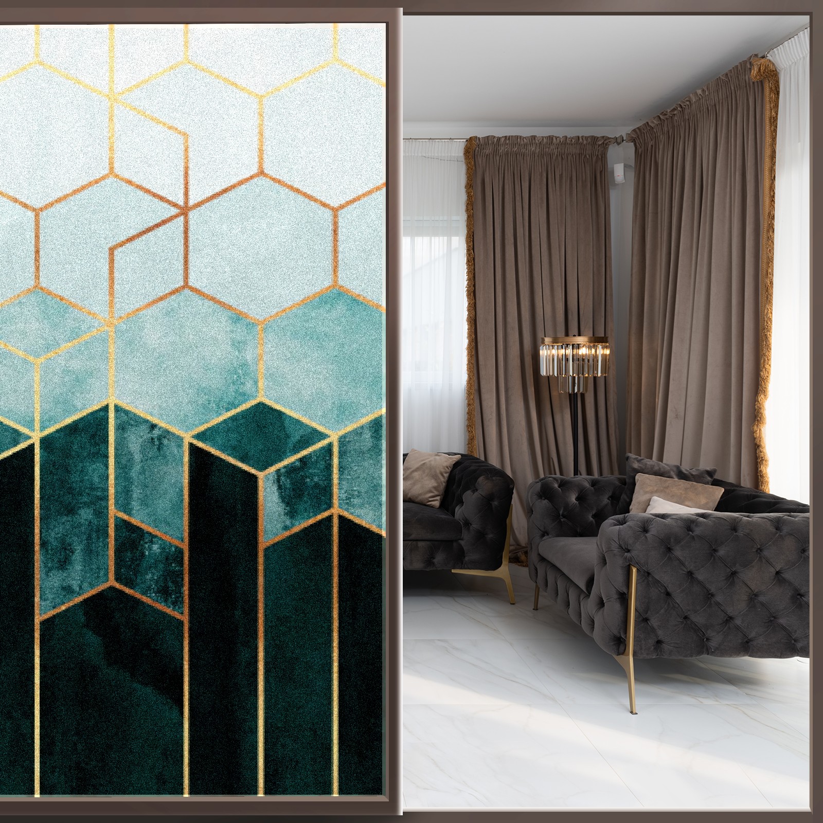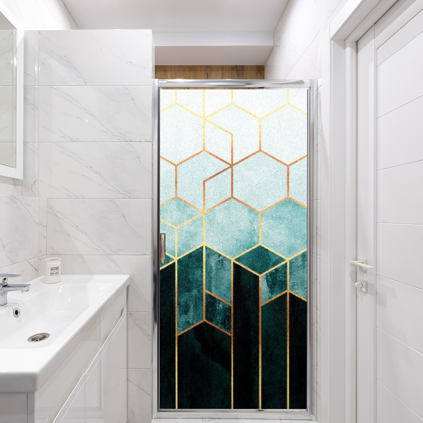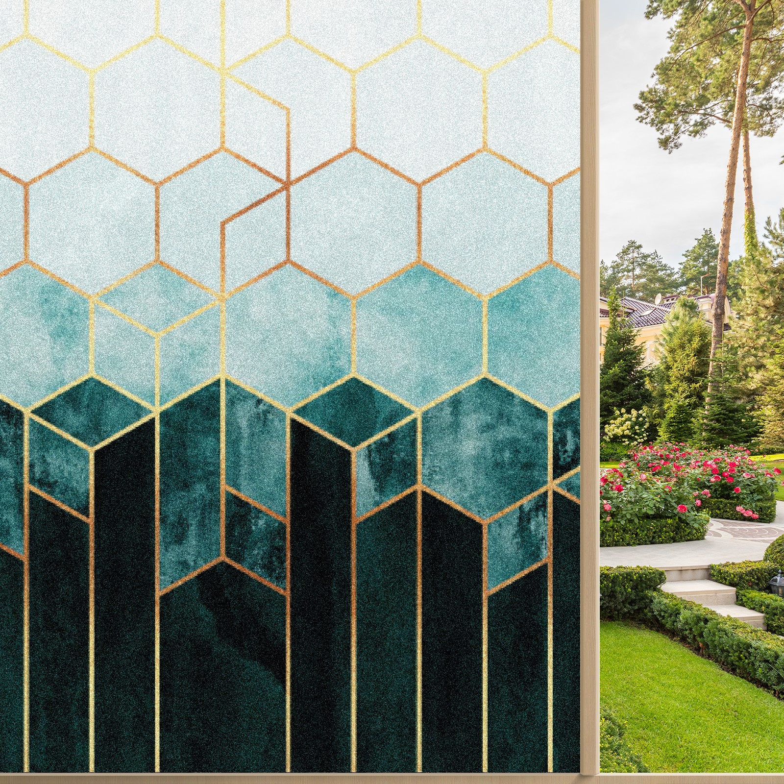 Window Privacy Film Frosted Stained Glass Film Decorative Static Cling for Bathroom Home Office Peel and Stick Window Film Marble Green Geometry(17.7x23.6in)