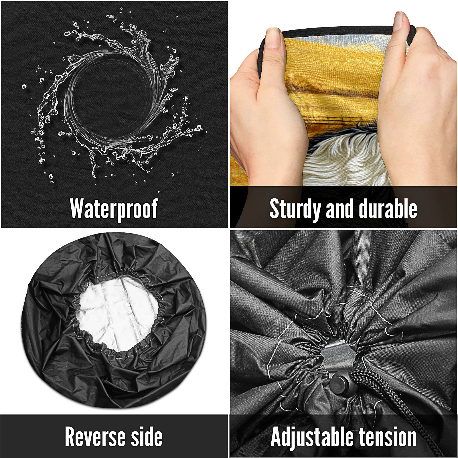 <p>Spare Tire Cover Size</p> <p>Size 14" fits for tire diameter 23"-27"(60~69cm)</p> <p>Size 15" fits for tire diameter 28"-29"(70~74cm)</p> <p>Size 16" fits for tire diameter 30"-31"(75~79cm)</p> <p>Size 17" fits for tire diameter 32"-33"(80~84cm)</p> <p><br></p> <p>- Premium Material: Our spare tire cover is made of high-quality polyester fabric, ensuring durability and waterproof performance. Protect your spare tires from rain, wind, dust, UV rays, and other harsh weather conditions.</p> <p>- Multifunctional Use: Our trailer spare tire cover is suitable for trailers, RVs, SUVs, campers, trucks, and other vehicles. Keep your spare tires clean, prevent corrosion, and prolong their lifespan.</p> <p>- Easy to Use: Our tire covers for trailers can be effortlessly fitted and securely fastened with the adjustable nylon cord, preventing it from slipping off. </p> <p>- Reliable After-Sales Service: We stand behind the quality of our product. If you encounter any issues with our spare tire cover, please feel free to contact us. We will provide a satisfacto</p>