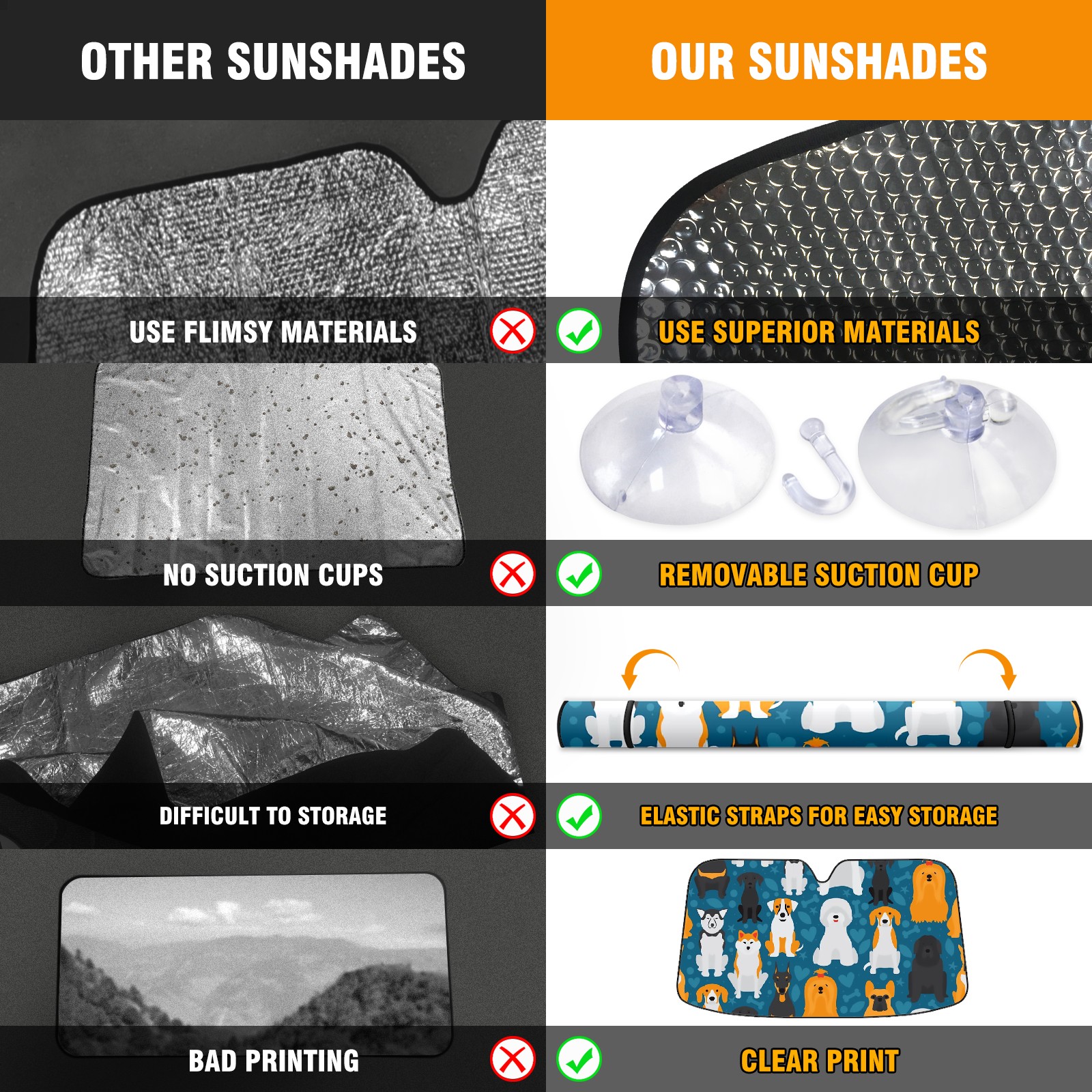 • <p><b>Foldable Premium Car Windshield Sunshade is your great solution to reduce your car’s interior temperature dramatically! This is definitely a must-have item for your summer travel!</b></p><p><b>【Precision Fit, Stylish Protection】</b></p><p>55"x30" (140x76cm) universal size with 3cm flexible margins fits curved windshields of most sedans/SUVs.</p><p><b>【Blocking Uv Rays &amp; Heat Insulation】</b></p><p>Our vehicle sunshade provides effective UV, sun, and summer heat protection, preventing leather fading and plastic cracking to keep your car interior pristine.</p><p><b>【Zero-Mark Installation &amp; Space-Saving】</b></p><p>Equipped with dual scratch-free silicone suction cups + adjustable straps: Medical-grade silicone cups hold firmly yet remove cleanly. Folds to A3 size (42x30cm x &lt;2cm thick), tucks discreetly into glove compartments or door pockets.&nbsp;</p>