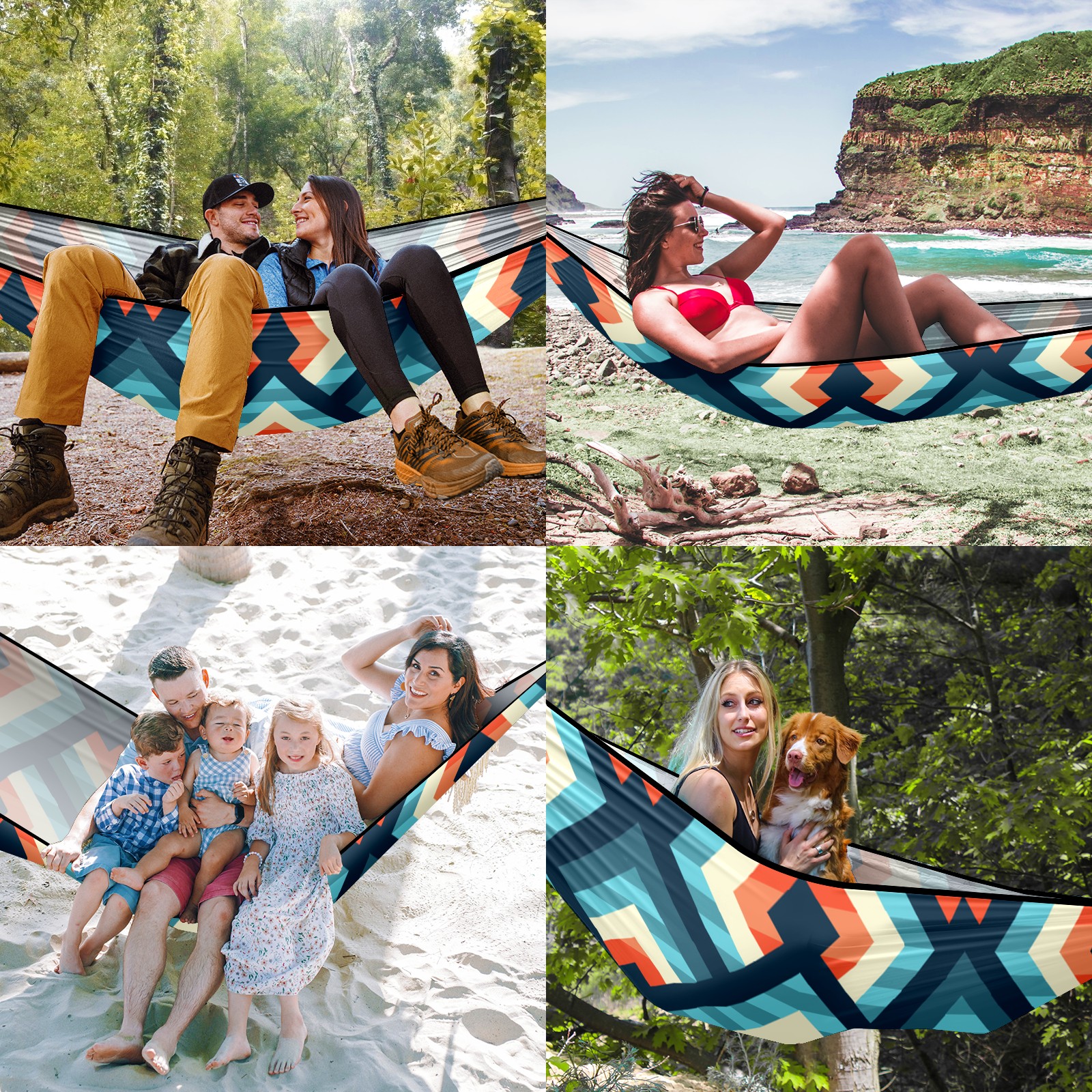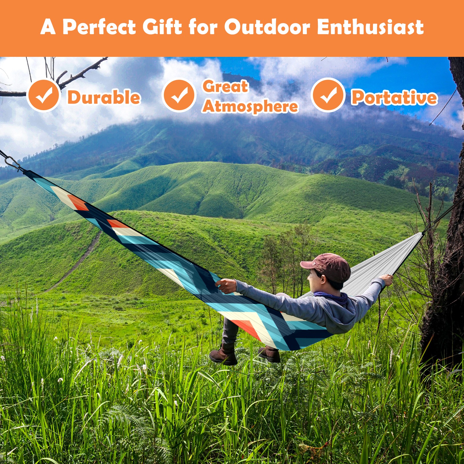 <p><b>Portable Camping Hammock with Storage Bag & Carabiners - for 1-2 People & Pets – where comfort meets durability!</b></p><p><b>Spacious Design:</b> 114"x70" oversized dimensions comfortably fit two adults, perfect for family bonding or romantic getaways.</p><p><b>Instant Portability:</b> Includes hammock, 2×carabiners, 2×straps, and a dual-purpose storage bag. Compact storage bag with drawstring closure folds the hammock to a water-bottle size – toss it in your backpack and go!</p><p><b>Multi-Scenario Use: </b>Effortlessly set up between trees, poles, or hooks with adjustable straps. Perfect for camping, beaches, backyards, or even indoor relaxation.</p><p><b>Care Instructions: </b>Hand wash with mild detergent, air dry. Do not bleach or machine wash to preserve longevity.</p><p><b>From solo relaxation to cozy moments with loved ones (even pets!), Counullo’s Camping Hammocks adapts to your needs!</b></p>