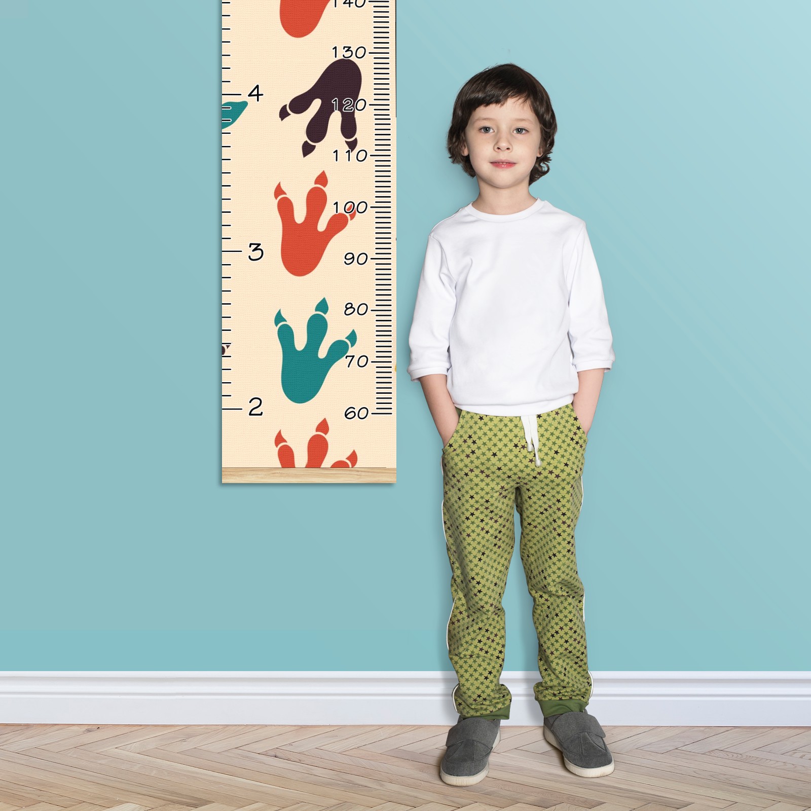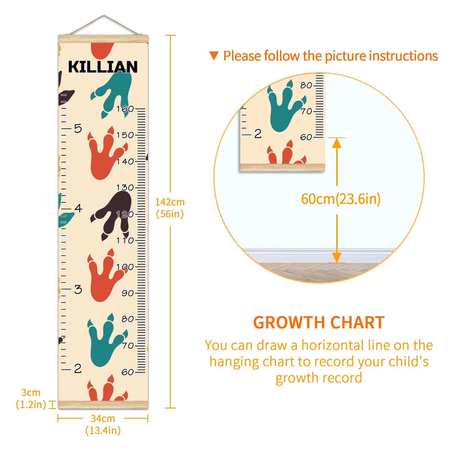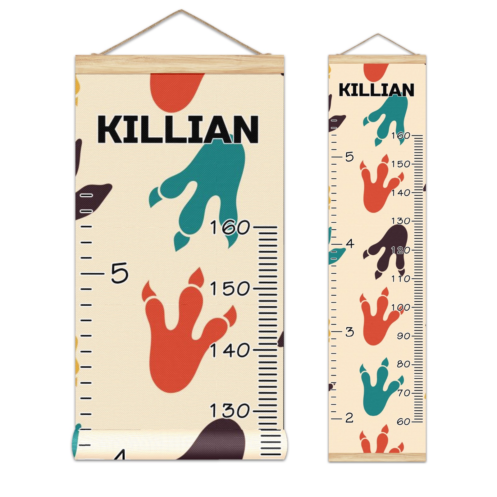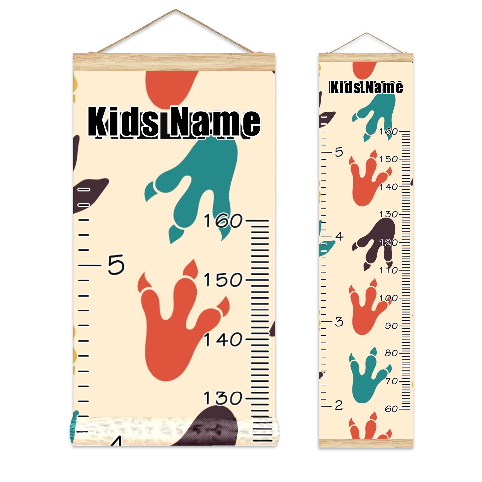 Personalized Kids Name Growth Chart Ruler for Wall Wood Frame Canvas Height Measure Chart 13.4x56 in Hanging Growth Chart Dinosaur Footprint3.25 Boys Girls Room Decor