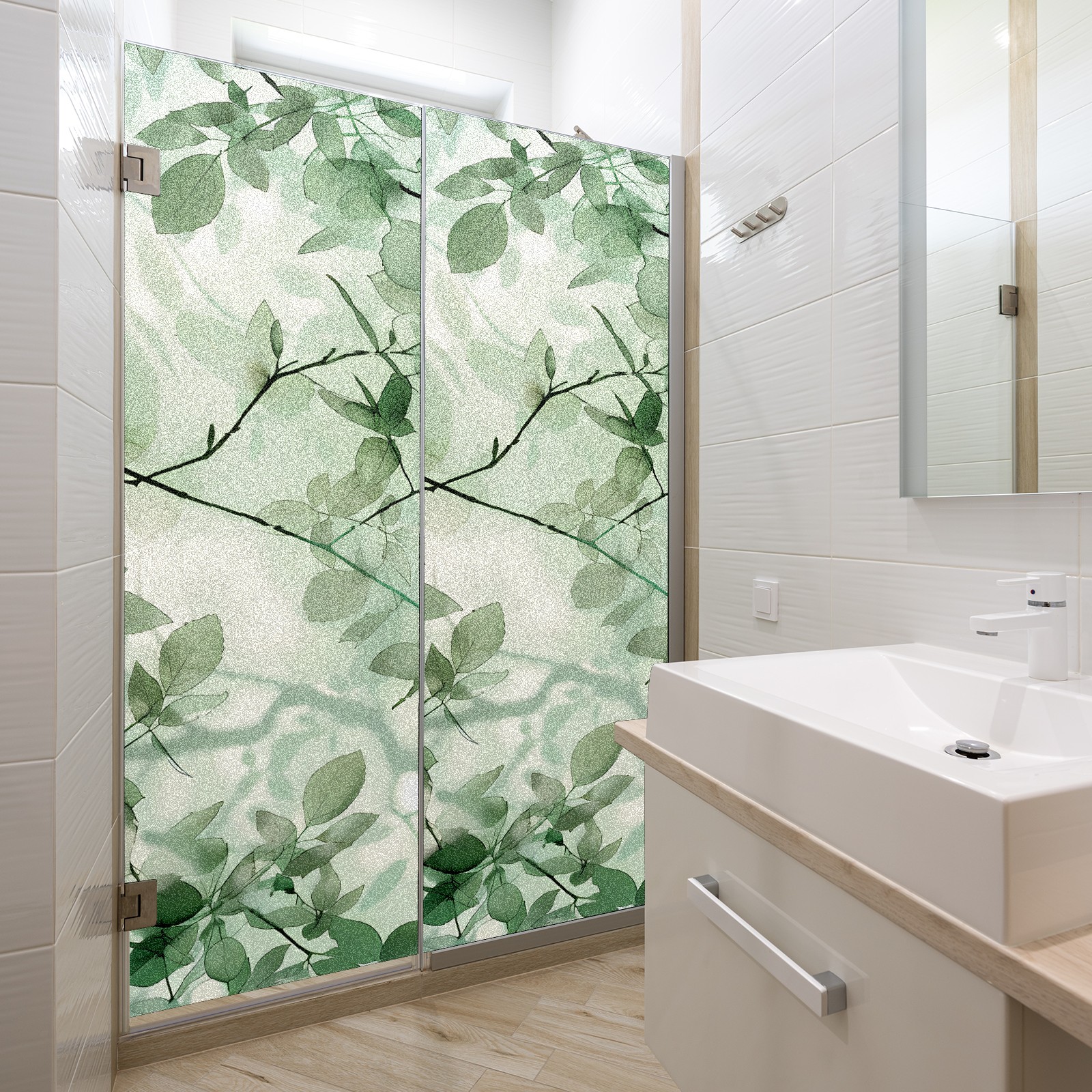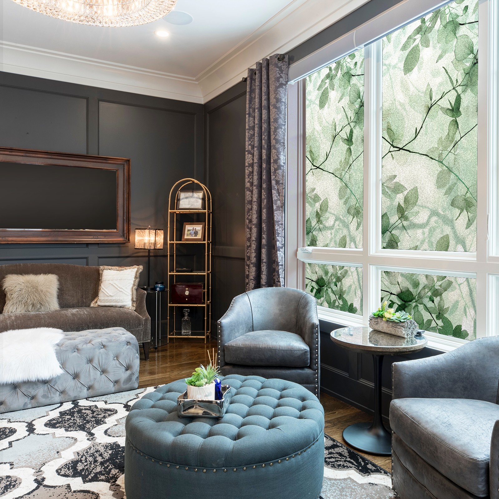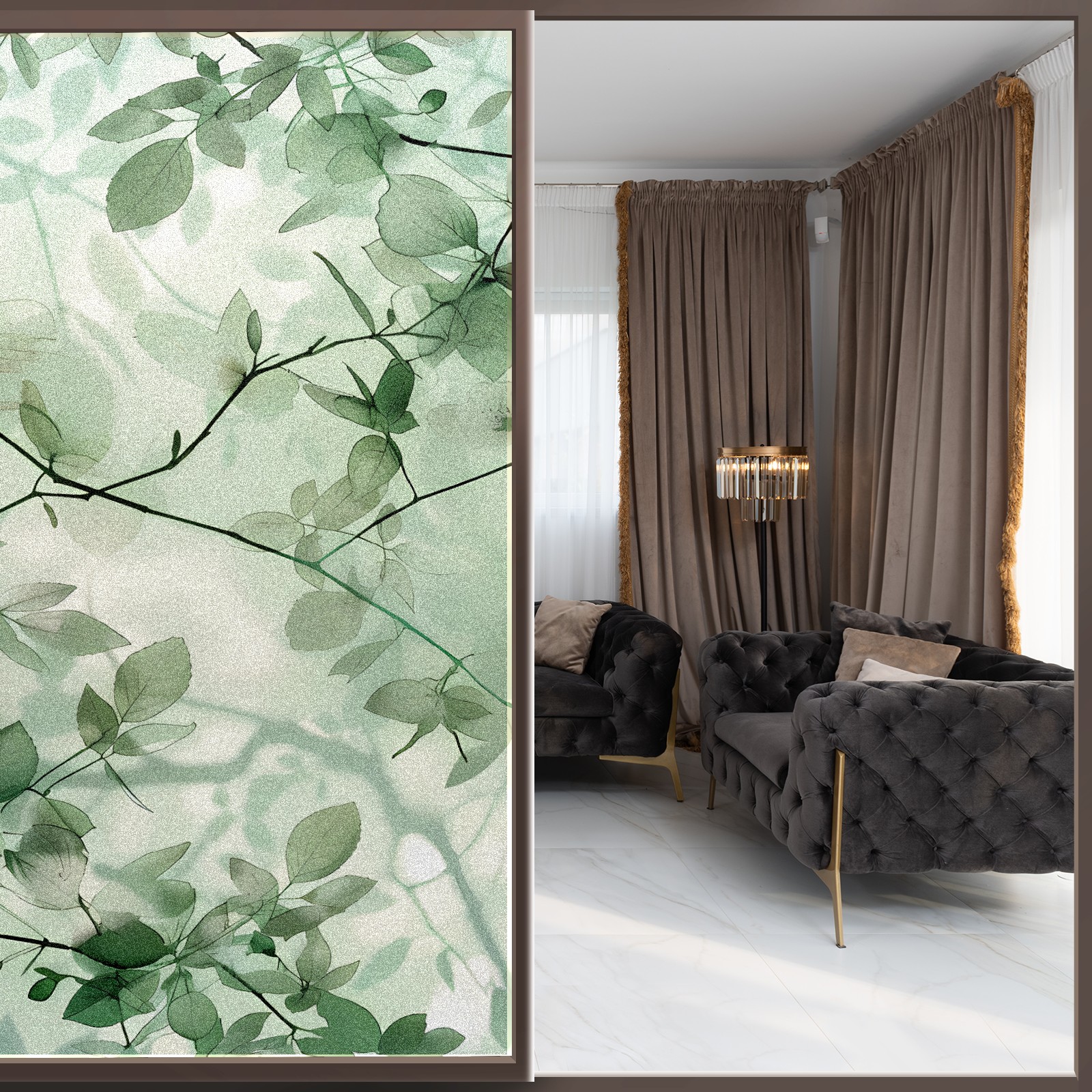 Window Privacy Film Frosted Stained Glass Film Decorative Static Cling for Bathroom Home Office Peel and Stick Window Film Green Branches Leaves(17.7x23.6in)