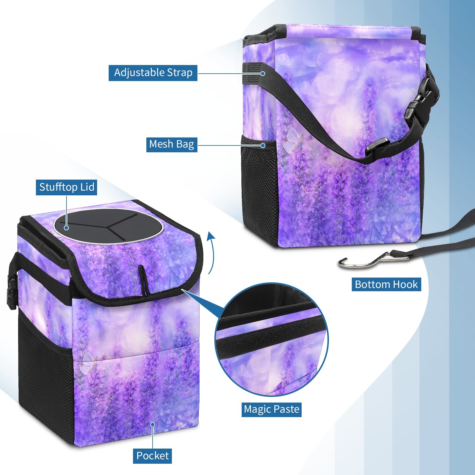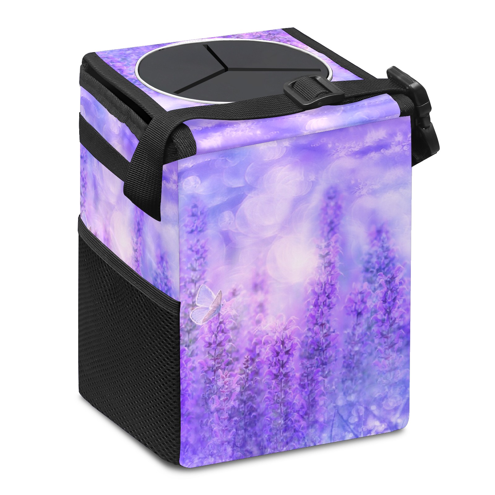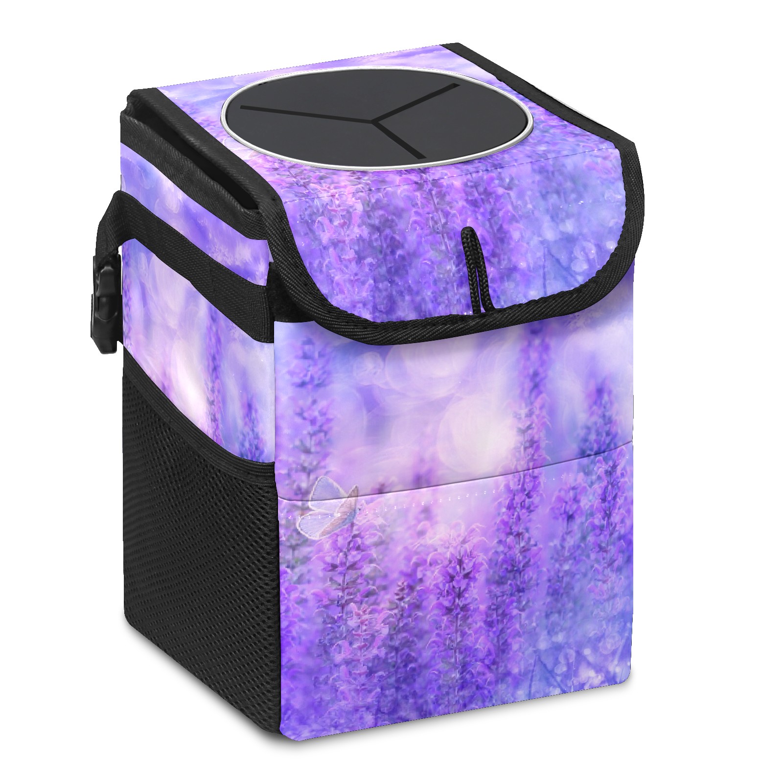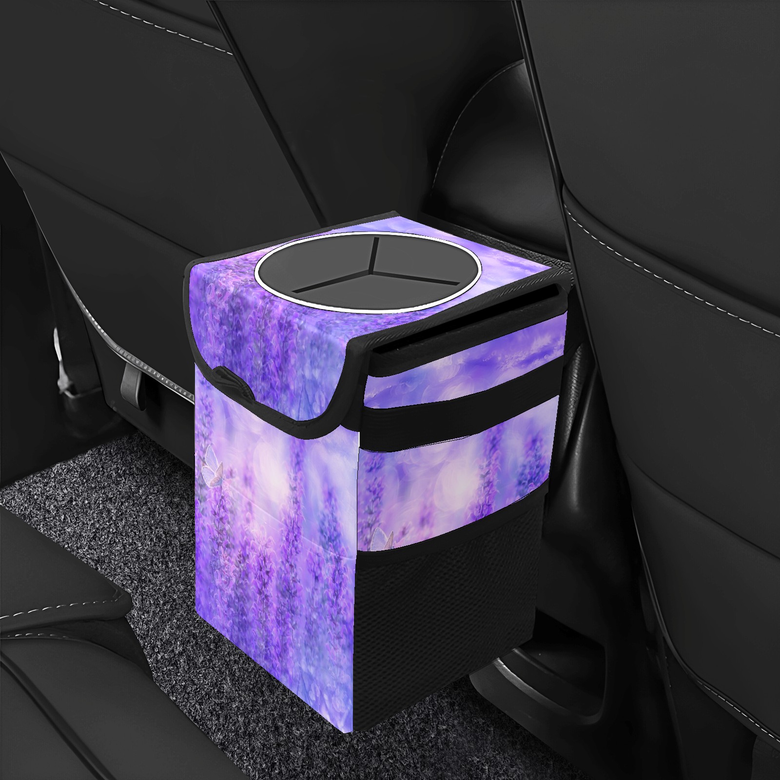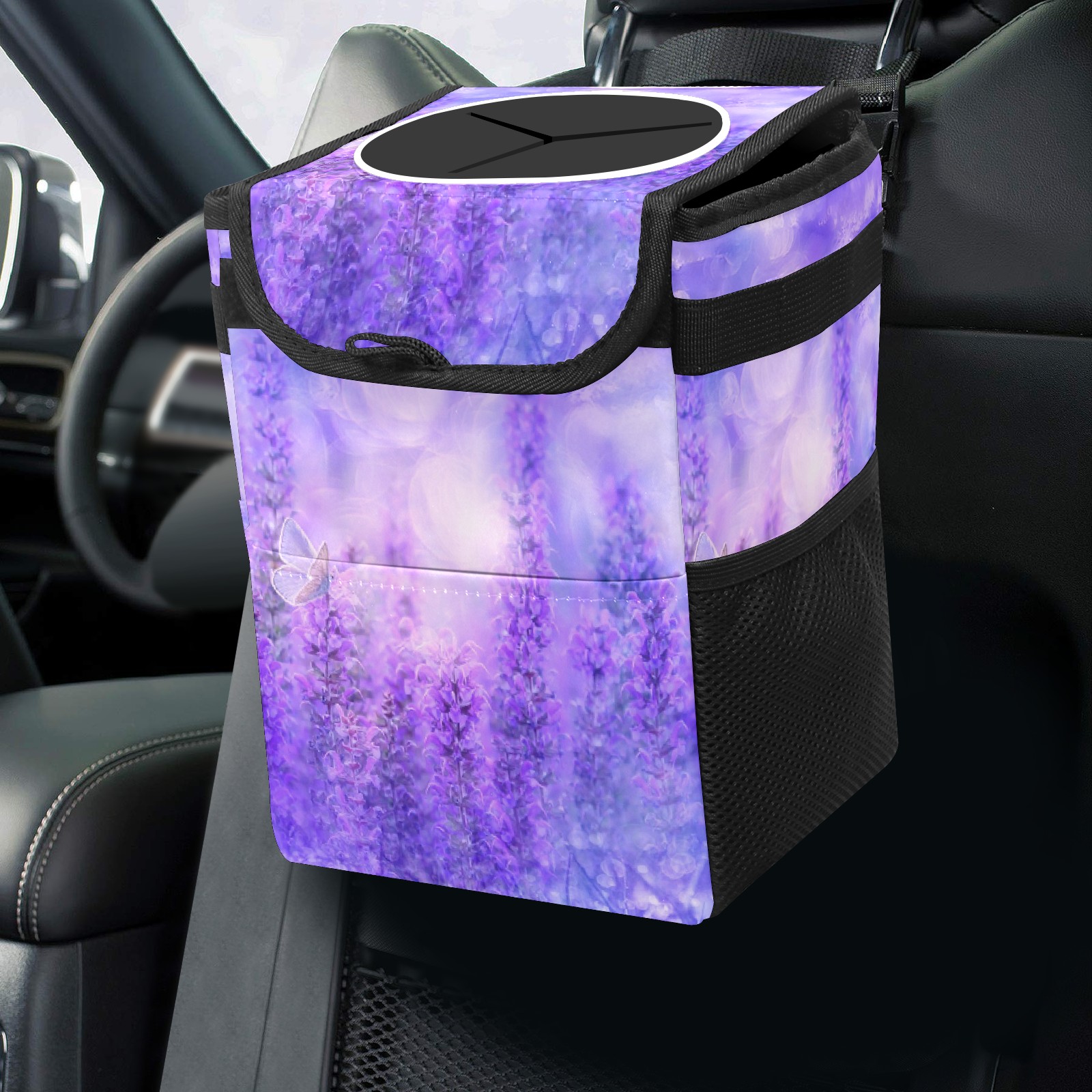 Car Trash Can Bin Lavender Purple Flowers Hanging Trash Can for Cars SUV for Back Seat, Collapsible Leakproof Vehicle Garbage Container Bag with Lid Storage Pockets Car Accessories Cute