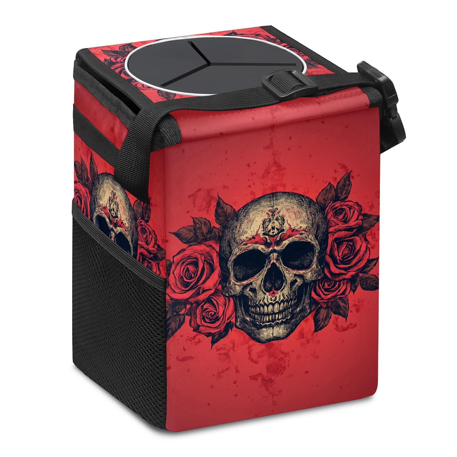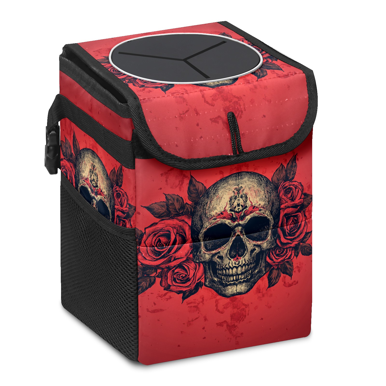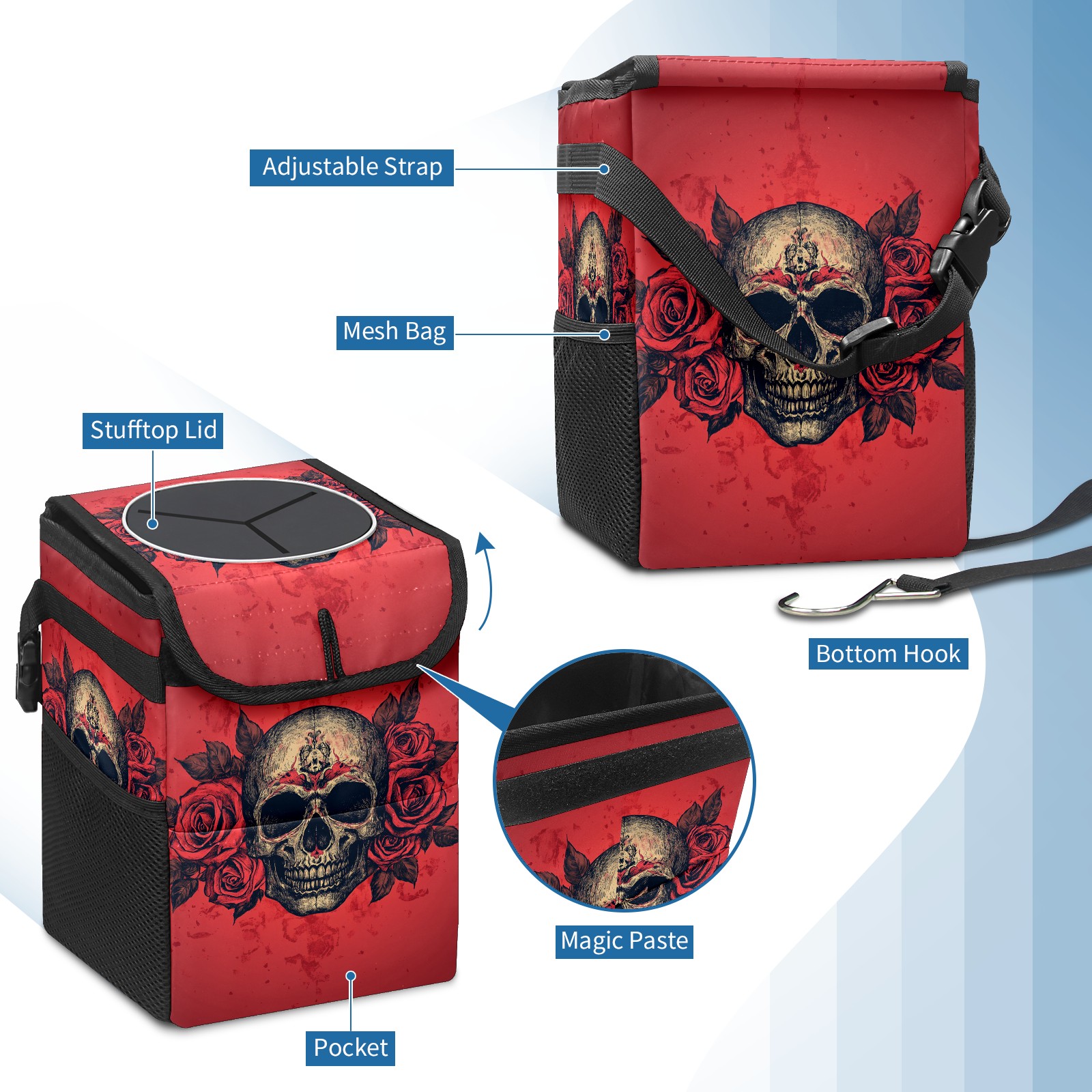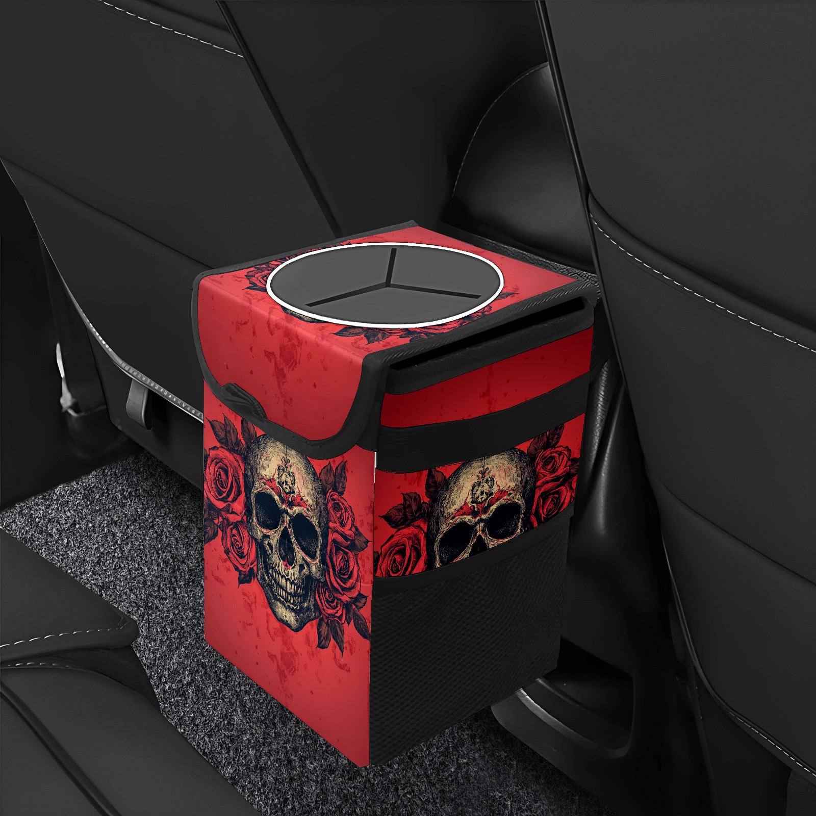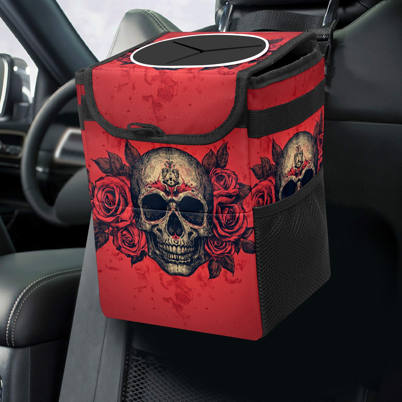 Car Trash Can Bin Skull Roses Red Hanging Trash Can for Cars SUV for Back Seat, Collapsible Leakproof Vehicle Garbage Container Bag with Lid Storage Pockets Car Accessories Cute