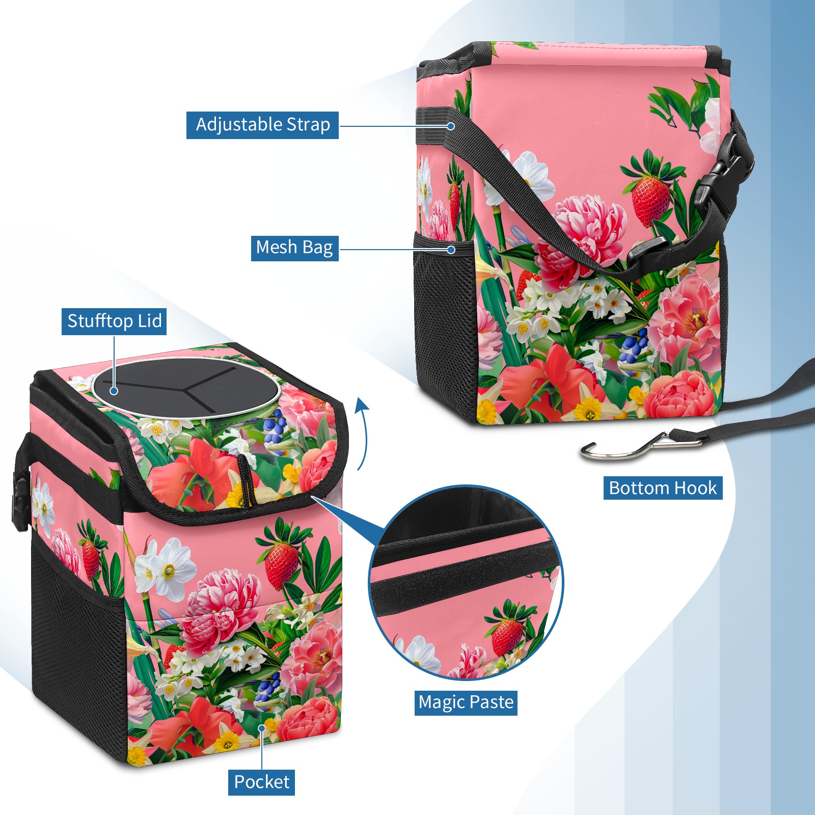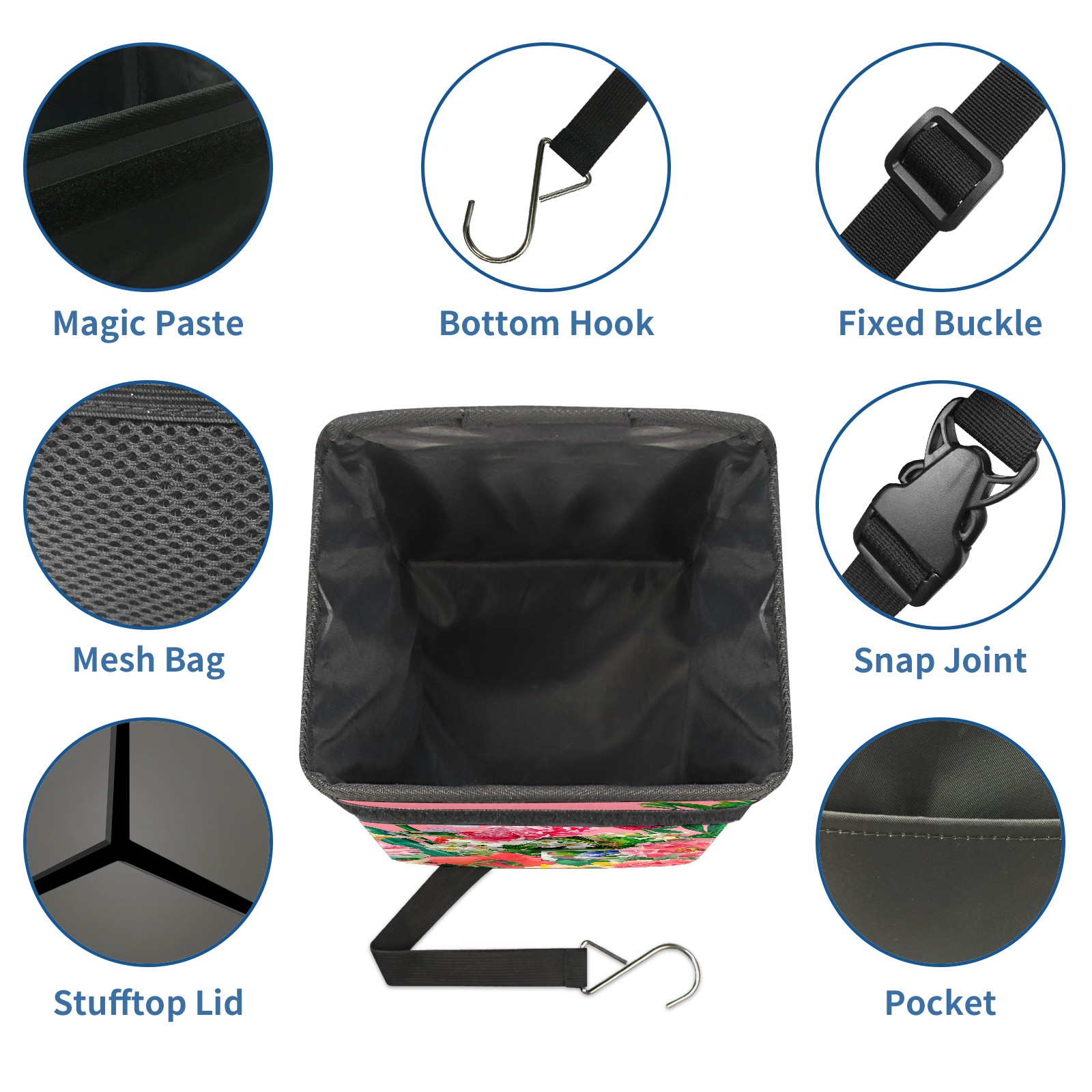 • <p><strong>Hanging Car Trash Can with Lid Leak-proof Waterproof Car Garbage Bin Collapsible Portable Car Storage Organizer with Mesh Pockets Large Capacity Trash Bag for Car SUV Trucks</strong></p><p><strong>Features :</strong></p><p><strong>LARGE CAPACITY</strong></p><p><strong>FOLDABLE AND LEAK-PROOF</strong></p><p><strong>EASY TO INSTALL</strong></p><p>- Size of our car garbage bag is 6.7x6.3x9.5&nbsp;inches.</p><p>- The material of trash can for car suv is premium polyester, waterproof and leak-proof, easy to clean and wash.</p><p>- Foldable design, when you're not using the car trash bag, you can fold it up and occupy less space.</p><p>- Our portable and collapsible car trash bag also a small car organizer can be used for storage small stuffs such as tissue, toys, bags, snacks, umbrella, etc.</p><p>- The car trash can is very easy to install, you can simply place it anywhere in your car like the gear shift, the console box, the ground of rear seat or hanging on the front seat back seat, the armrest box.</p><p>- The auto garbage box is&nbsp;ideal for many types of vehicles such as cars, trucks , SUVs, pickups, and van or boat and more.</p>