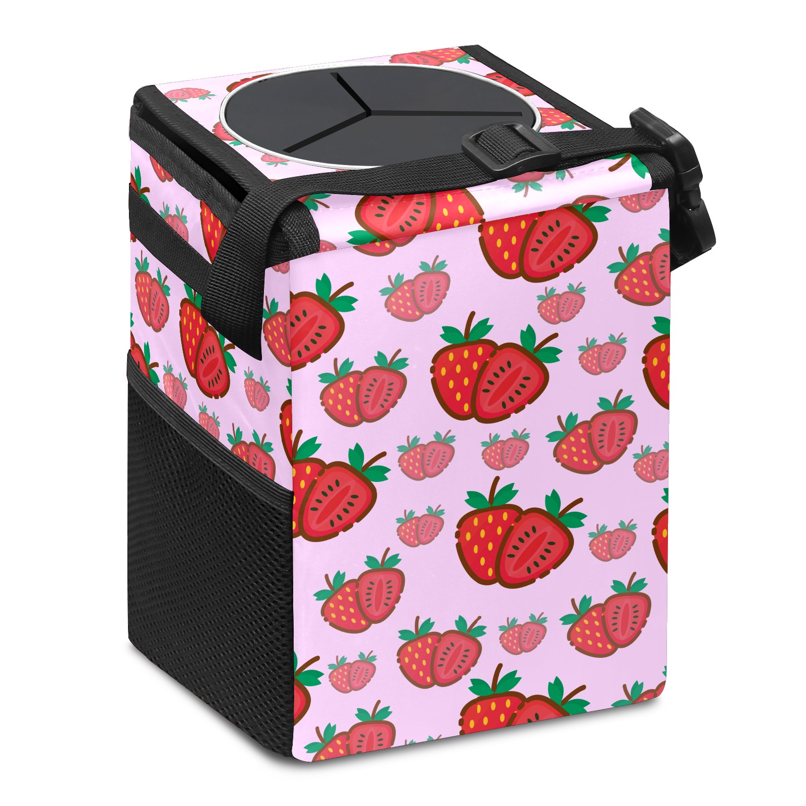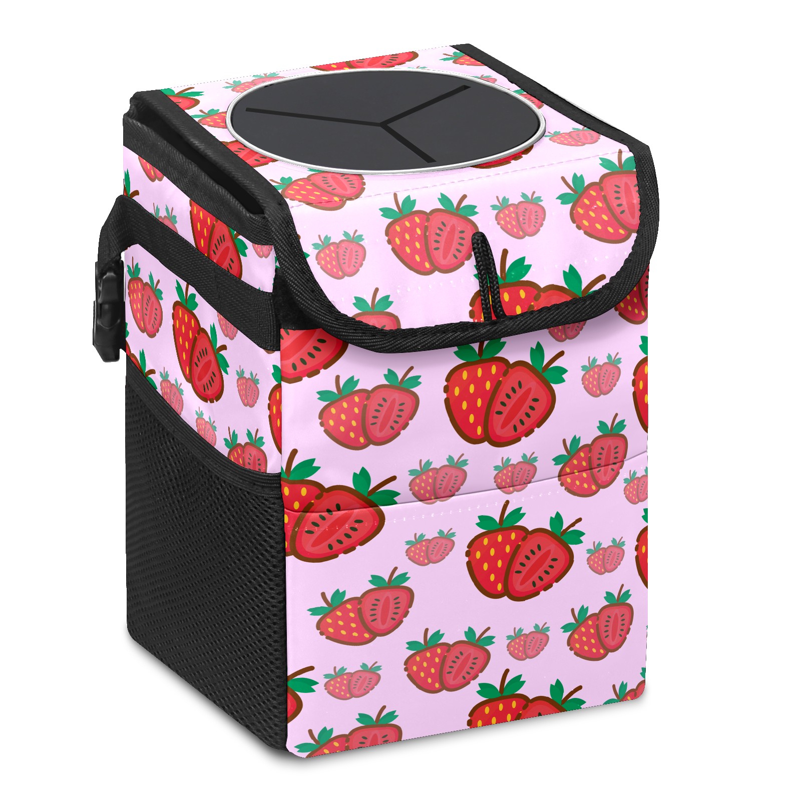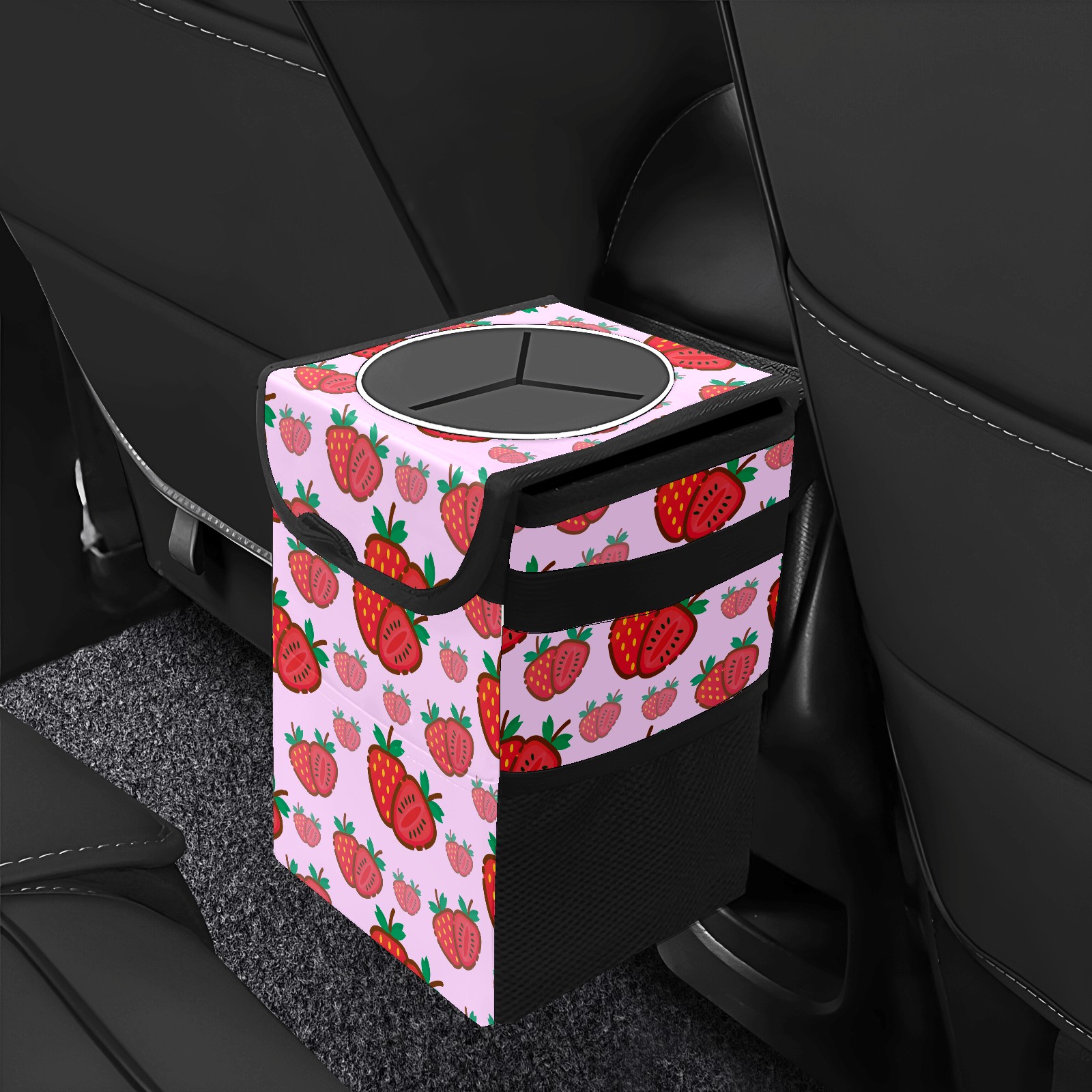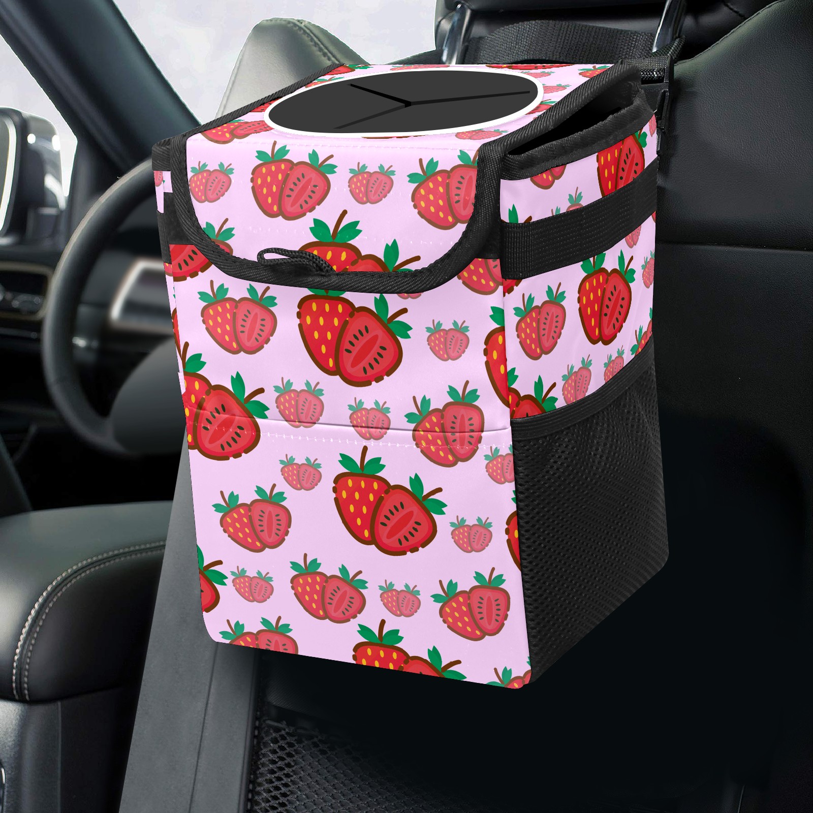 Car Trash Can Bin Fresh Strawberry Sweet Pink Hanging Trash Can for Cars SUV for Back Seat, Collapsible Leakproof Vehicle Garbage Container Bag with Lid Storage Pockets Car Accessories Cute