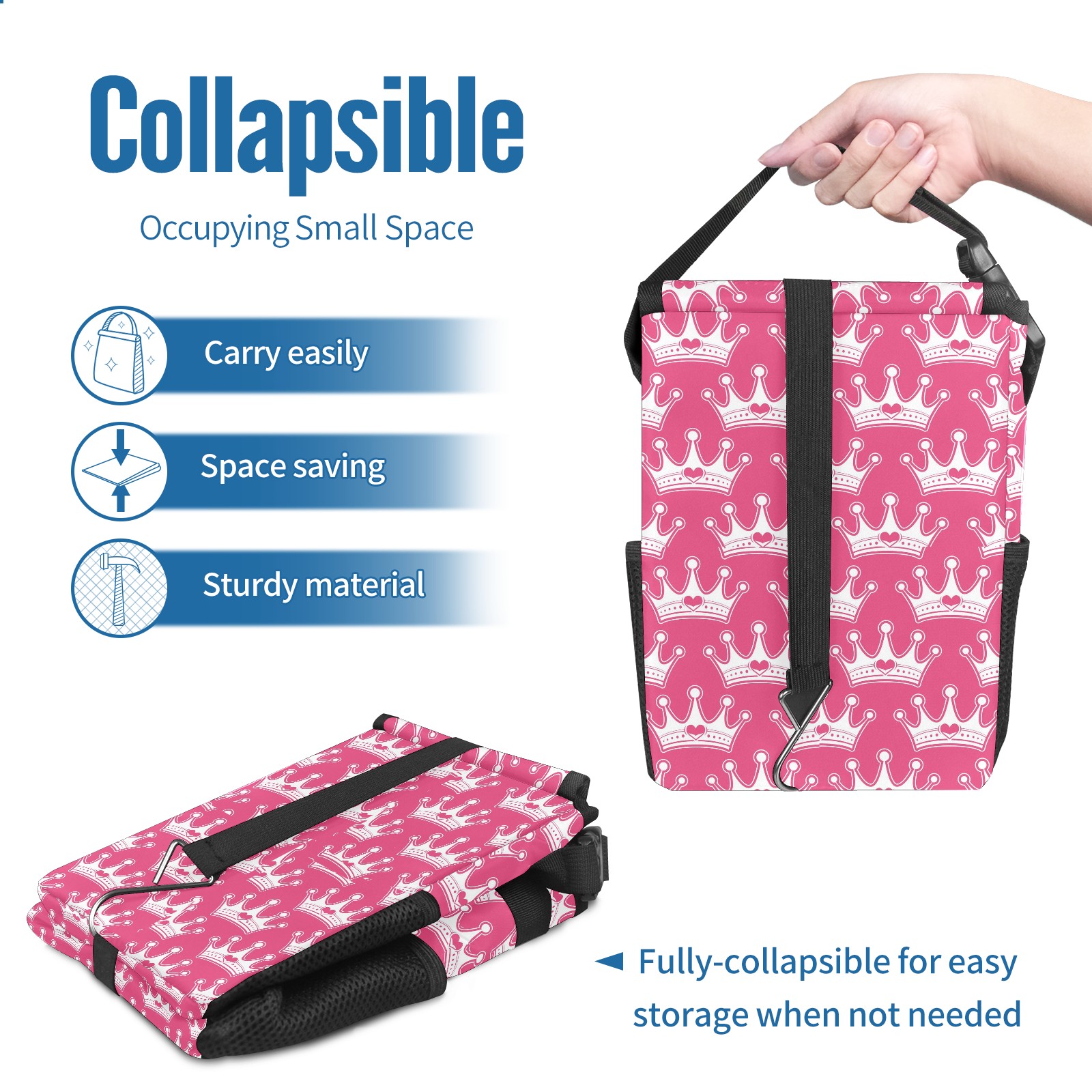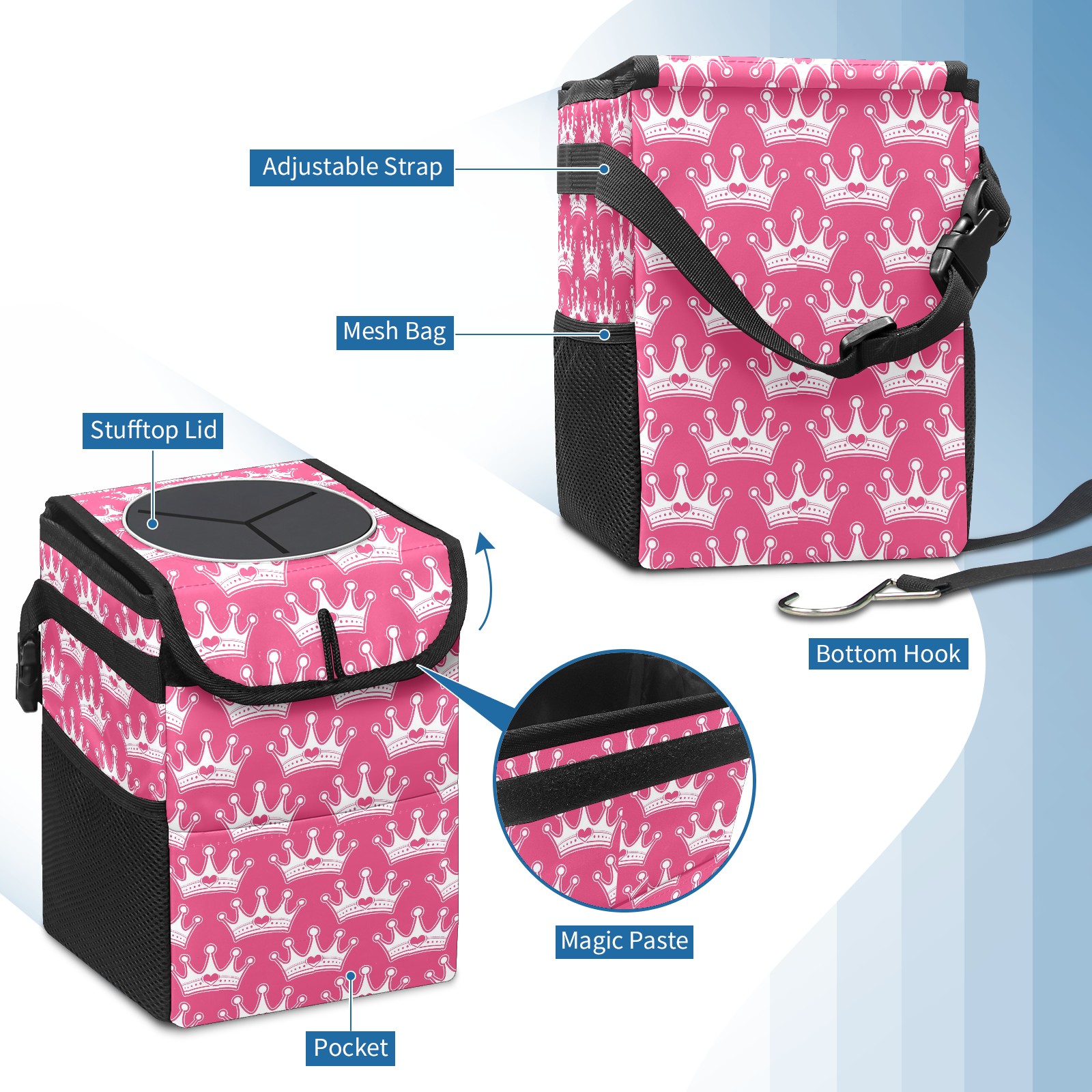 • <p><strong>Hanging Car Trash Can with Lid Leak-proof Waterproof Car Garbage Bin Collapsible Portable Car Storage Organizer with Mesh Pockets Large Capacity Trash Bag for Car SUV Trucks</strong></p><p><strong>Features :</strong></p><p><strong>LARGE CAPACITY</strong></p><p><strong>FOLDABLE AND LEAK-PROOF</strong></p><p><strong>EASY TO INSTALL</strong></p><p>- Size of our car garbage bag is 6.7x6.3x9.5&nbsp;inches.</p><p>- The material of trash can for car suv is premium polyester, waterproof and leak-proof, easy to clean and wash.</p><p>- Foldable design, when you're not using the car trash bag, you can fold it up and occupy less space.</p><p>- Our portable and collapsible car trash bag also a small car organizer can be used for storage small stuffs such as tissue, toys, bags, snacks, umbrella, etc.</p><p>- The car trash can is very easy to install, you can simply place it anywhere in your car like the gear shift, the console box, the ground of rear seat or hanging on the front seat back seat, the armrest box.</p><p>- The auto garbage box is&nbsp;ideal for many types of vehicles such as cars, trucks , SUVs, pickups, and van or boat and more.</p>