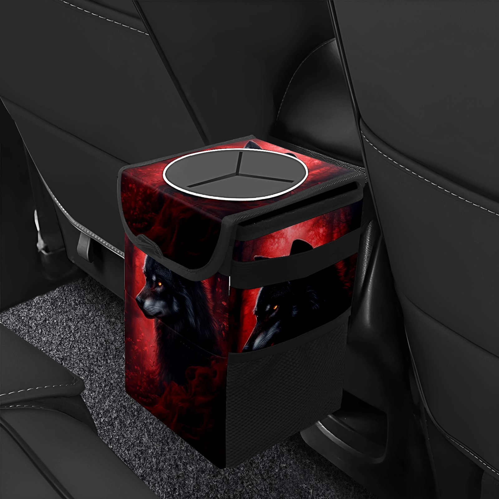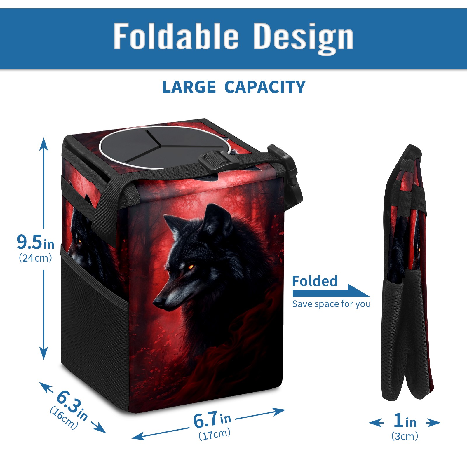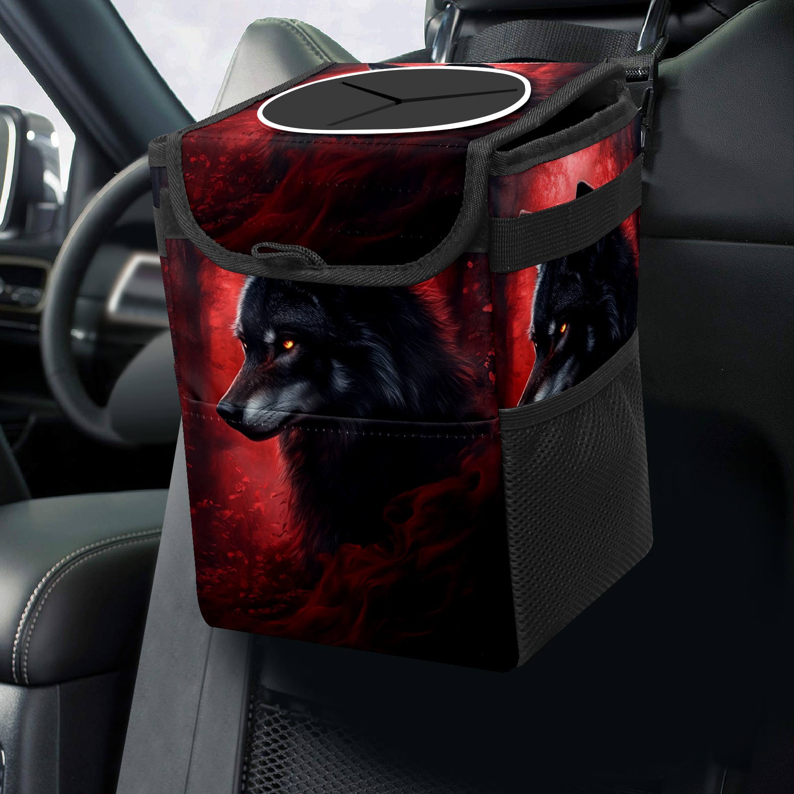 Car Trash Can Bin Black Wolf Hanging Trash Can for Cars SUV for Back Seat, Collapsible Leakproof Vehicle Garbage Container Bag with Lid Storage Pockets Car Accessories Cute