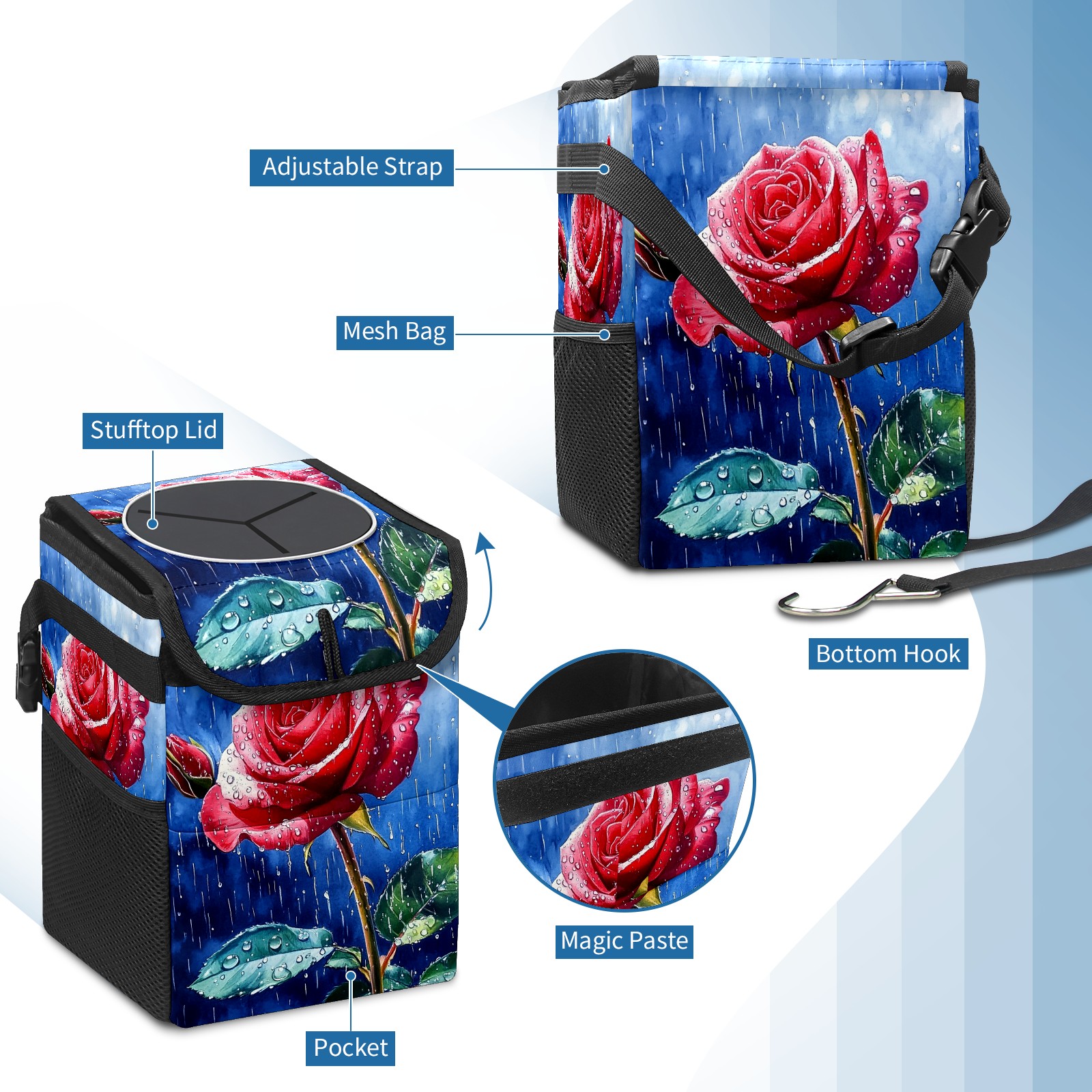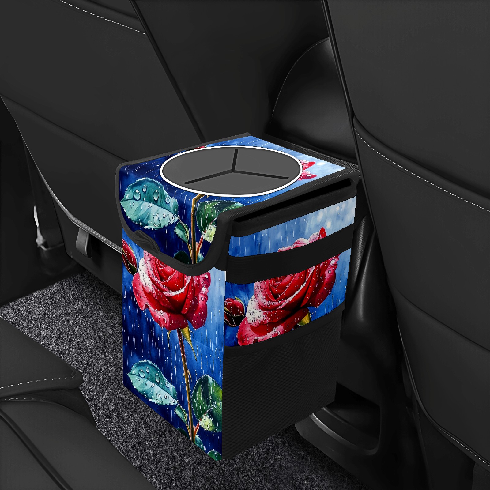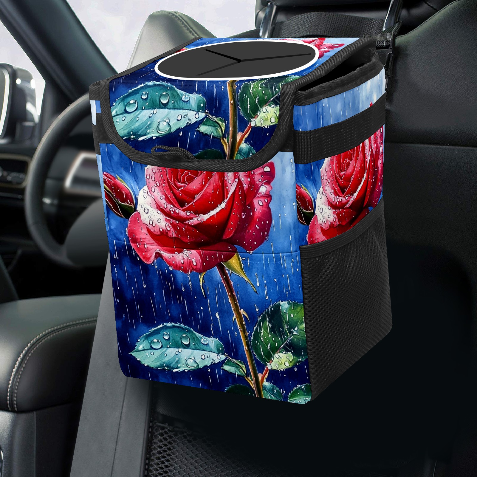 Car Trash Can Bin Red Rose Hanging Trash Can for Cars SUV for Back Seat, Collapsible Leakproof Vehicle Garbage Container Bag with Lid Storage Pockets Car Accessories Cute