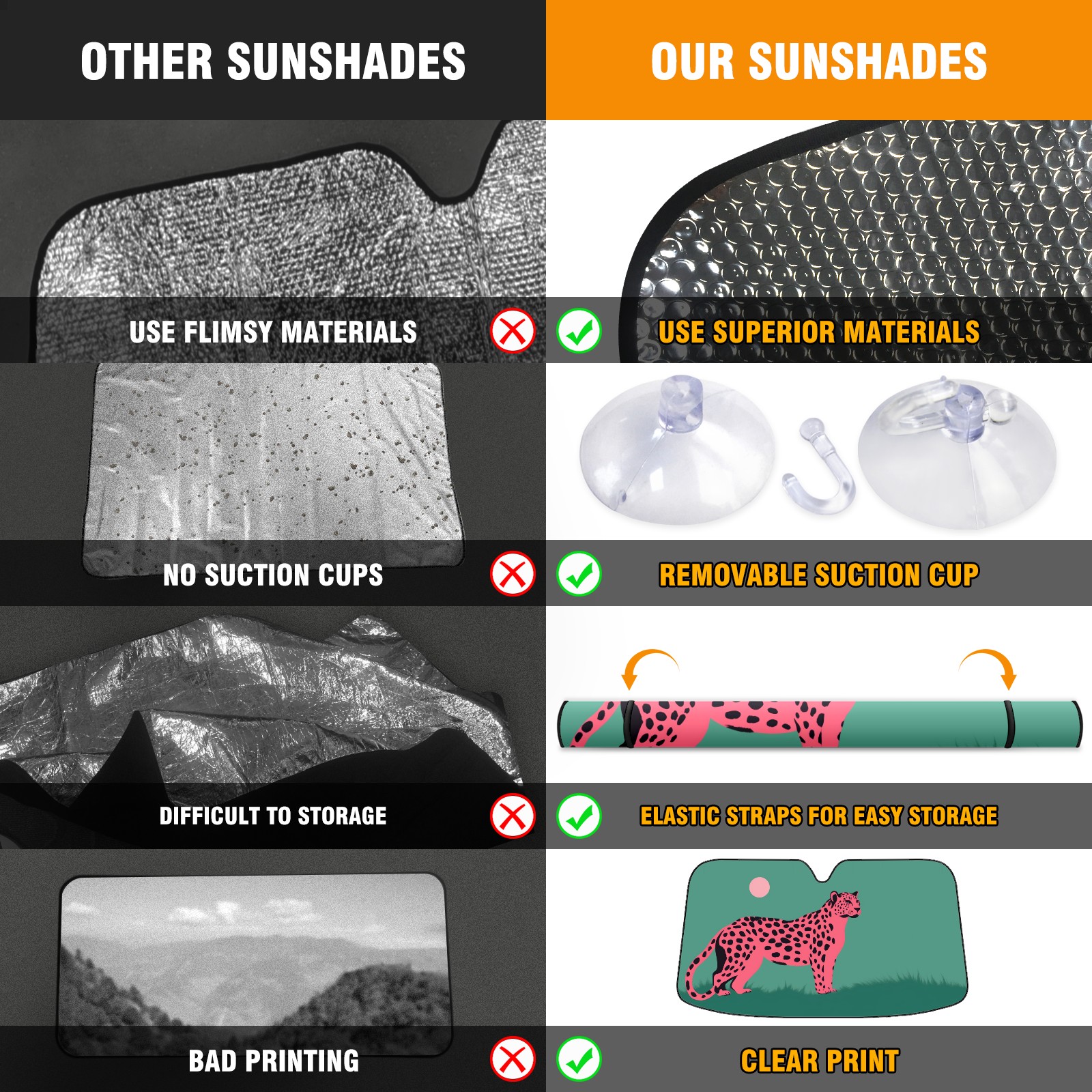 • <p><b>Foldable Premium Car Windshield Sunshade is your great solution to reduce your car’s interior temperature dramatically! This is definitely a must-have item for your summer travel!</b></p><p><b>【Precision Fit, Stylish Protection】</b></p><p>55"x30" (140x76cm) universal size with 3cm flexible margins fits curved windshields of most sedans/SUVs.</p><p><b>【Blocking Uv Rays &amp; Heat Insulation】</b></p><p>Our vehicle sunshade provides effective UV, sun, and summer heat protection, preventing leather fading and plastic cracking to keep your car interior pristine.</p><p><b>【Zero-Mark Installation &amp; Space-Saving】</b></p><p>Equipped with dual scratch-free silicone suction cups + adjustable straps: Medical-grade silicone cups hold firmly yet remove cleanly. Folds to A3 size (42x30cm x &lt;2cm thick), tucks discreetly into glove compartments or door pockets.&nbsp;</p>