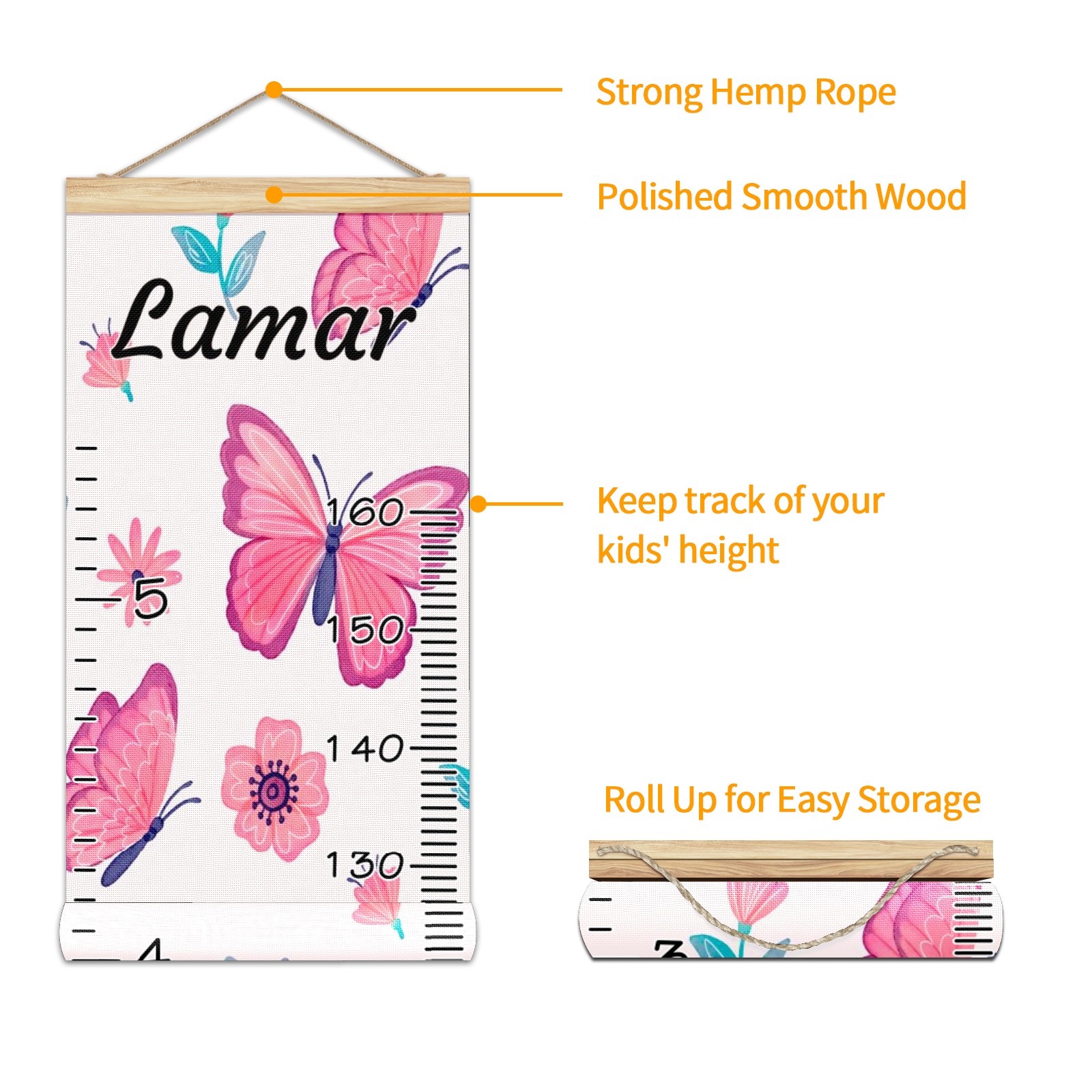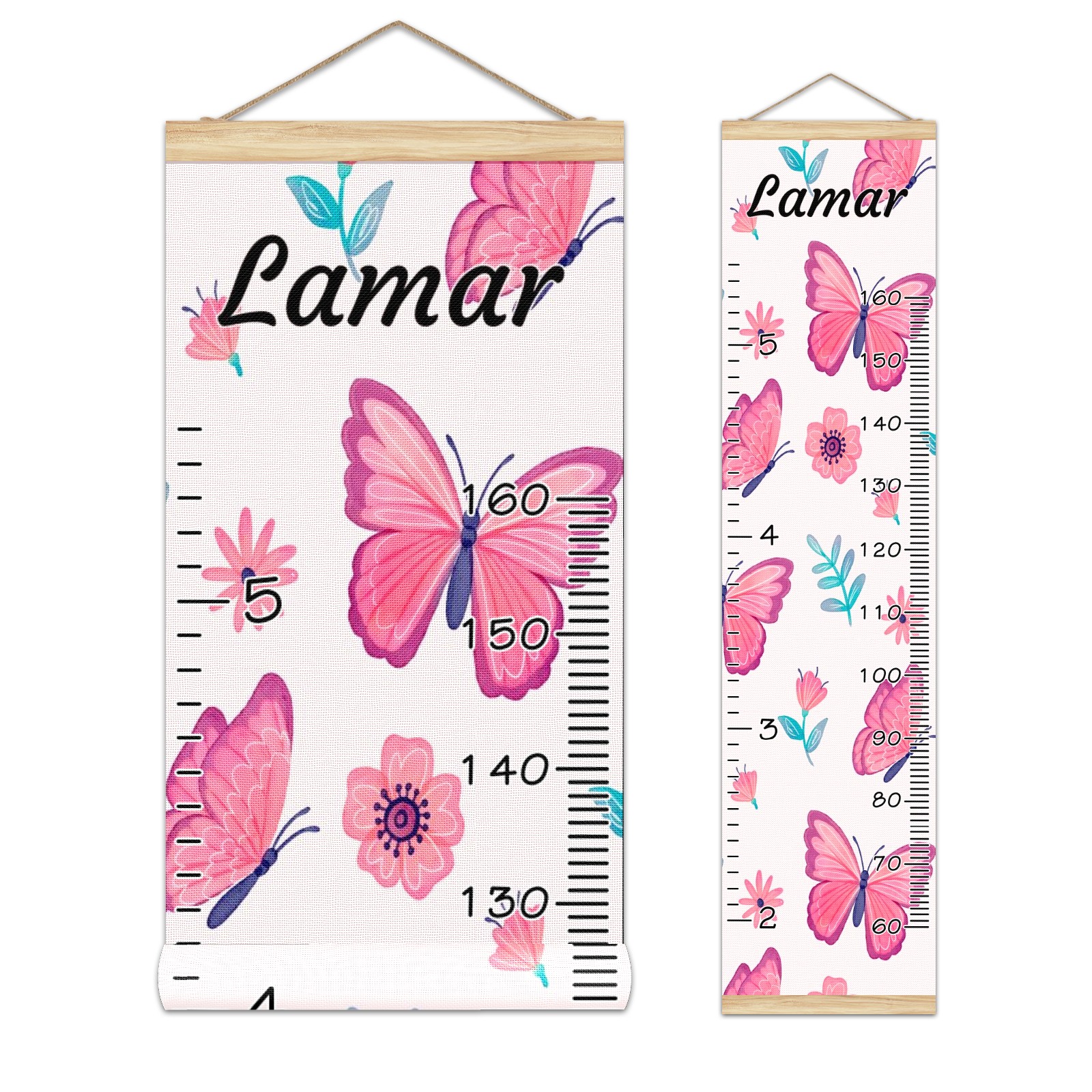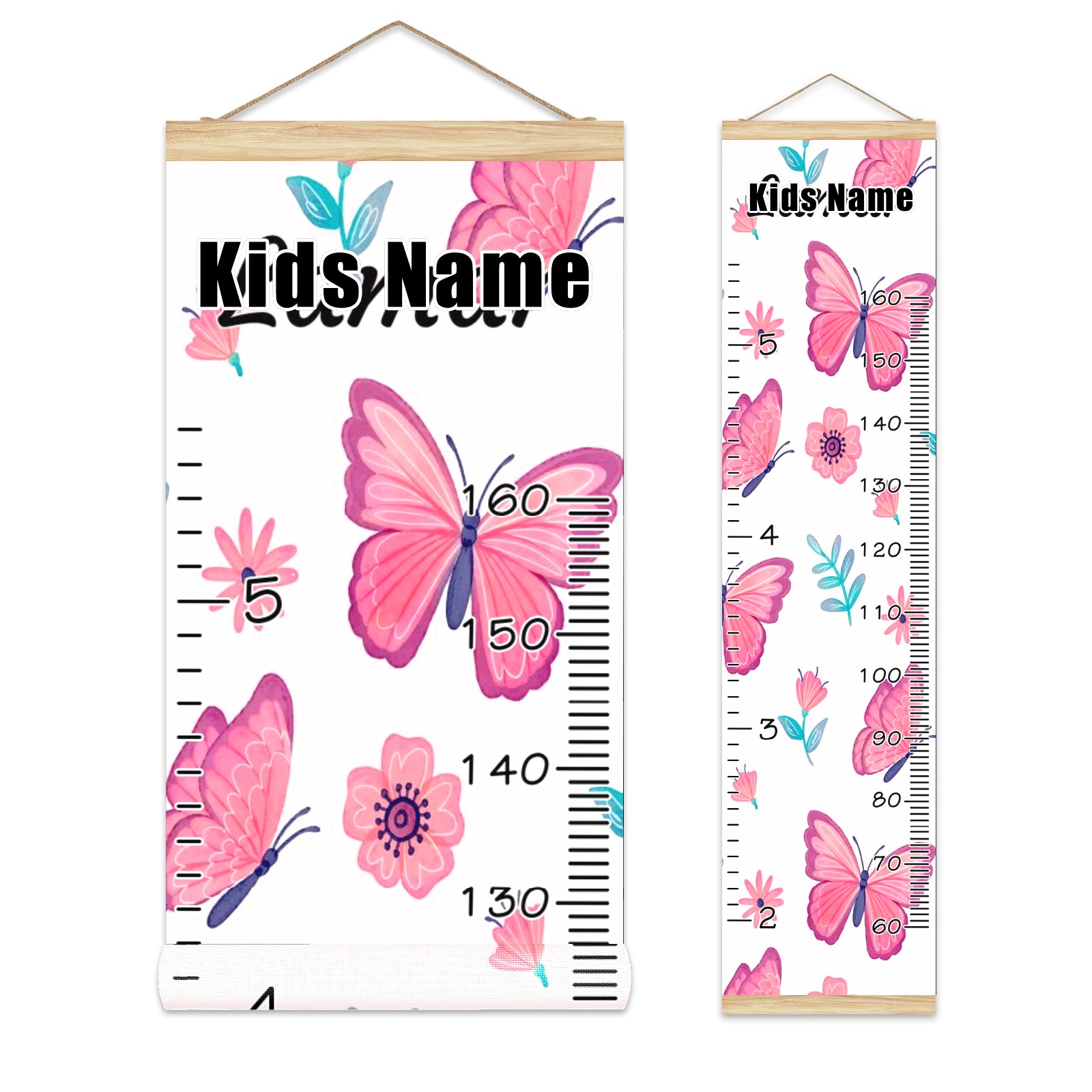 Personalized Kids Name Growth Chart Ruler for Wall Wood Frame Canvas Height Measure Chart 13.4x56 in Hanging Growth Chart Pink Butterfly & Flower3.26 Boys Girls Room Decor