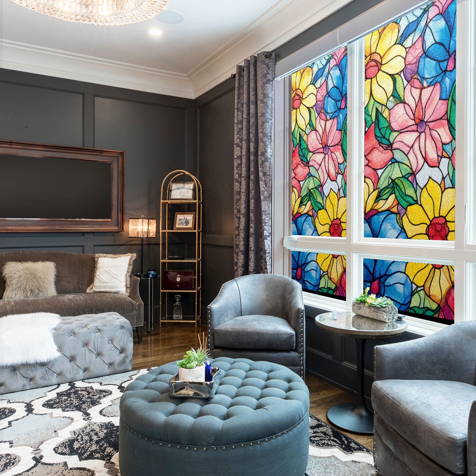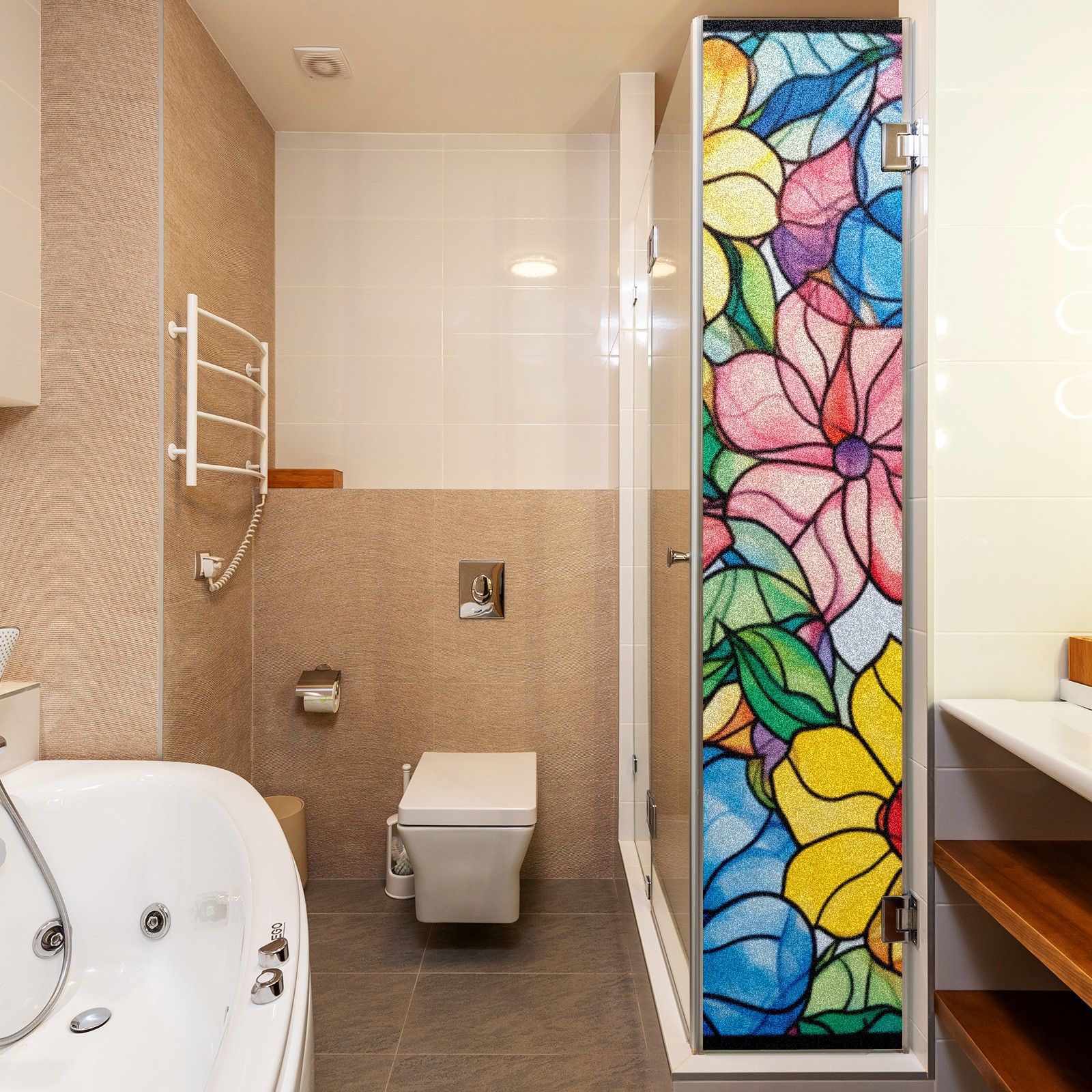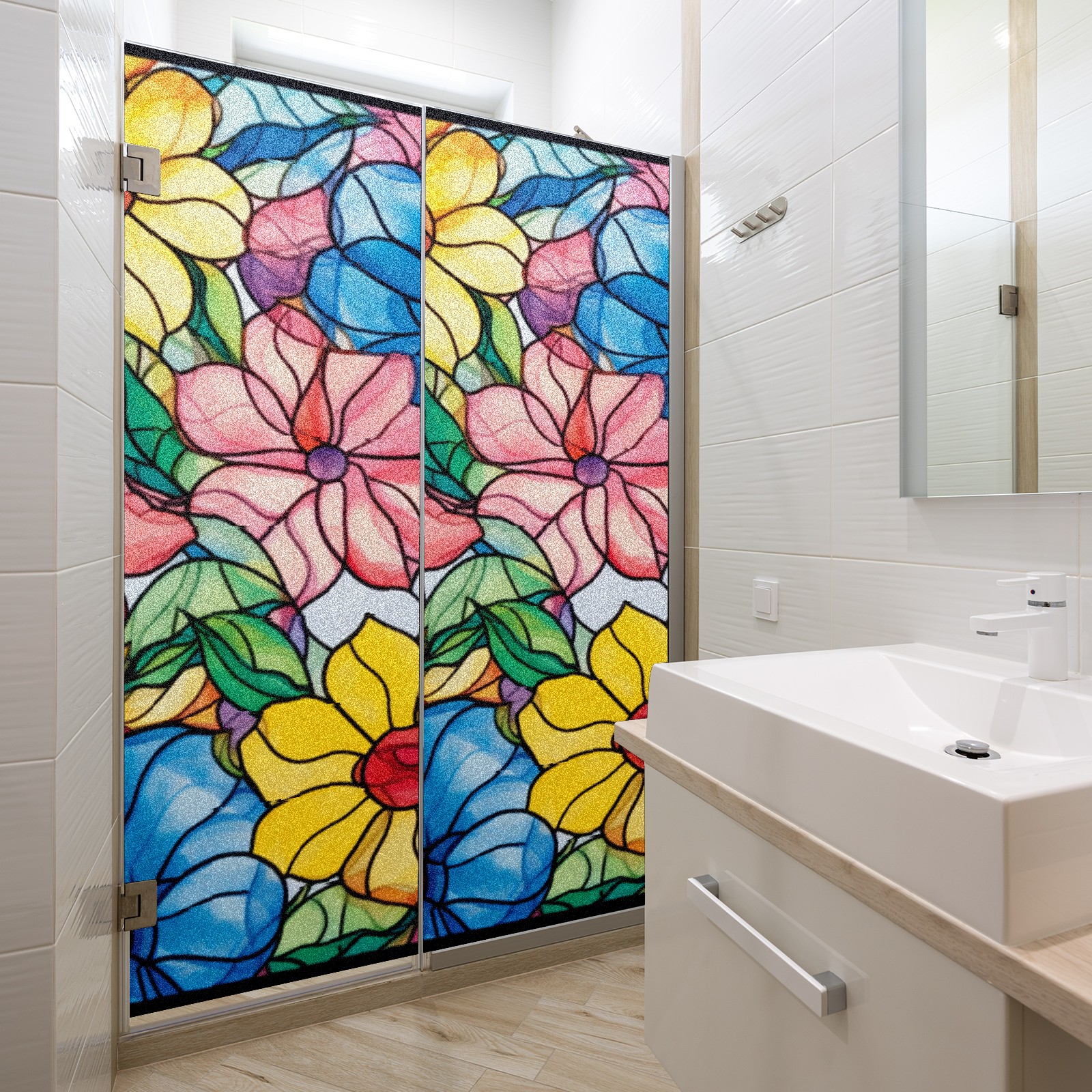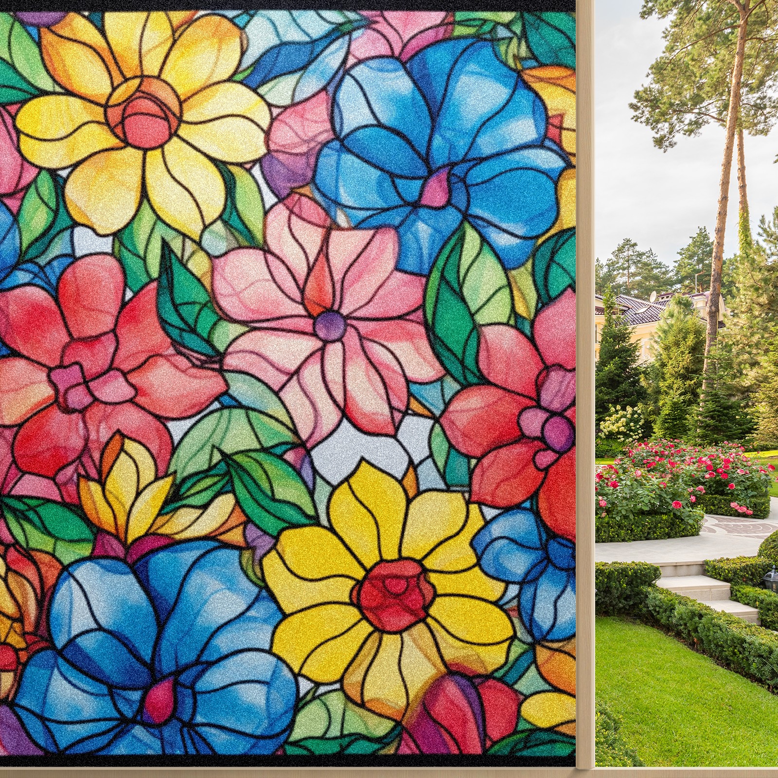 Window Privacy Film Frosted Stained Glass Film Decorative Static Cling for Bathroom Home Office Peel and Stick Window Film Colorful Flowers(17.7x23.6in)
