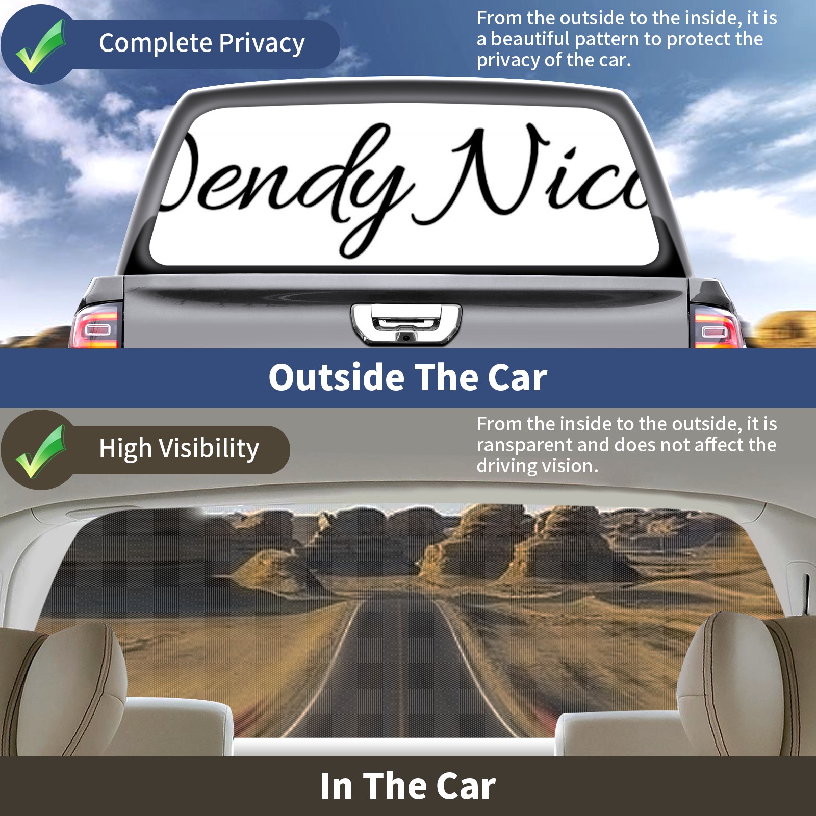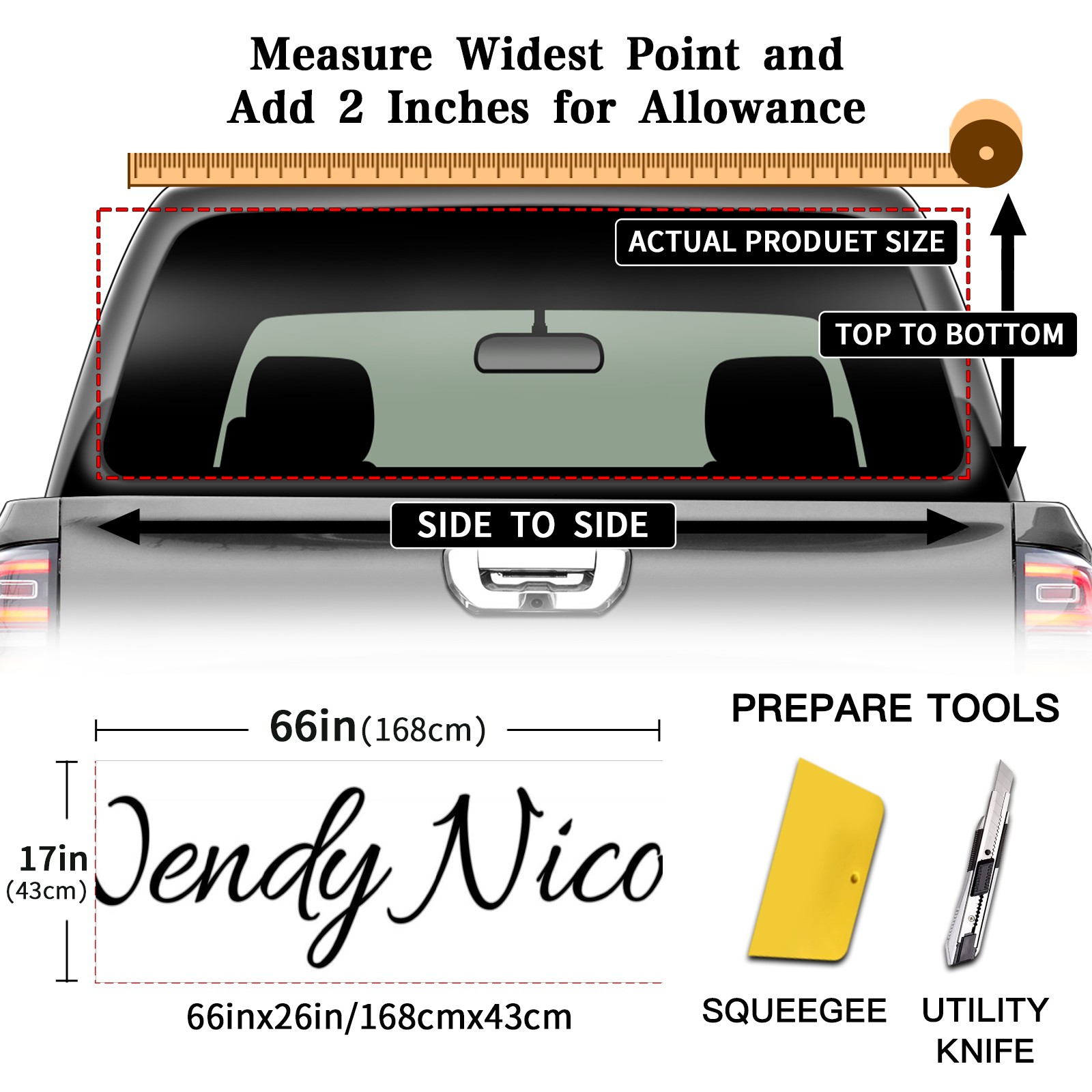 <p><strong>Truck Rear Window Graphics Decals Pickup Trucks Back Window Film Stickers 66" x 22" Perforated Vinyl Wrap Stickers Decorations for Car Rear Window</strong></p><p><strong><br /></strong></p><p><strong>Features :</strong></p><p>- Size of the rear window decals for trucks is 66x22 Inches (168x56cm).</p><p>- High quality perforated vinyl window film, one way vision sticker.</p><p>- Perforated is see through from the inside but not from outside.</p><p>- Clear printing, waterproof and durable.</p><p>- The car back window graphics stickers fits most truck and makes your vehicle more beautiful.&nbsp;</p><p><br /></p><p><strong>【Installation Instructions】</strong></p><p><strong>1. CLEAN SURFACE -</strong> Clean the rear window thoroughly and make sure the surface clean.</p><p><strong>2. STICK THE DECALS -</strong> Tear off the paper on the back and stick the decal on the window.</p><p><strong>3. SCRAPE OFF AIR BUBBLES -</strong> Use a squeegee or other card to scrape off the excess air bubbles.</p><p><strong>4. TRIM THE EXCESS -</strong> Use a knife to cut off the excess stickers of the window, finally complete.</p><p><br /></p><p>1. Please measure the size before purchasing, back window graphics decal for truck can be cut to your desired size.</p><p>2.The graphics stickers for truck back window is a great gift for yourself also can as a birthday / halloween / christmas gift for your friends and family.</p>