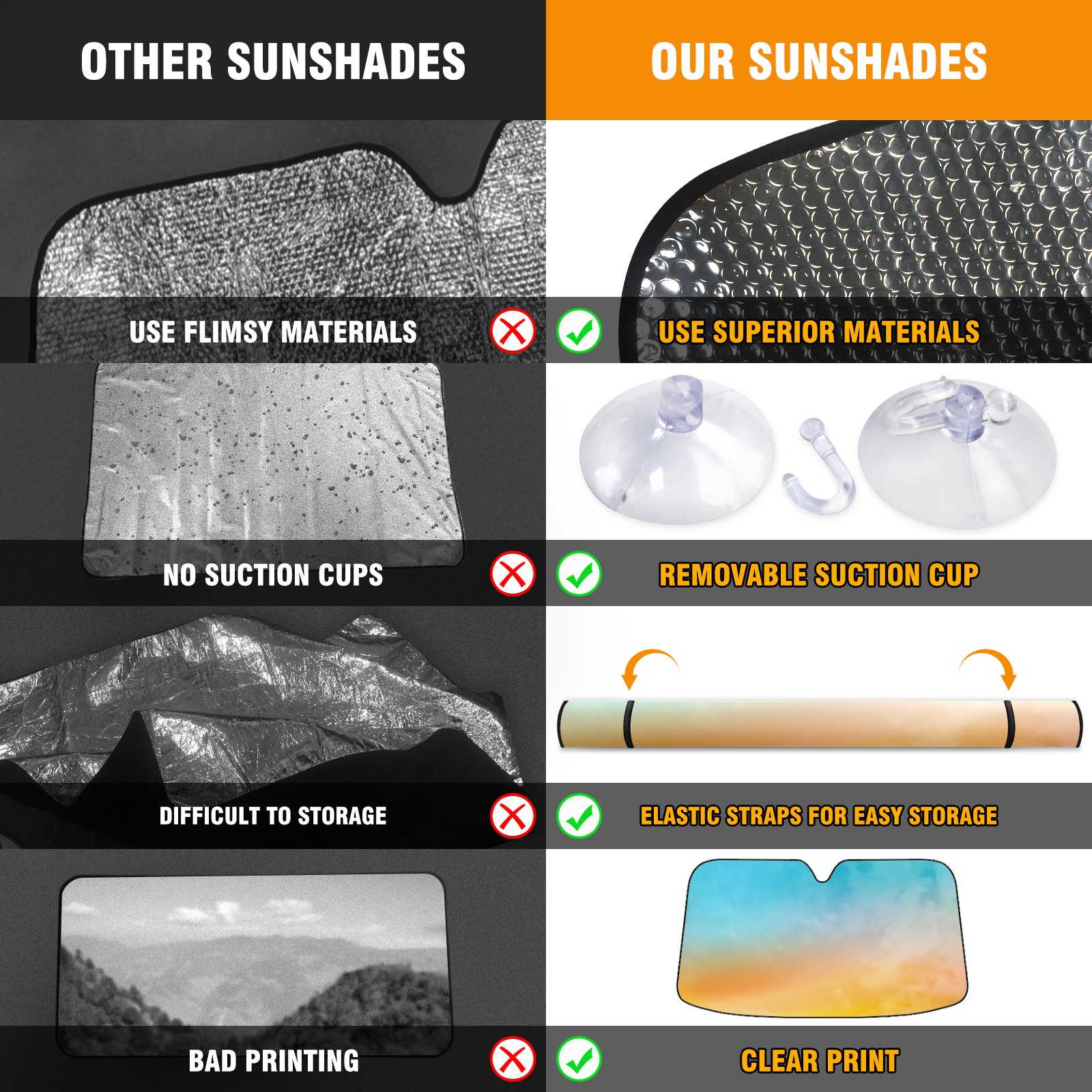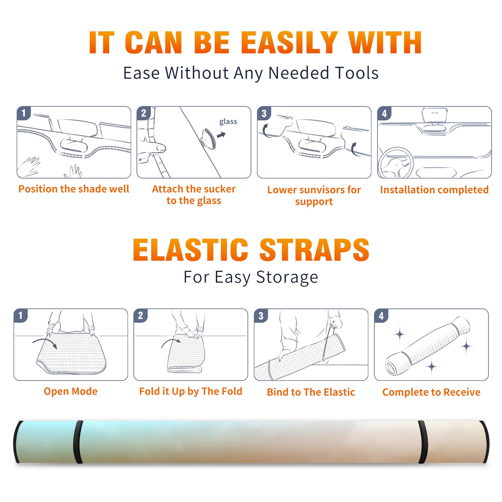 • <p><b>Foldable Premium Car Windshield Sunshade is your great solution to reduce your car’s interior temperature dramatically! This is definitely a must-have item for your summer travel!</b></p><p><b>【Precision Fit, Stylish Protection】</b></p><p>55"x30" (140x76cm) universal size with 3cm flexible margins fits curved windshields of most sedans/SUVs.</p><p><b>【Blocking Uv Rays &amp; Heat Insulation】</b></p><p>Our vehicle sunshade provides effective UV, sun, and summer heat protection, preventing leather fading and plastic cracking to keep your car interior pristine.</p><p><b>【Zero-Mark Installation &amp; Space-Saving】</b></p><p>Equipped with dual scratch-free silicone suction cups + adjustable straps: Medical-grade silicone cups hold firmly yet remove cleanly. Folds to A3 size (42x30cm x &lt;2cm thick), tucks discreetly into glove compartments or door pockets.&nbsp;</p>