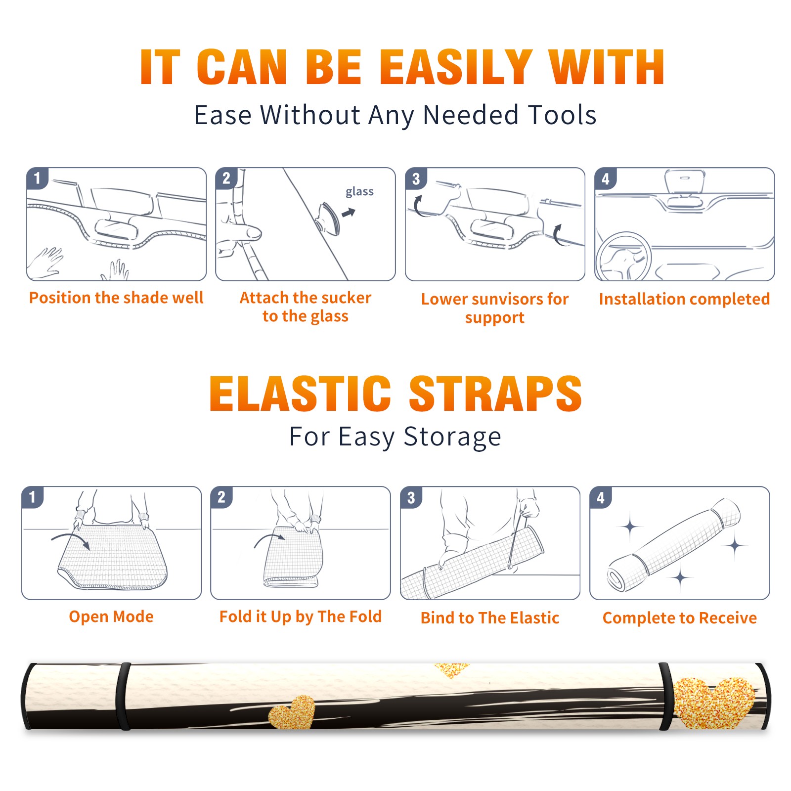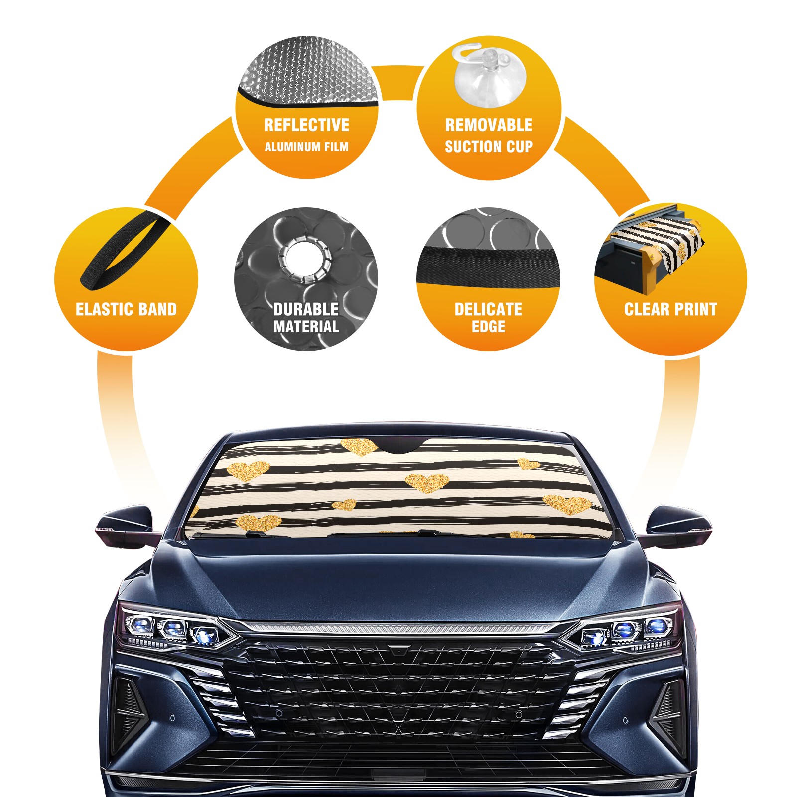 • <p><b>Foldable Premium Car Windshield Sunshade is your great solution to reduce your car’s interior temperature dramatically! This is definitely a must-have item for your summer travel!</b></p><p><b>【Precision Fit, Stylish Protection】</b></p><p>55"x30" (140x76cm) universal size with 3cm flexible margins fits curved windshields of most sedans/SUVs.</p><p><b>【Blocking Uv Rays &amp; Heat Insulation】</b></p><p>Our vehicle sunshade provides effective UV, sun, and summer heat protection, preventing leather fading and plastic cracking to keep your car interior pristine.</p><p><b>【Zero-Mark Installation &amp; Space-Saving】</b></p><p>Equipped with dual scratch-free silicone suction cups + adjustable straps: Medical-grade silicone cups hold firmly yet remove cleanly. Folds to A3 size (42x30cm x &lt;2cm thick), tucks discreetly into glove compartments or door pockets.&nbsp;</p>