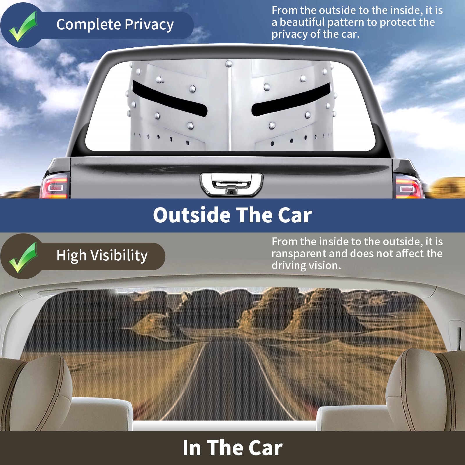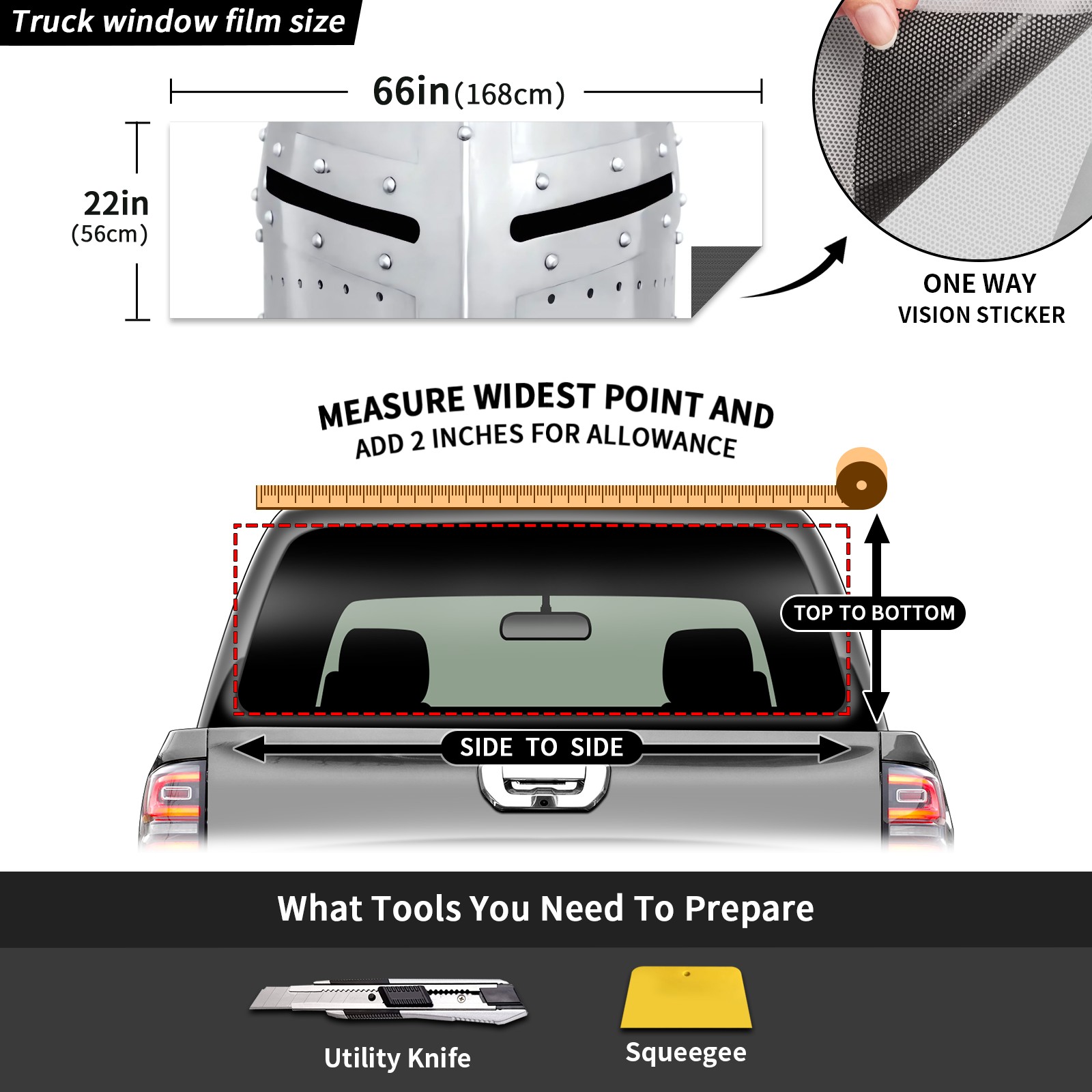 <p><strong>Truck Rear Window Graphics Decals Pickup Trucks Back Window Film Stickers 66" x 22" Perforated Vinyl Wrap Stickers Decorations for Car Rear Window</strong></p><p><strong><br /></strong></p><p><strong>Features :</strong></p><p>- Size of the rear window decals for trucks is 66x22 Inches (168x56cm).</p><p>- High quality perforated vinyl window film, one way vision sticker.</p><p>- Perforated is see through from the inside but not from outside.</p><p>- Clear printing, waterproof and durable.</p><p>- The car back window graphics stickers fits most truck and makes your vehicle more beautiful. </p><p><br /></p><p><strong>【Installation Instructions】</strong></p><p><strong>1. CLEAN SURFACE -</strong> Clean the rear window thoroughly and make sure the surface clean.</p><p><strong>2. STICK THE DECALS -</strong> Tear off the paper on the back and stick the decal on the window.</p><p><strong>3. SCRAPE OFF AIR BUBBLES -</strong> Use a squeegee or other card to scrape off the excess air bubbles.</p><p><strong>4. TRIM THE EXCESS -</strong> Use a knife to cut off the excess stickers of the window, finally complete.</p><p><br /></p><p>1. Please measure the size before purchasing, back window graphics decal for truck can be cut to your desired size.</p><p>2.The graphics stickers for truck back window is a great gift for yourself also can as a birthday / halloween / christmas gift for your friends and family.</p>