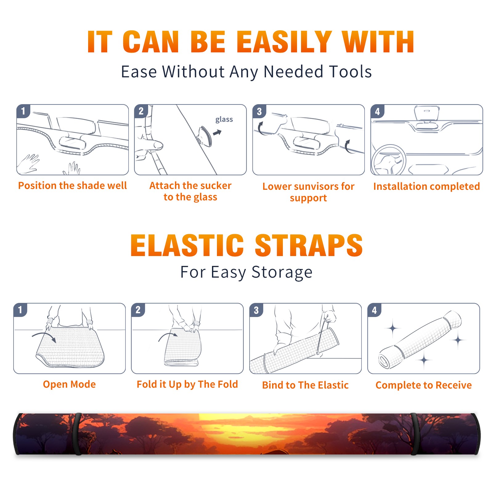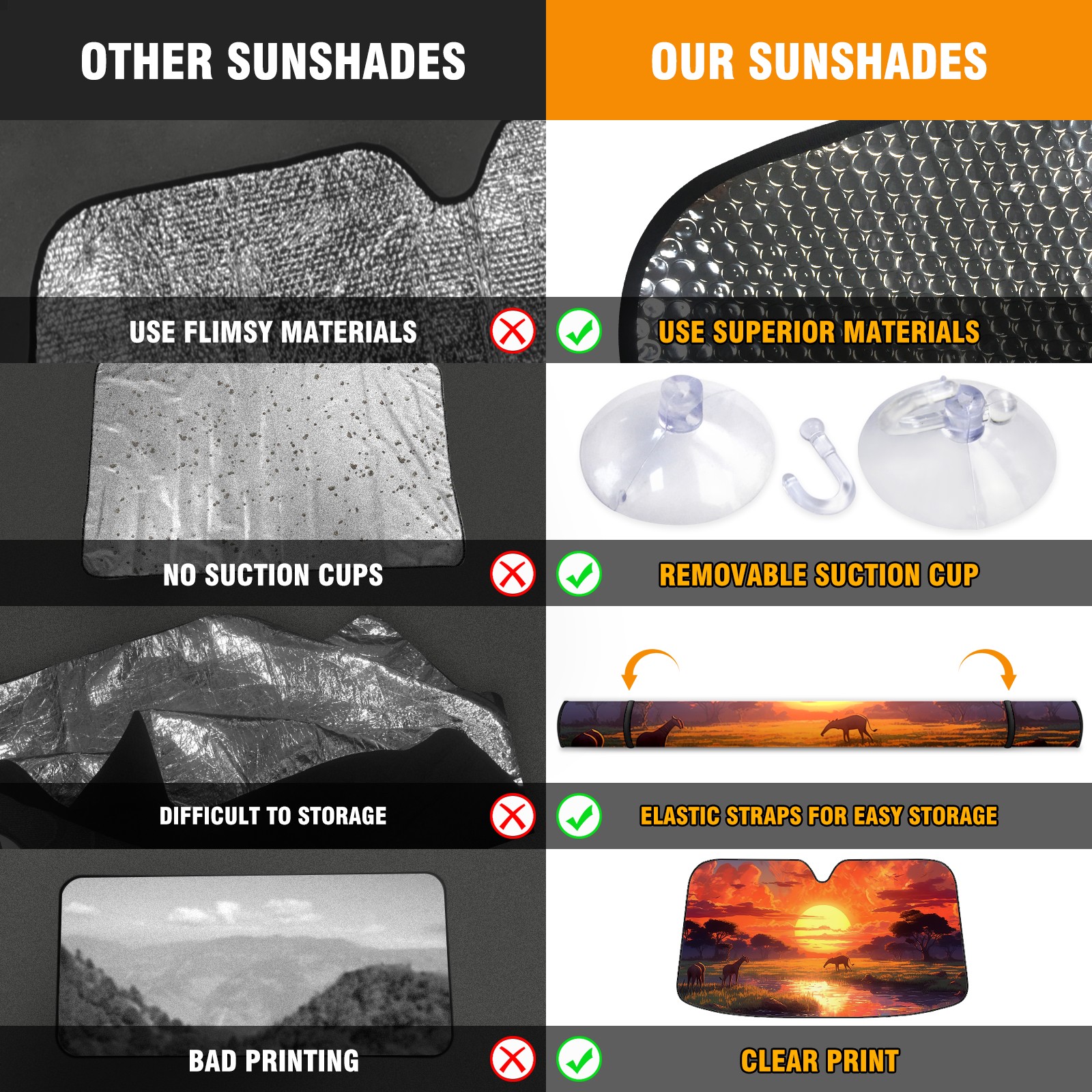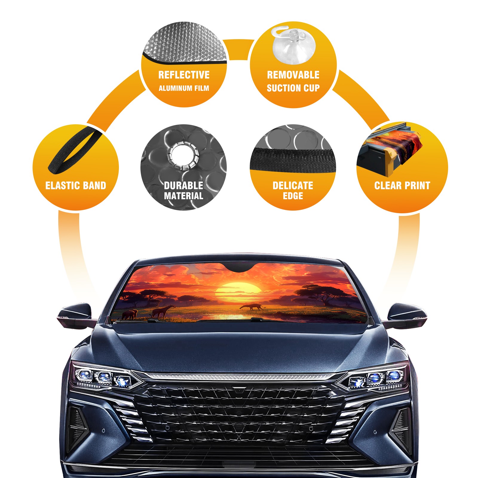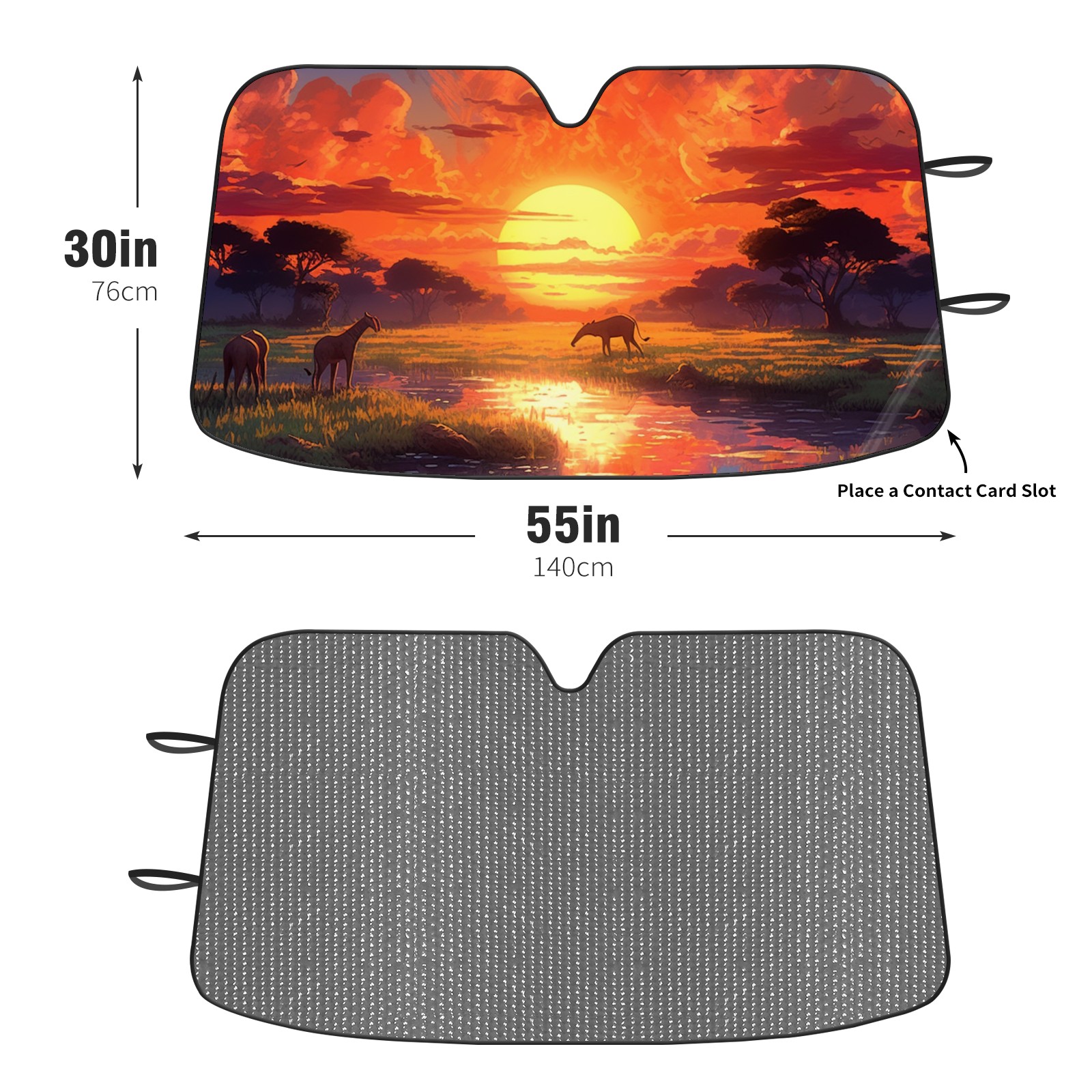<p><b>Foldable Premium Car Windshield Sunshade is your great solution to reduce your car’s interior temperature dramatically! This is definitely a must-have item for your summer travel!</b></p><p><b>【Precision Fit, Stylish Protection】</b></p><p>55"x30" (140x76cm) universal size with 3cm flexible margins fits curved windshields of most sedans/SUVs.</p><p><b>【Blocking Uv Rays &amp; Heat Insulation】</b></p><p>Our vehicle sunshade provides effective UV, sun, and summer heat protection, preventing leather fading and plastic cracking to keep your car interior pristine.</p><p><b>【Zero-Mark Installation &amp; Space-Saving】</b></p><p>Equipped with dual scratch-free silicone suction cups + adjustable straps: Medical-grade silicone cups hold firmly yet remove cleanly. Folds to A3 size (42x30cm x &lt;2cm thick), tucks discreetly into glove compartments or door pockets.&nbsp;</p>