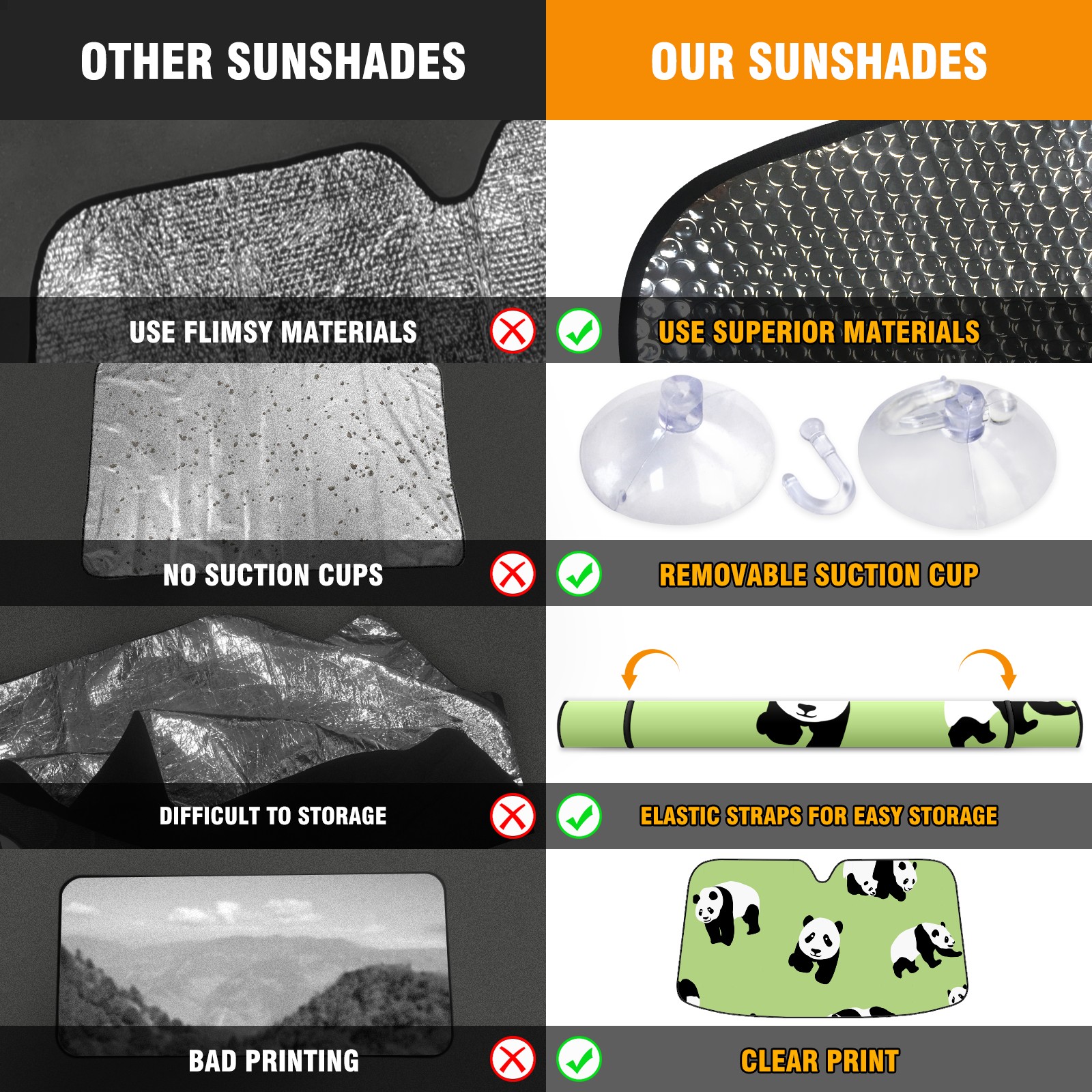 • <p><b>Foldable Premium Car Windshield Sunshade is your great solution to reduce your car’s interior temperature dramatically! This is definitely a must-have item for your summer travel!</b></p><p><b>【Precision Fit, Stylish Protection】</b></p><p>55"x30" (140x76cm) universal size with 3cm flexible margins fits curved windshields of most sedans/SUVs.</p><p><b>【Blocking Uv Rays &amp; Heat Insulation】</b></p><p>Our vehicle sunshade provides effective UV, sun, and summer heat protection, preventing leather fading and plastic cracking to keep your car interior pristine.</p><p><b>【Zero-Mark Installation &amp; Space-Saving】</b></p><p>Equipped with dual scratch-free silicone suction cups + adjustable straps: Medical-grade silicone cups hold firmly yet remove cleanly. Folds to A3 size (42x30cm x &lt;2cm thick), tucks discreetly into glove compartments or door pockets.&nbsp;</p>