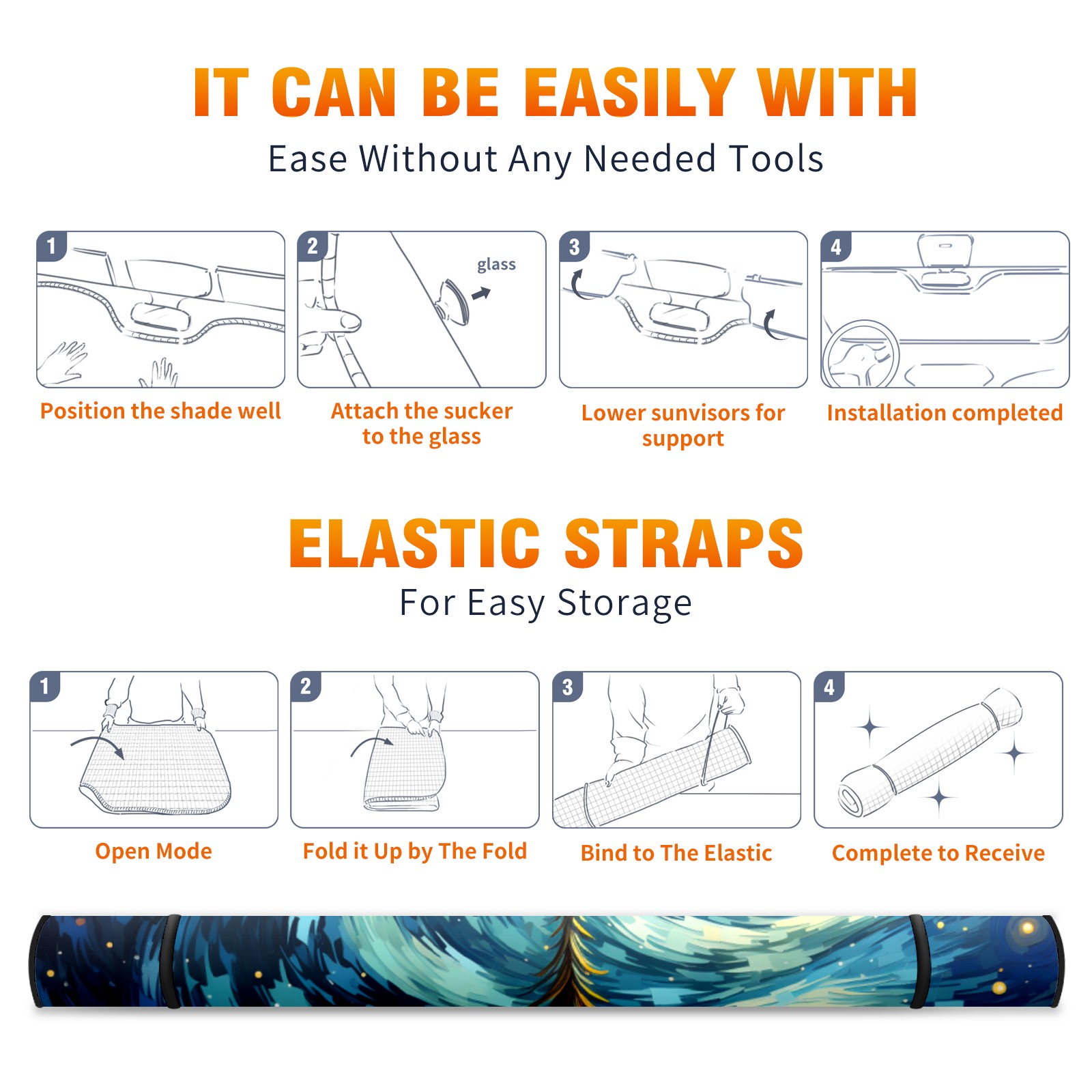 <p><b>Foldable Premium Car Windshield Sunshade is your great solution to reduce your car’s interior temperature dramatically! This is definitely a must-have item for your summer travel!</b></p><p><b>【Precision Fit, Stylish Protection】</b></p><p>55"x30" (140x76cm) universal size with 3cm flexible margins fits curved windshields of most sedans/SUVs.</p><p><b>【Blocking Uv Rays &amp; Heat Insulation】</b></p><p>Our vehicle sunshade provides effective UV, sun, and summer heat protection, preventing leather fading and plastic cracking to keep your car interior pristine.</p><p><b>【Zero-Mark Installation &amp; Space-Saving】</b></p><p>Equipped with dual scratch-free silicone suction cups + adjustable straps: Medical-grade silicone cups hold firmly yet remove cleanly. Folds to A3 size (42x30cm x &lt;2cm thick), tucks discreetly into glove compartments or door pockets.&nbsp;</p>