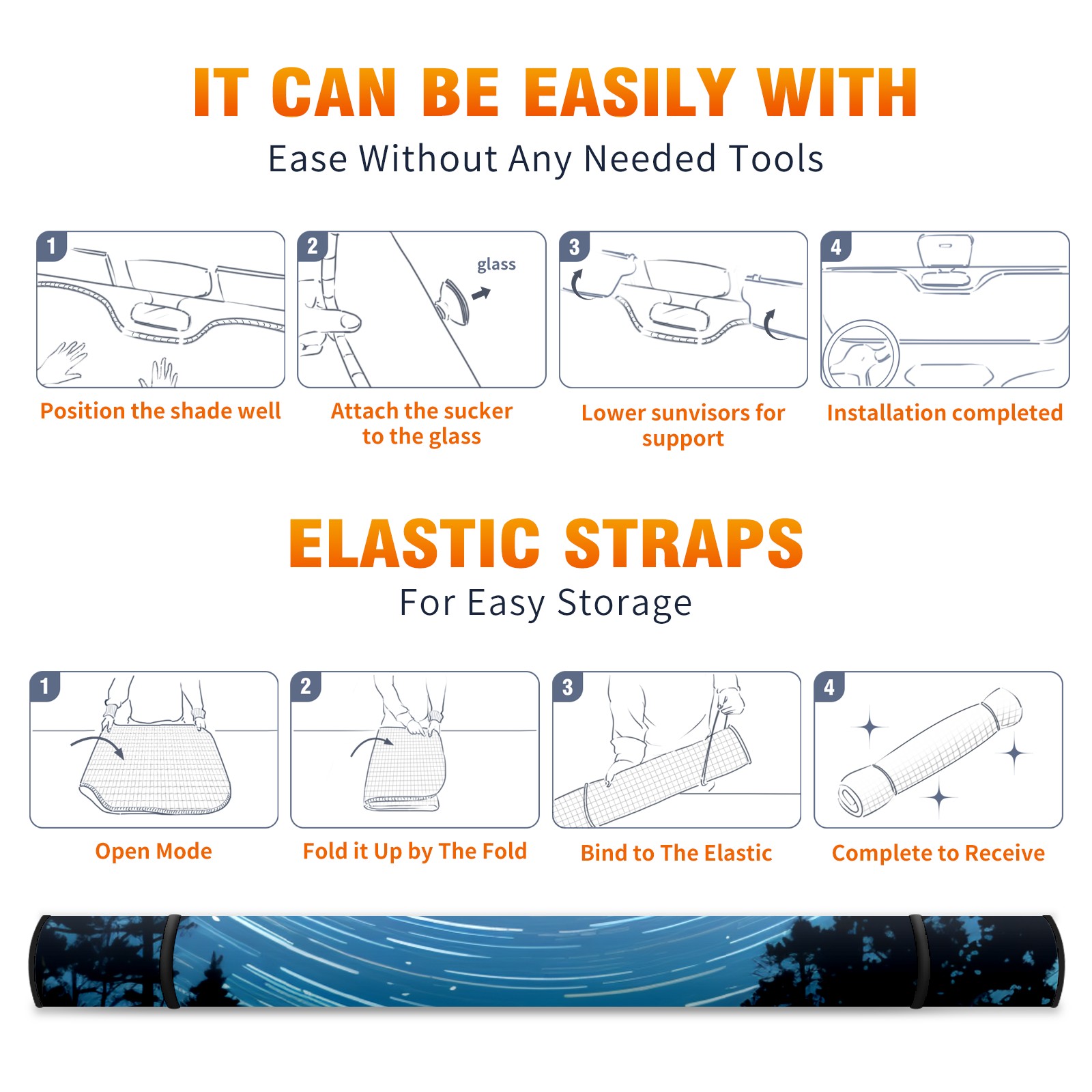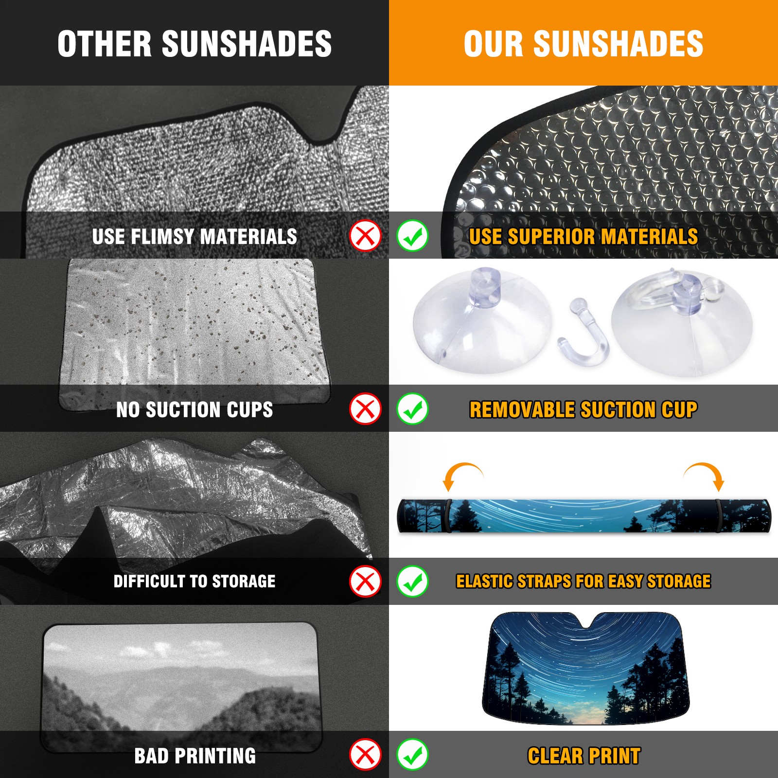 • <p><b>Foldable Premium Car Windshield Sunshade is your great solution to reduce your car’s interior temperature dramatically! This is definitely a must-have item for your summer travel!</b></p><p><b>【Precision Fit, Stylish Protection】</b></p><p>55"x30" (140x76cm) universal size with 3cm flexible margins fits curved windshields of most sedans/SUVs.</p><p><b>【Blocking Uv Rays &amp; Heat Insulation】</b></p><p>Our vehicle sunshade provides effective UV, sun, and summer heat protection, preventing leather fading and plastic cracking to keep your car interior pristine.</p><p><b>【Zero-Mark Installation &amp; Space-Saving】</b></p><p>Equipped with dual scratch-free silicone suction cups + adjustable straps: Medical-grade silicone cups hold firmly yet remove cleanly. Folds to A3 size (42x30cm x &lt;2cm thick), tucks discreetly into glove compartments or door pockets.&nbsp;</p>