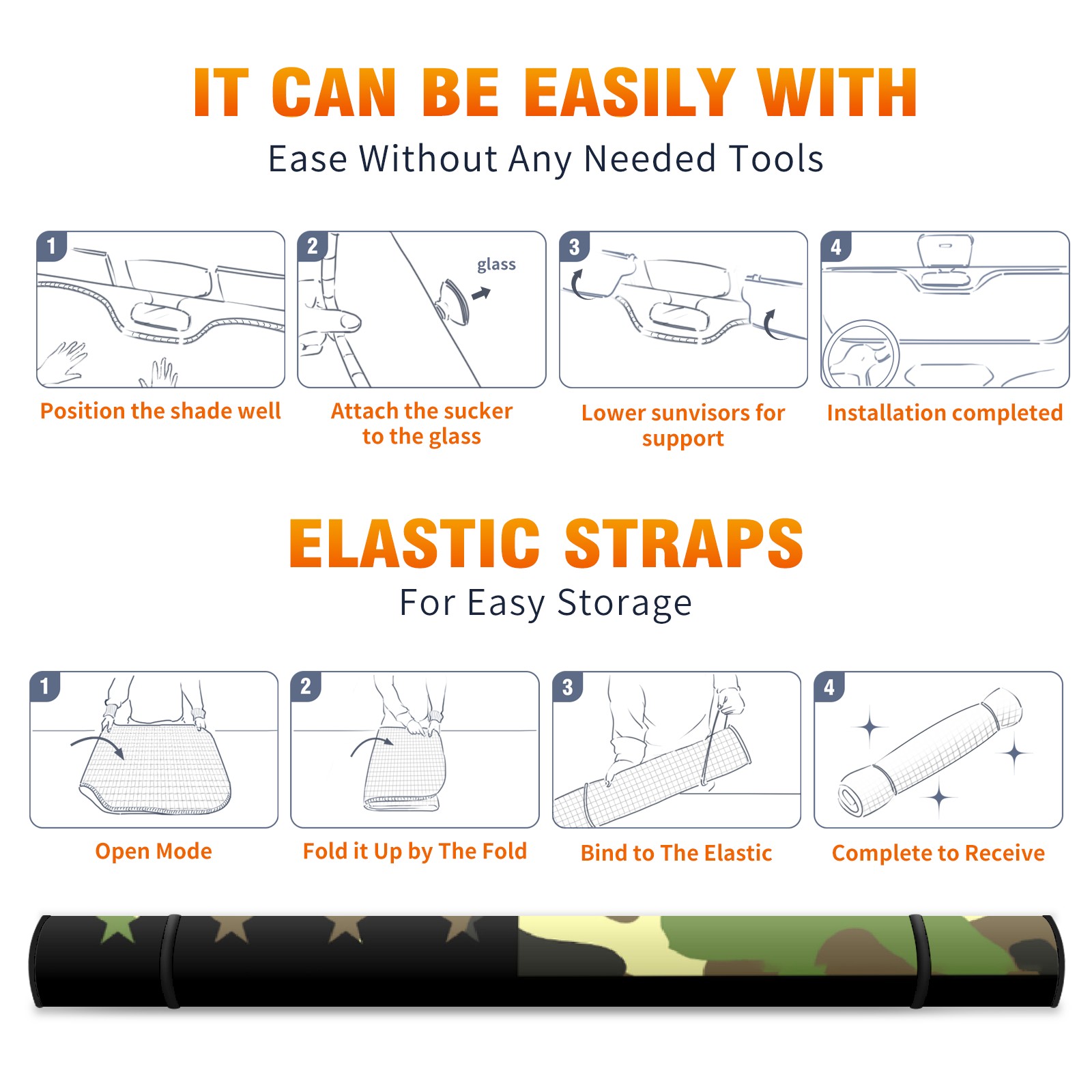 • <p><b>Foldable Premium Car Windshield Sunshade is your great solution to reduce your car’s interior temperature dramatically! This is definitely a must-have item for your summer travel!</b></p><p><b>【Precision Fit, Stylish Protection】</b></p><p>55"x30" (140x76cm) universal size with 3cm flexible margins fits curved windshields of most sedans/SUVs.</p><p><b>【Blocking Uv Rays &amp; Heat Insulation】</b></p><p>Our vehicle sunshade provides effective UV, sun, and summer heat protection, preventing leather fading and plastic cracking to keep your car interior pristine.</p><p><b>【Zero-Mark Installation &amp; Space-Saving】</b></p><p>Equipped with dual scratch-free silicone suction cups + adjustable straps: Medical-grade silicone cups hold firmly yet remove cleanly. Folds to A3 size (42x30cm x &lt;2cm thick), tucks discreetly into glove compartments or door pockets.&nbsp;</p>