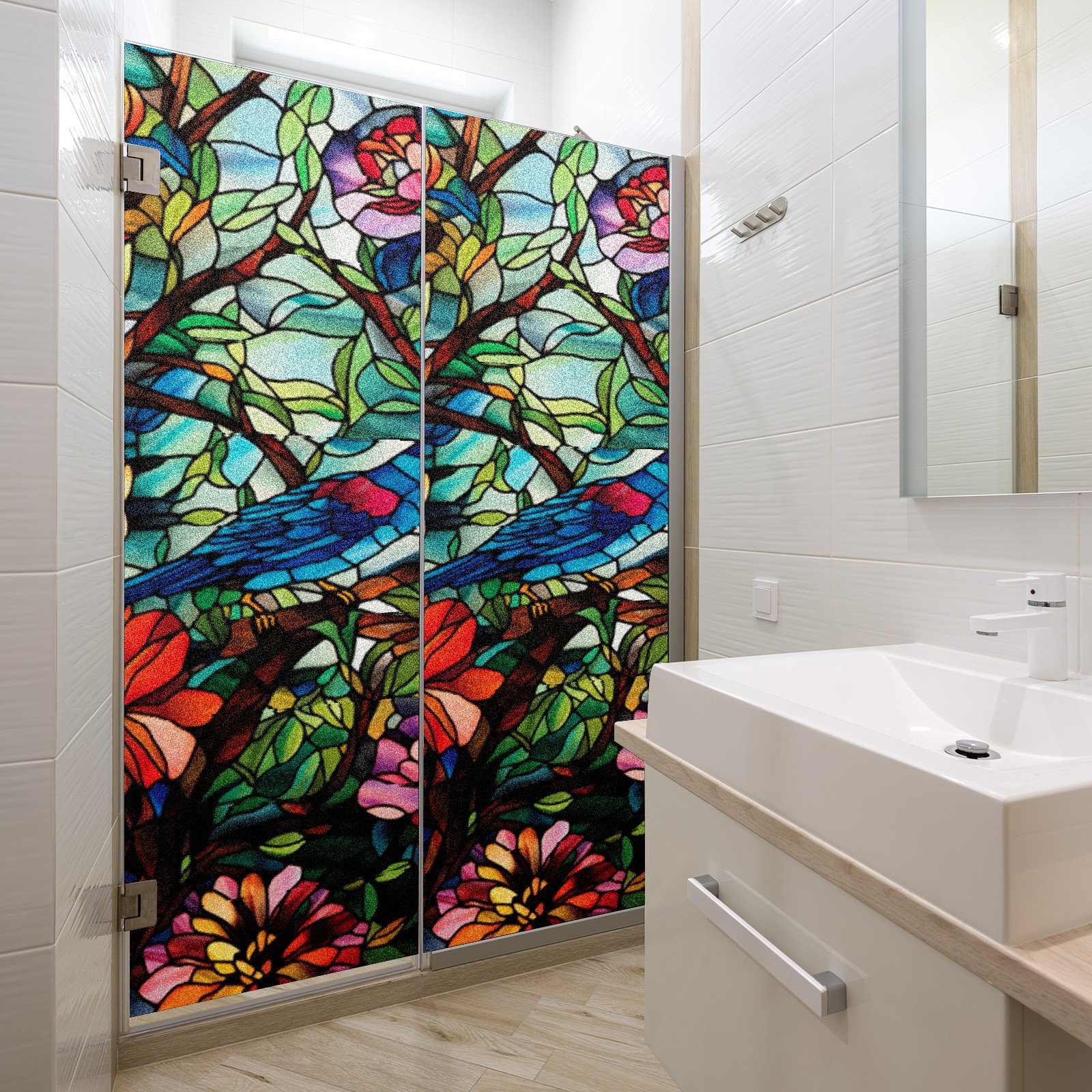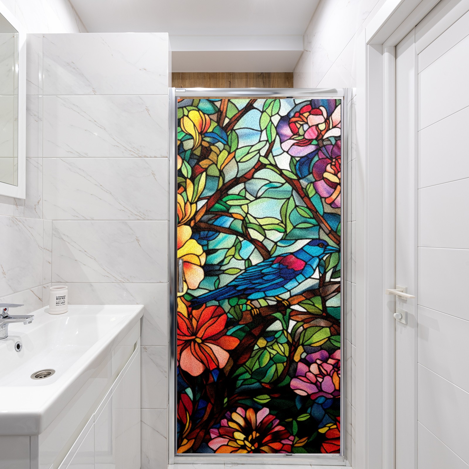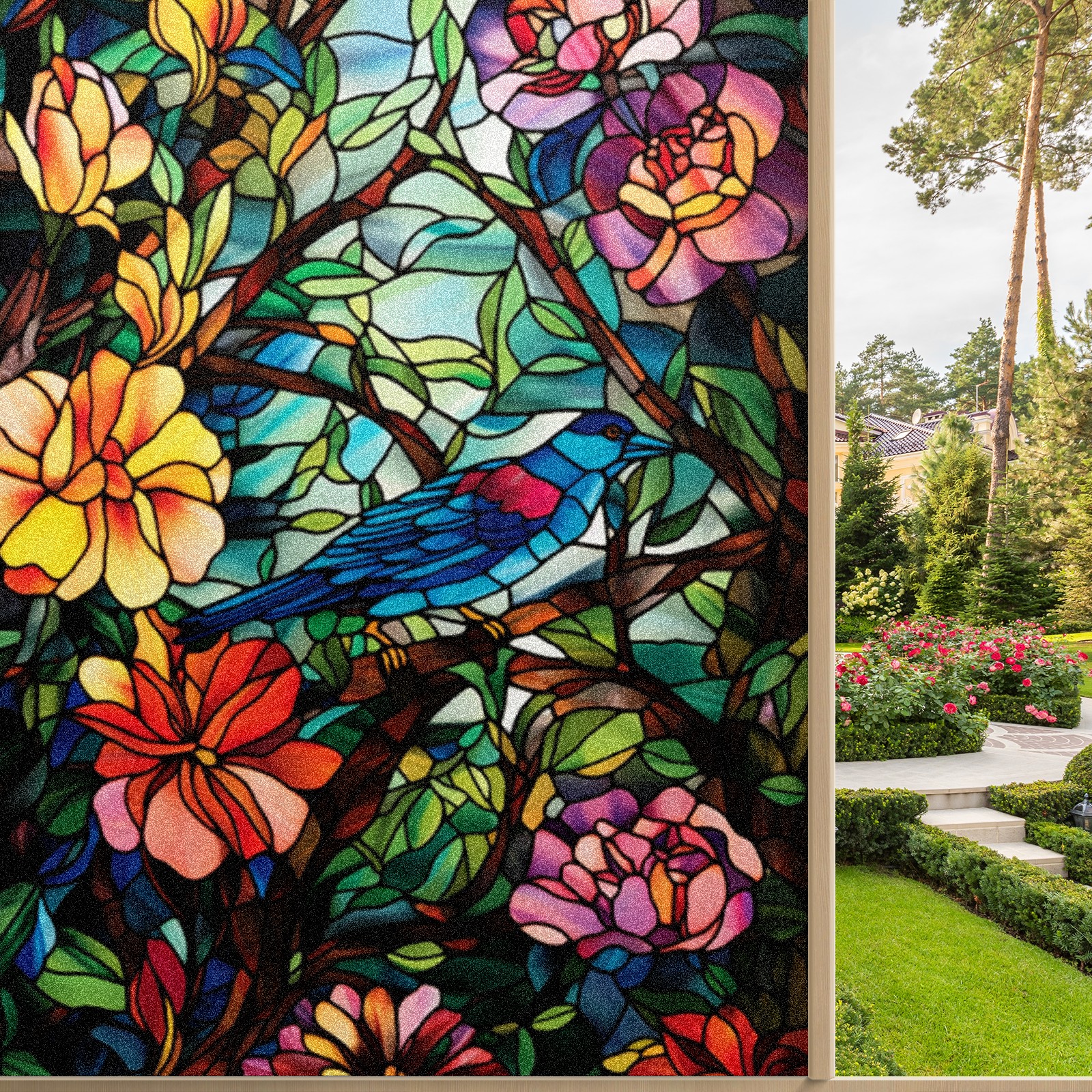 Window Privacy Film Frosted Stained Glass Film Decorative Static Cling for Bathroom Home Office Peel and Stick Window Film Flowers And Bird(17.7x23.6in)
