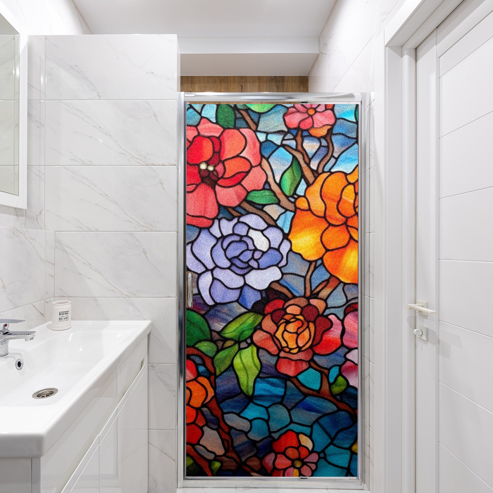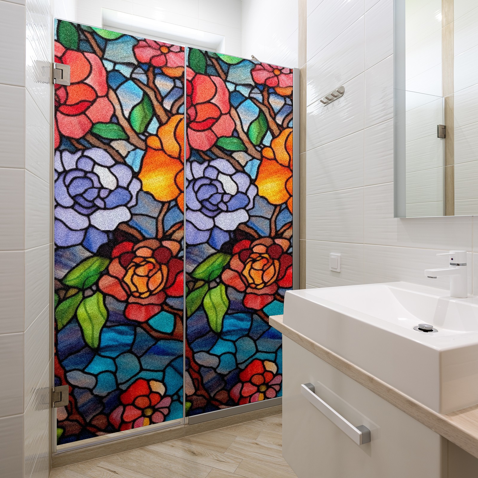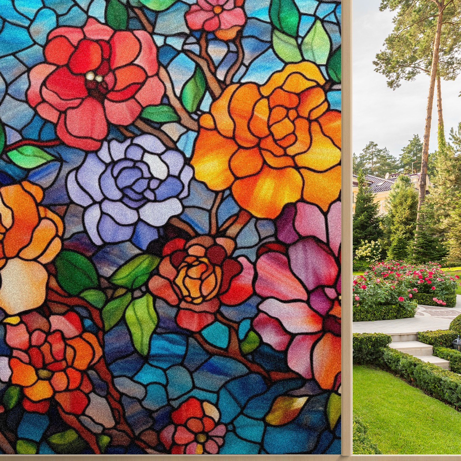Window Privacy Film Frosted Stained Glass Film Decorative Static Cling for Bathroom Home Office Peel and Stick Window Film Colorful Flowers(17.7x23.6in)