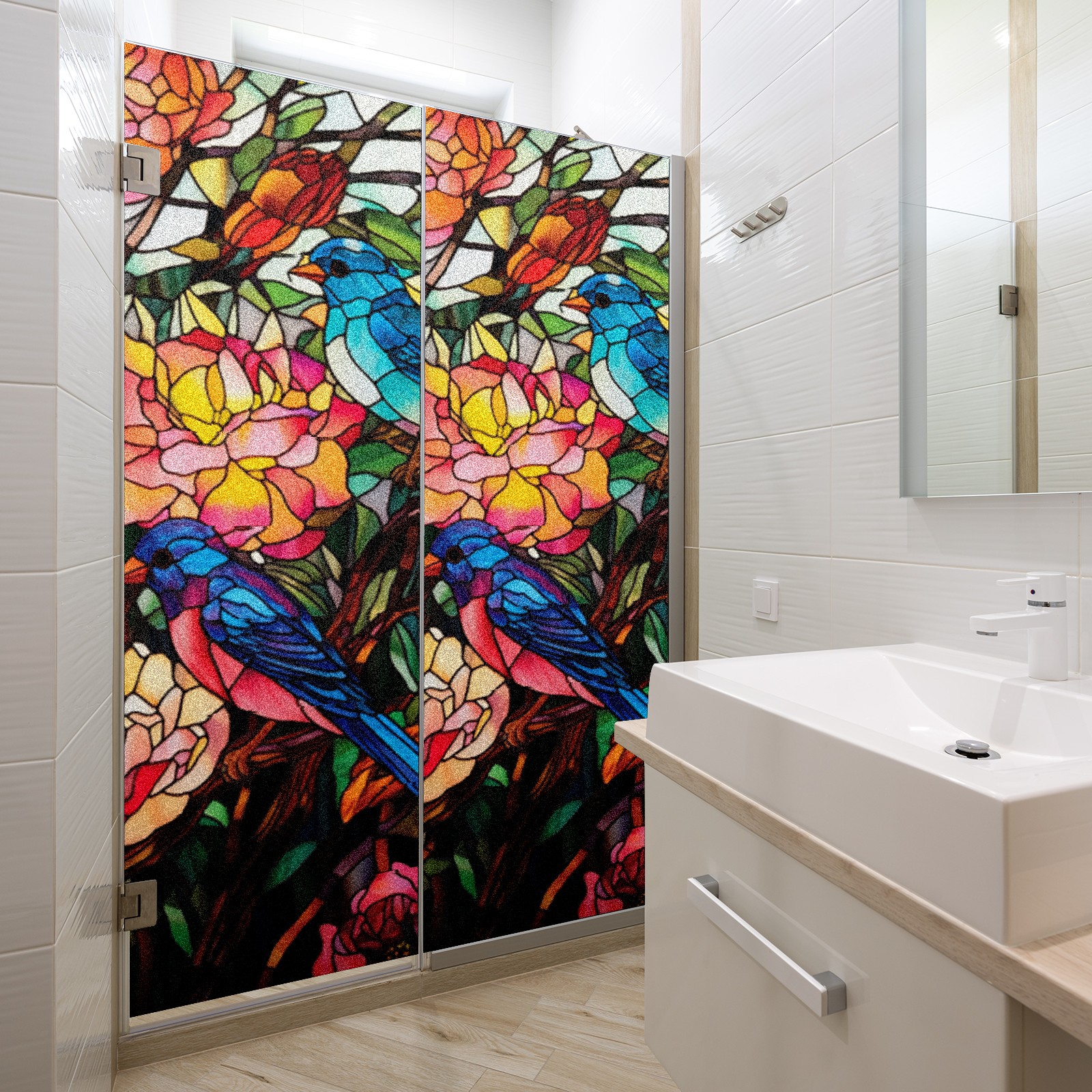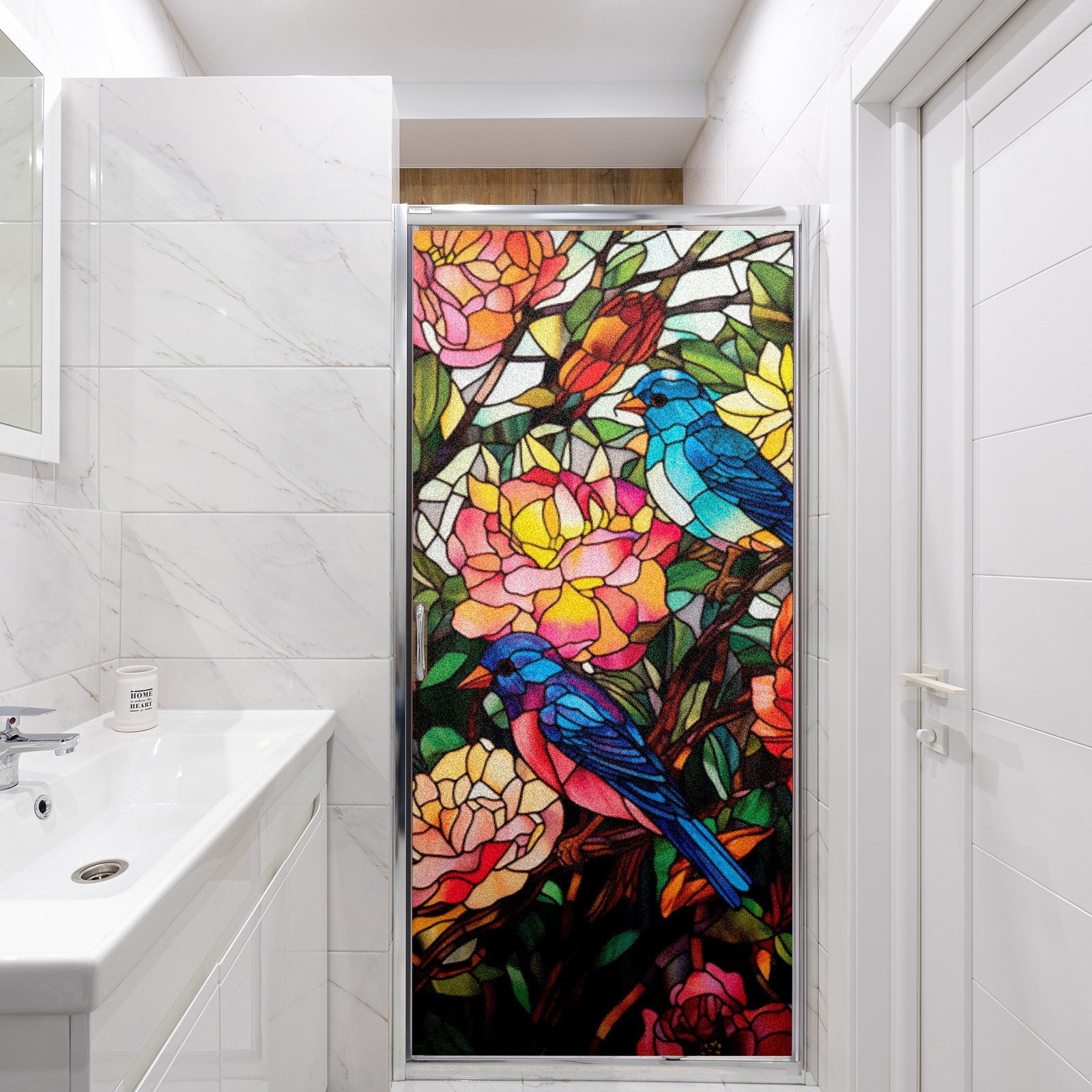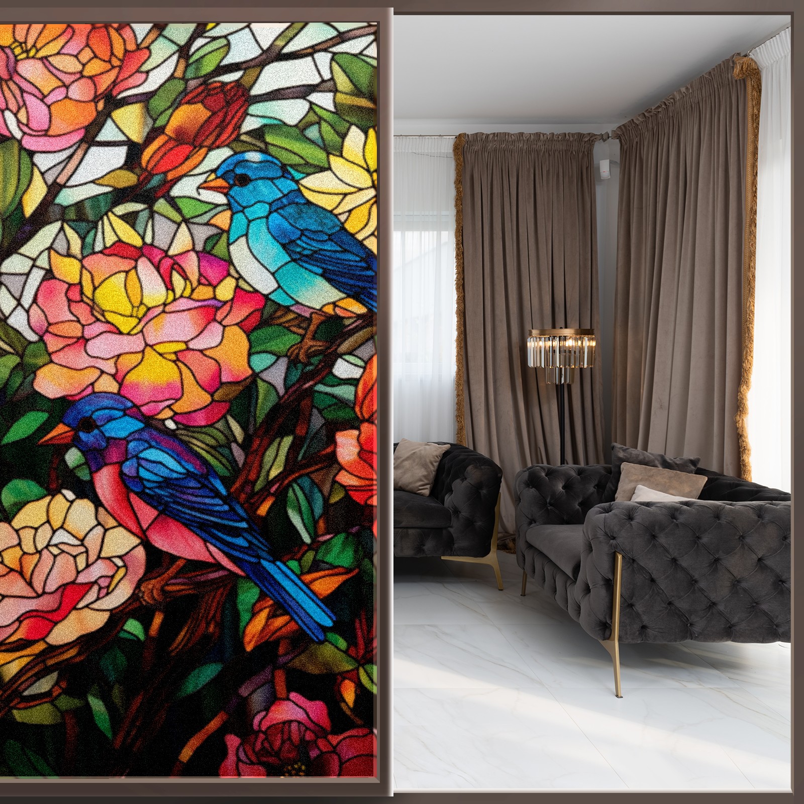 Window Privacy Film Frosted Stained Glass Film Decorative Static Cling for Bathroom Home Office Peel and Stick Window Film Two Artistic Colorful Birds(17.7x23.6in)