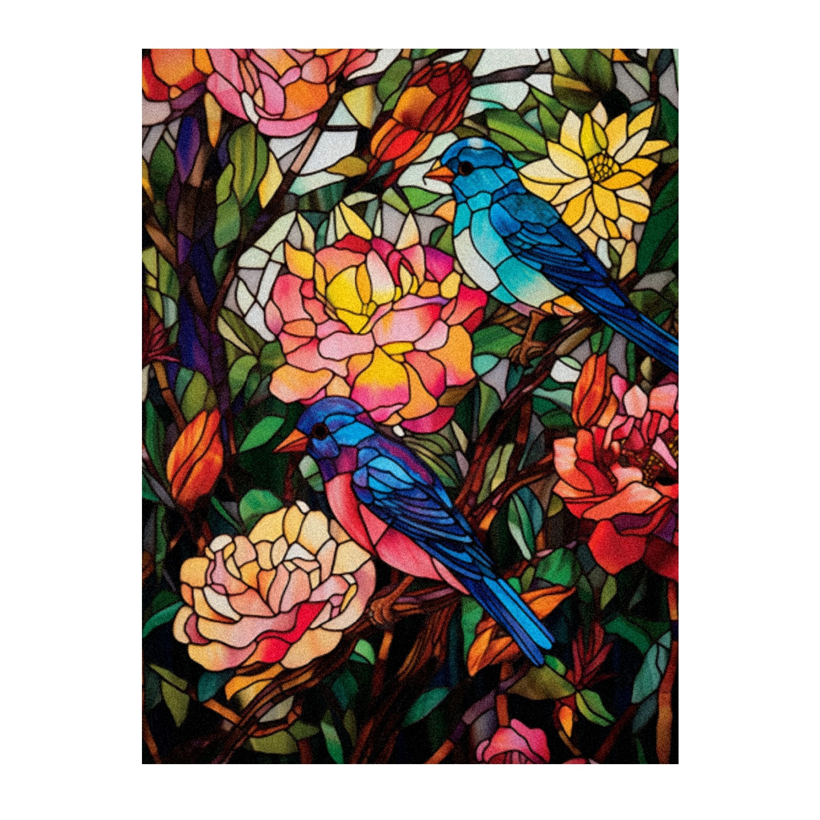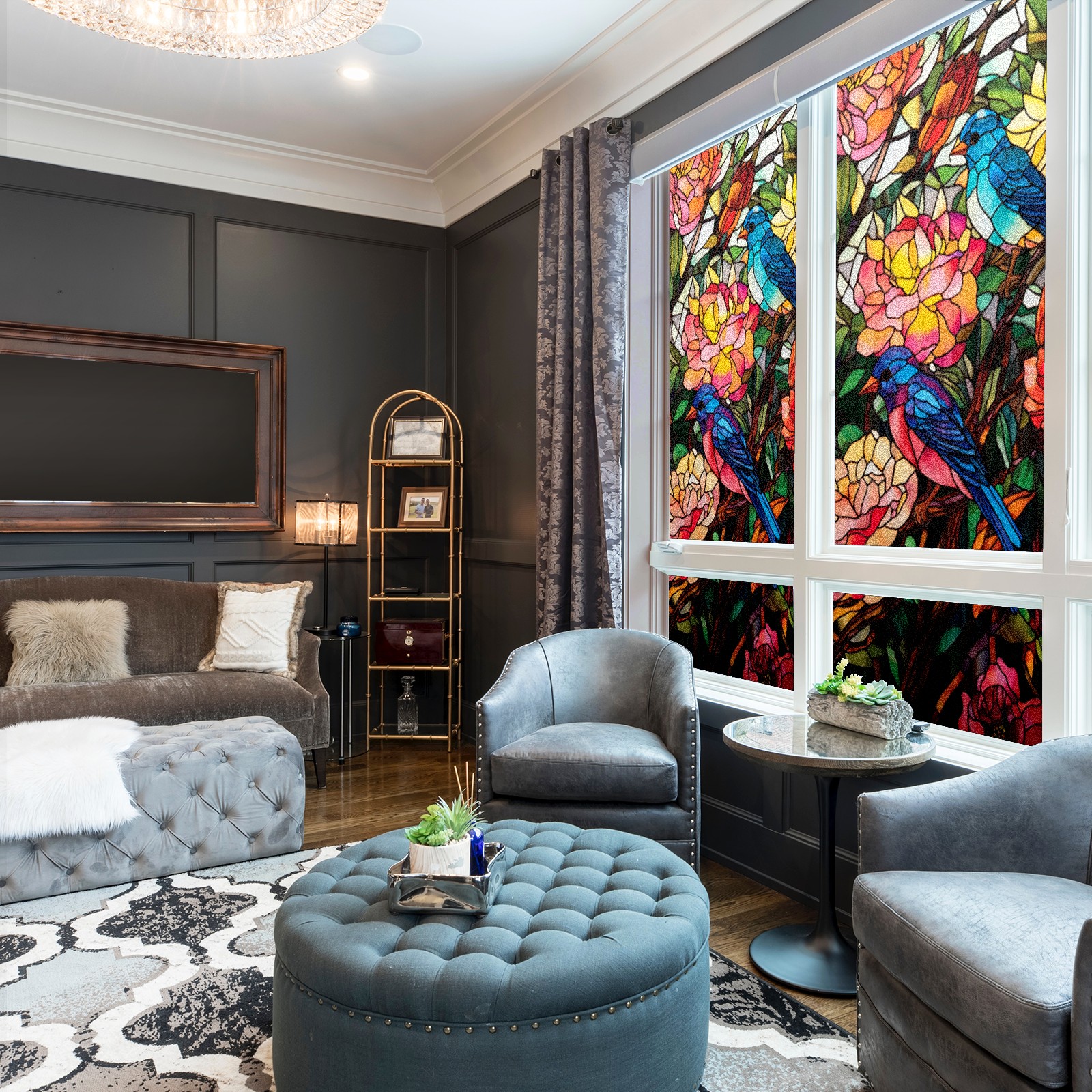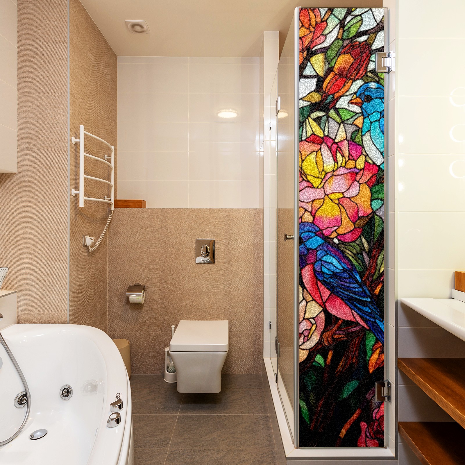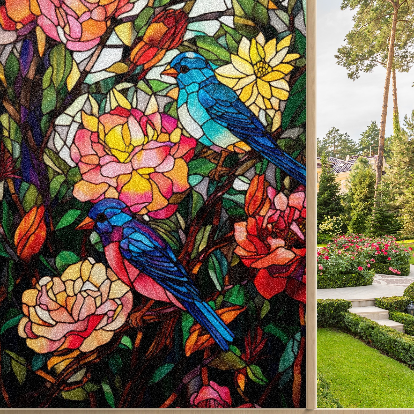 Window Privacy Film Frosted Stained Glass Film Decorative Static Cling for Bathroom Home Office Peel and Stick Window Film Two Artistic Colorful Birds(17.7x23.6in)