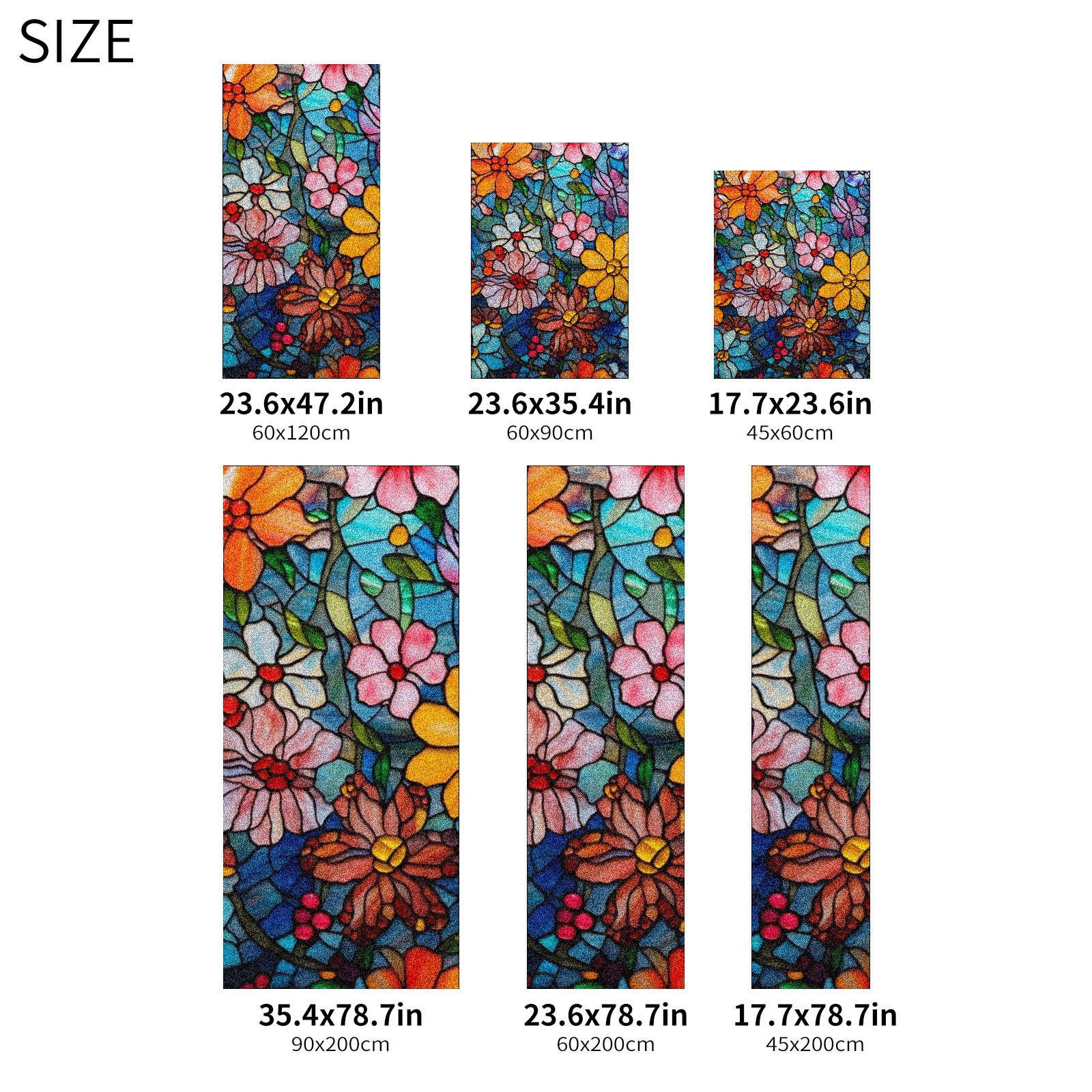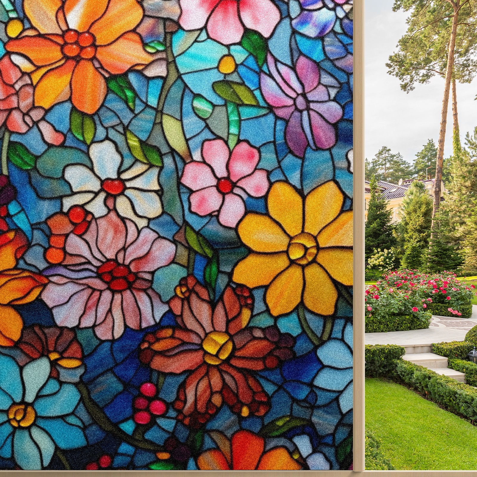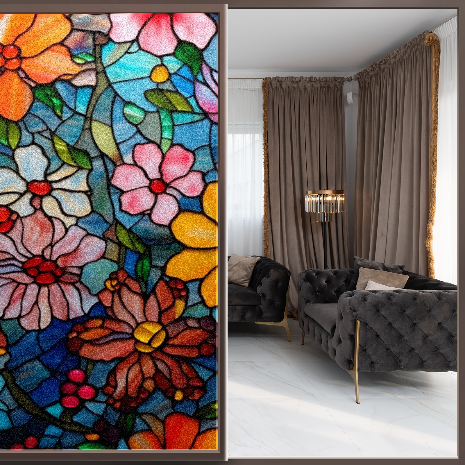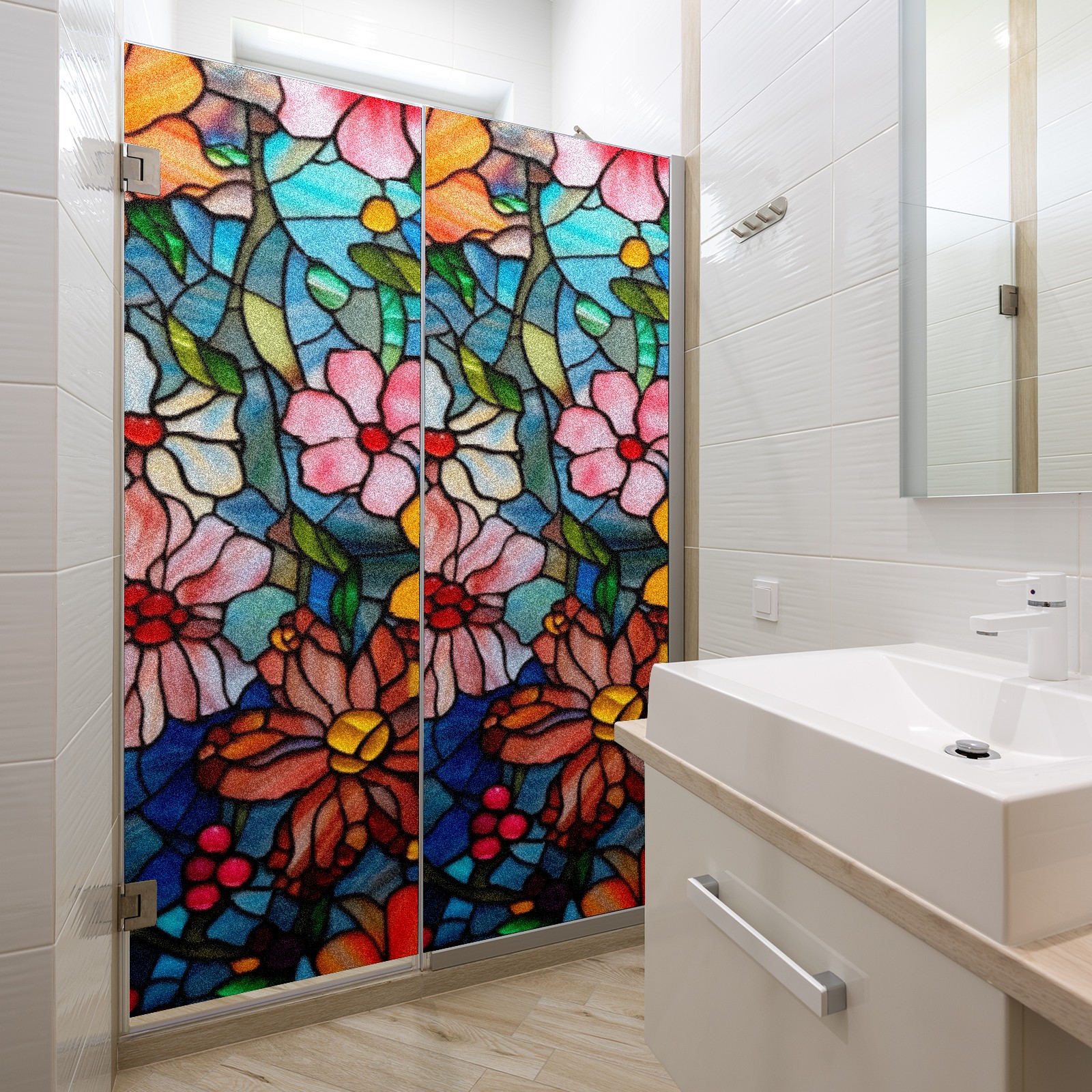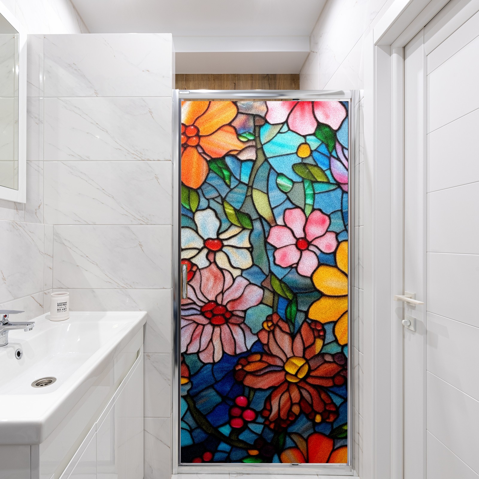 Window Privacy Film Frosted Stained Glass Film Decorative Static Cling for Bathroom Home Office Peel and Stick Window Film Colorful Geometric Flowers(17.7x23.6in)