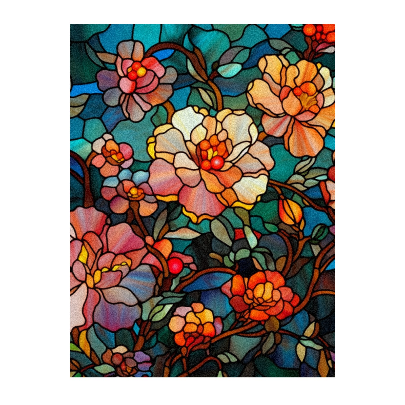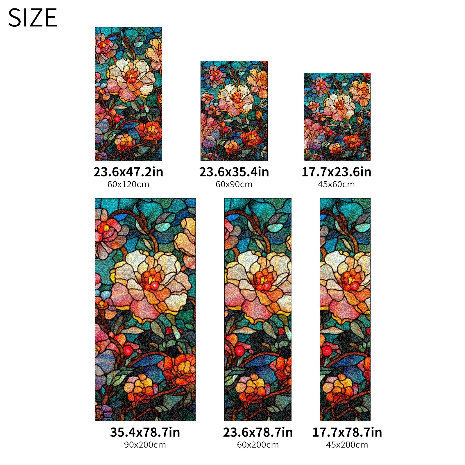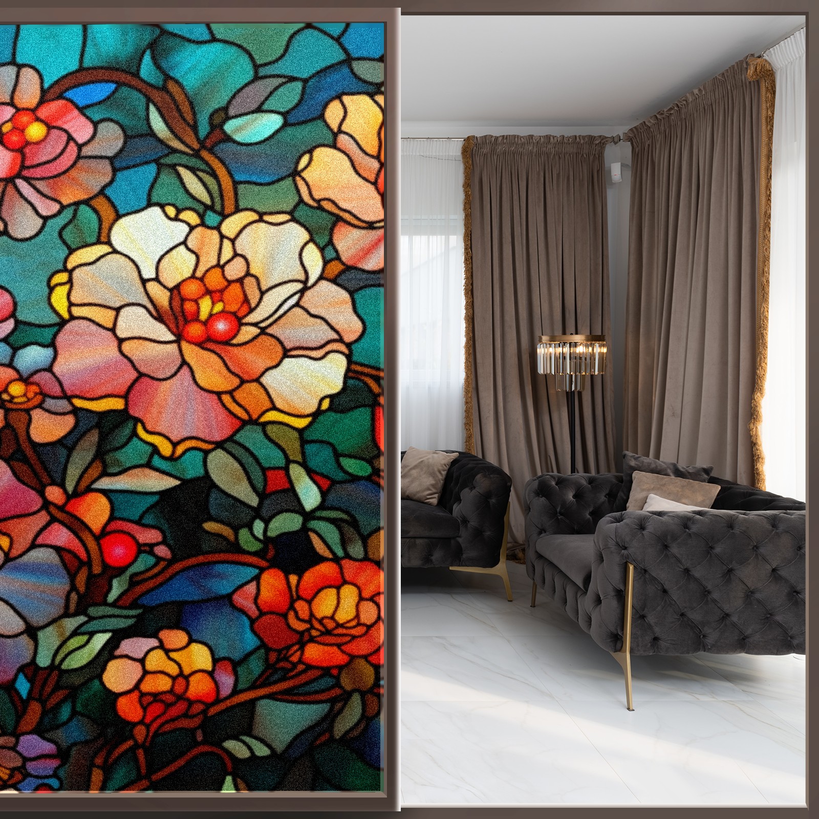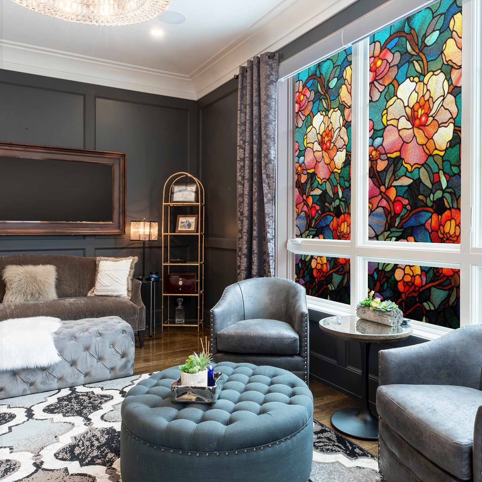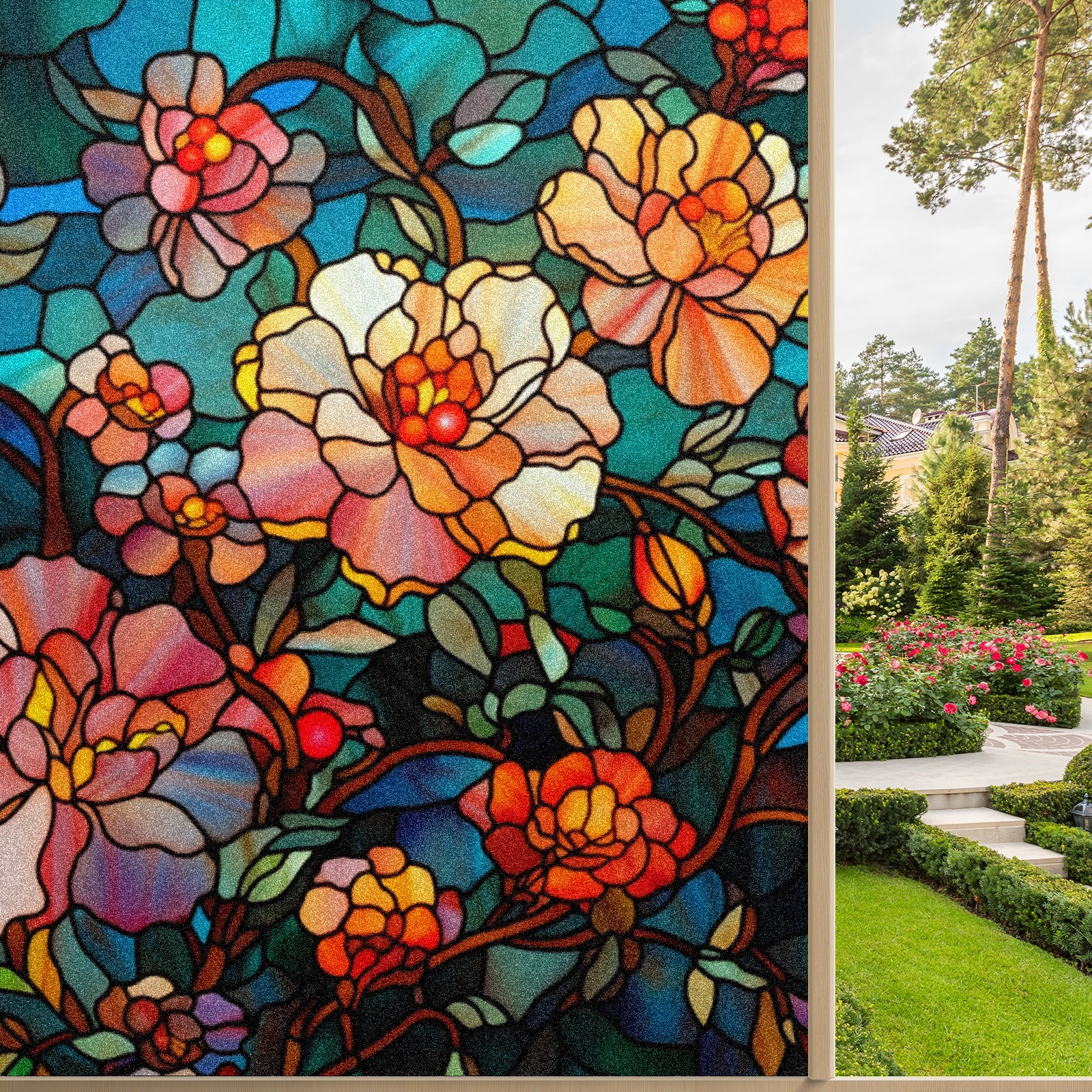 Window Privacy Film Frosted Stained Glass Film Decorative Static Cling for Bathroom Home Office Peel and Stick Window Film Dark Colored Flowers(17.7x23.6in)