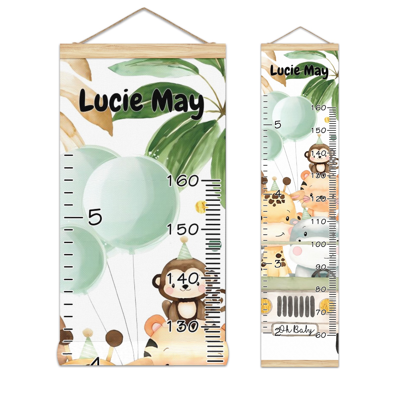 Personalized Kids Name Growth Chart Ruler for Wall Wood Frame Canvas Height Measure Chart 13.4x56 in Hanging Growth Chart Watercolor Safari Animals Jungle Greenery4.8 Boys Girls Room Decor