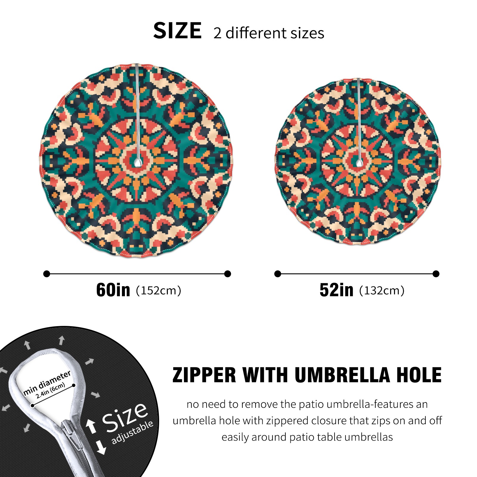 • <p>Constructed with heavy-duty polyester fabric, this tablecloth withstands outdoor wear while maintaining a clean appearance. The adjustable zipper hole accommodates umbrella poles of varying thickness, allowing installation without disassembling the umbrella stand.</p> <p>Ideal for backyard BBQs or cafe patios, this tablecloth elevates table presentation instantly. Available in two classic sizes, the precision circular cut ensures full table coverage. </p> <p>Machine washable in cold water without color fading or shape distortion. The lightweight fabric folds compactly for space-efficient storage between uses.</p>