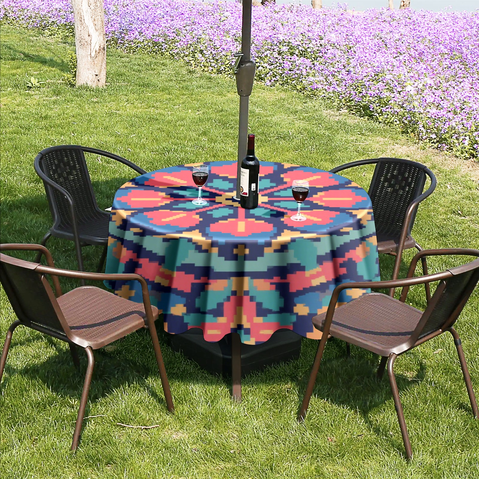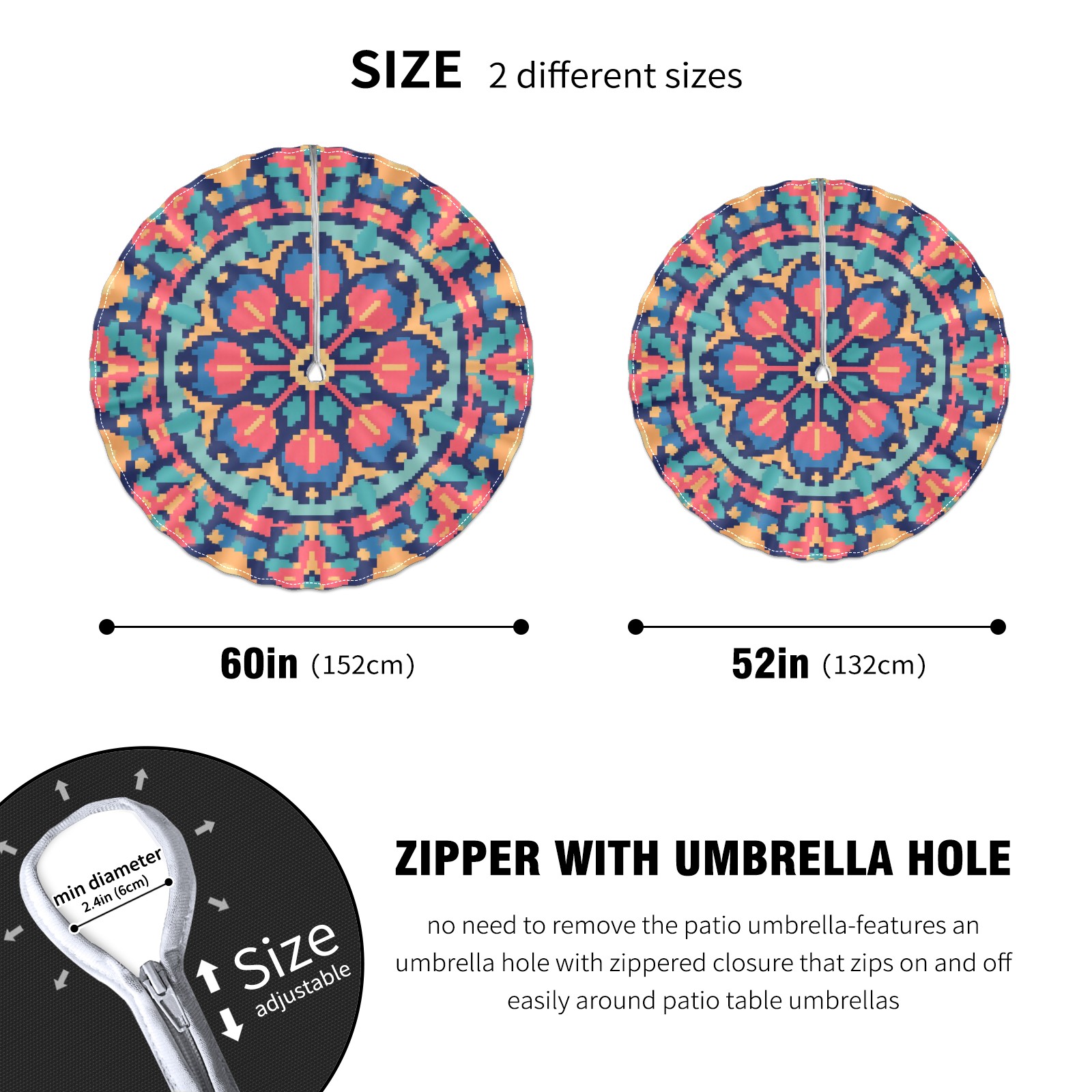 • <p>Constructed with heavy-duty polyester fabric, this tablecloth withstands outdoor wear while maintaining a clean appearance. The adjustable zipper hole accommodates umbrella poles of varying thickness, allowing installation without disassembling the umbrella stand.</p> <p>Ideal for backyard BBQs or cafe patios, this tablecloth elevates table presentation instantly. Available in two classic sizes, the precision circular cut ensures full table coverage. </p> <p>Machine washable in cold water without color fading or shape distortion. The lightweight fabric folds compactly for space-efficient storage between uses.</p>
