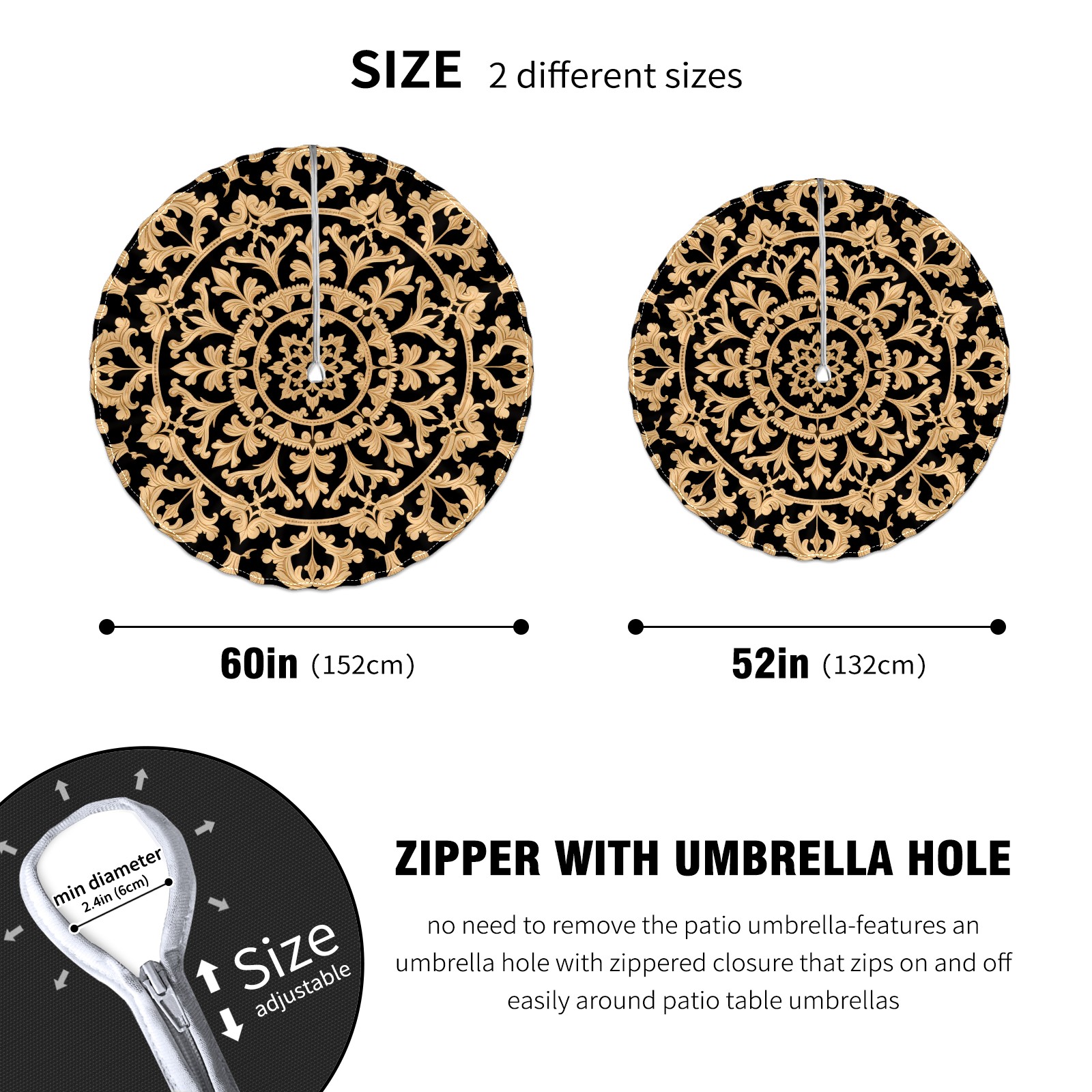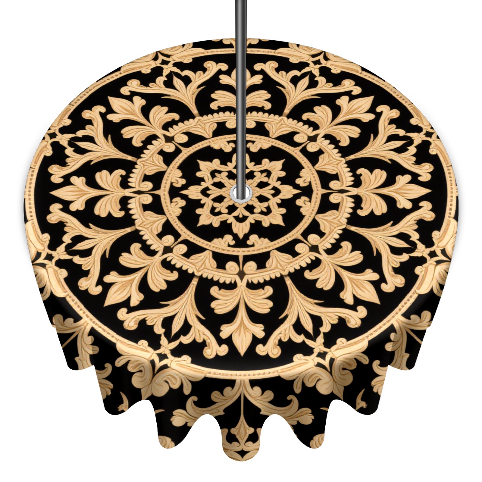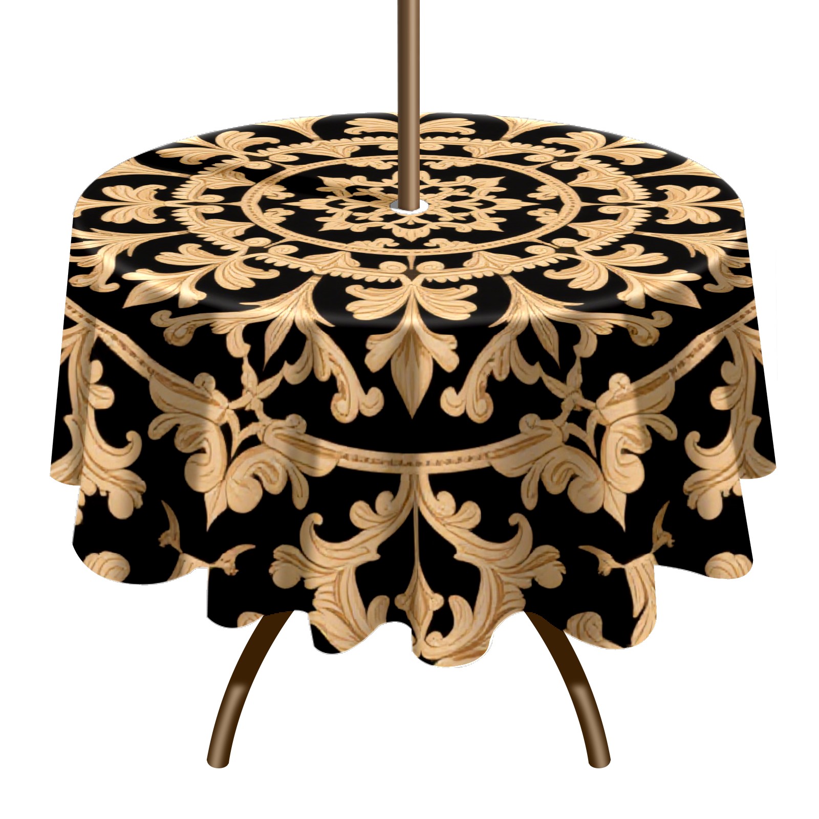 Round Tablecloth with Adjustable Zippered Hole - Durable Polyester for Patio, Restaurant & Outdoor Dining Black Gold Symmetrical Pattern (60in)