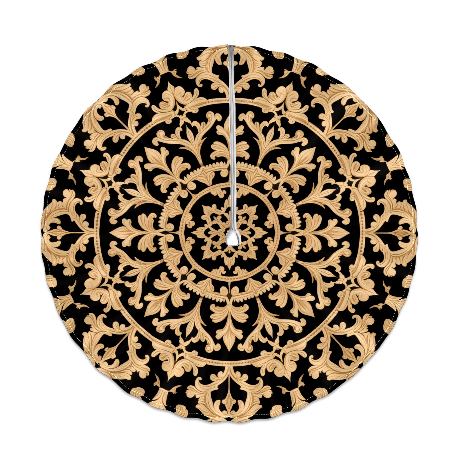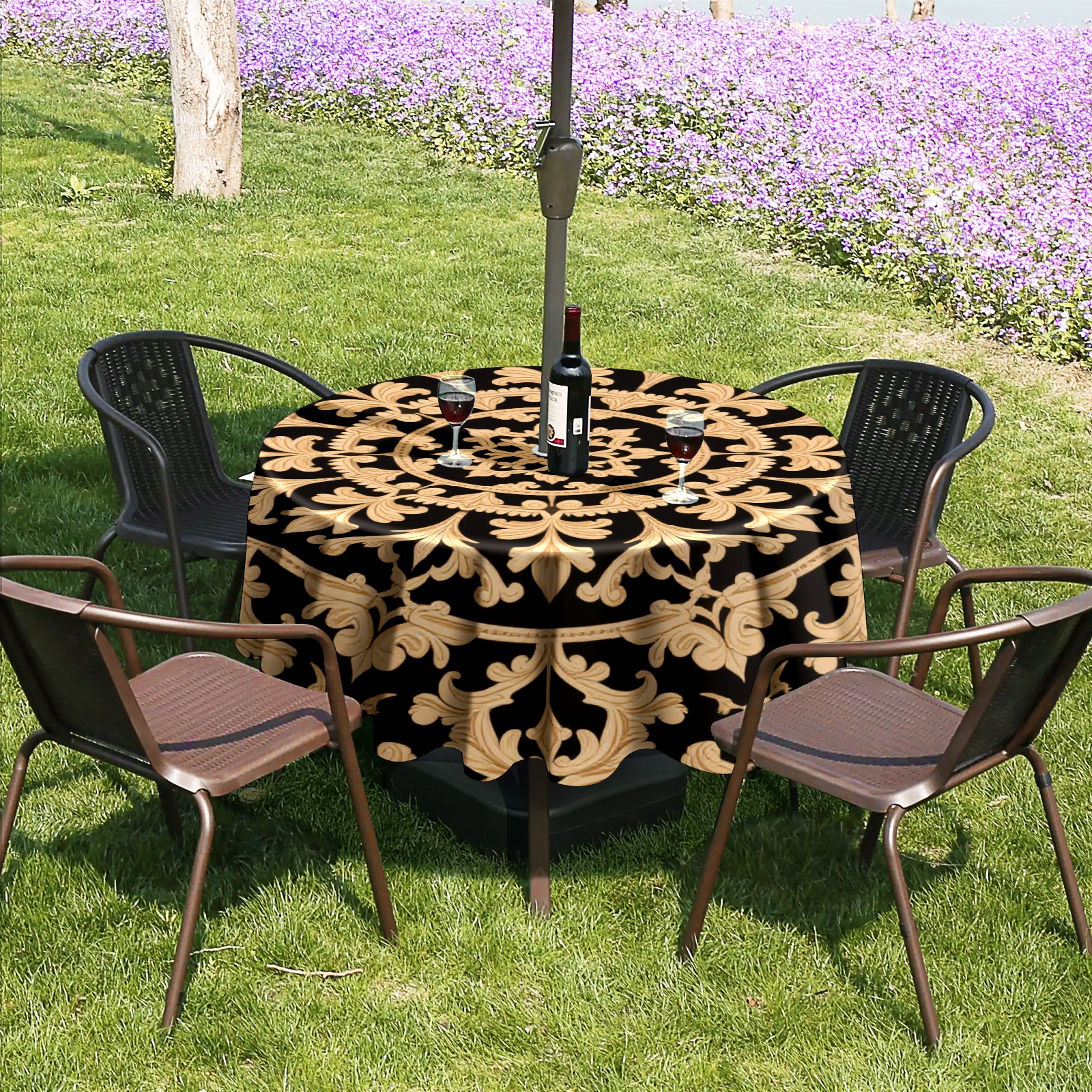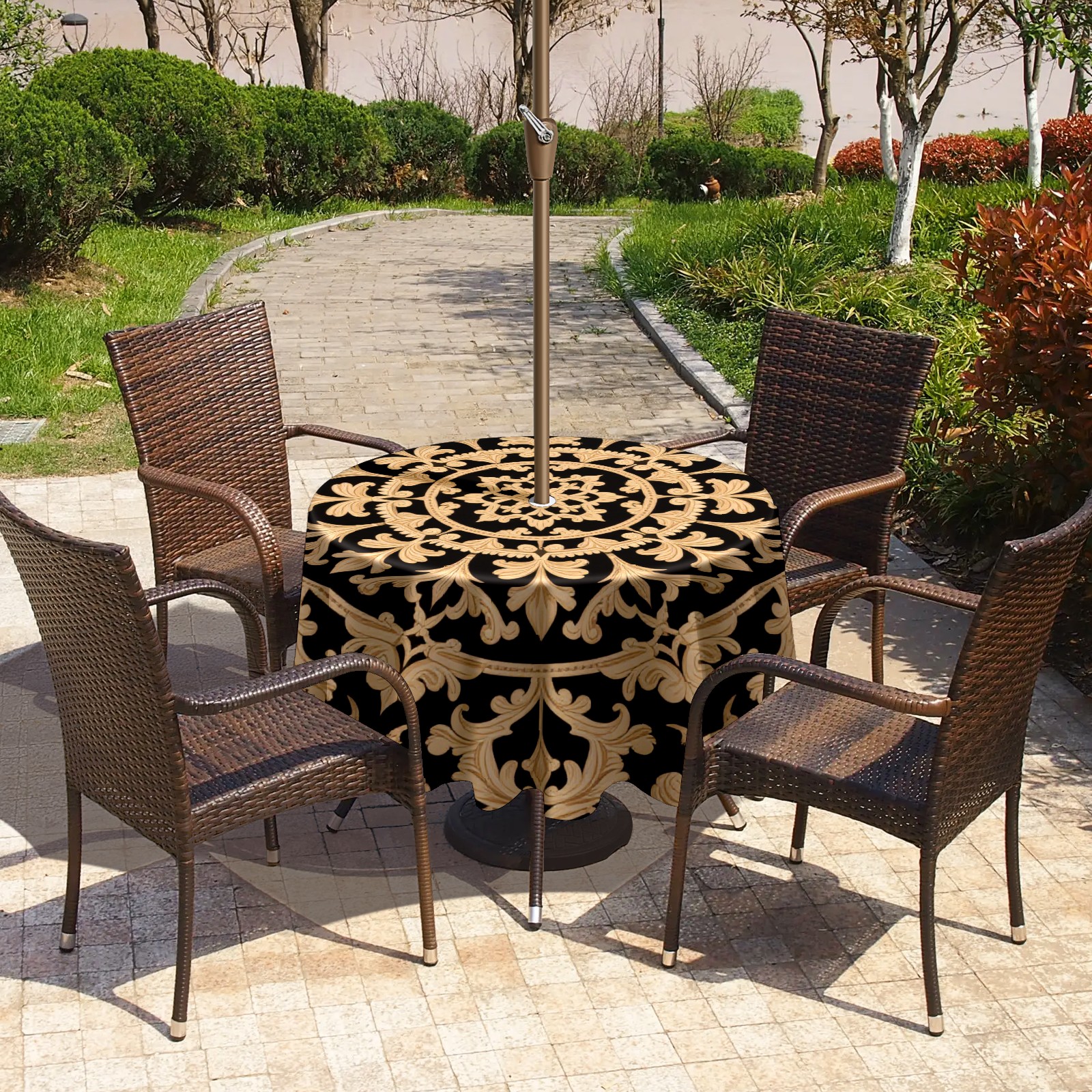 Round Tablecloth with Adjustable Zippered Hole - Durable Polyester for Patio, Restaurant & Outdoor Dining Black Gold Symmetrical Pattern (60in)