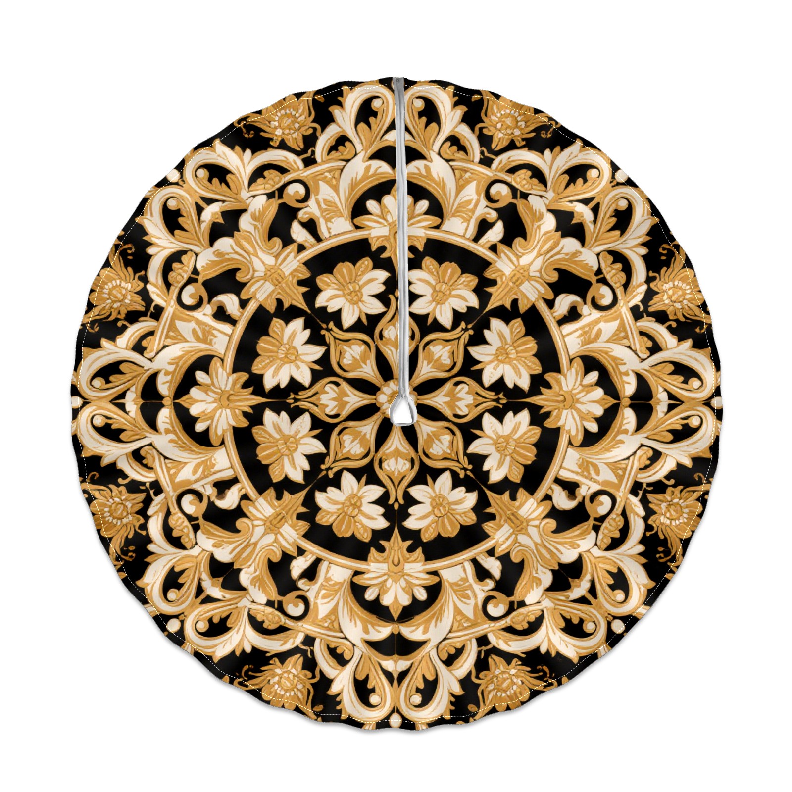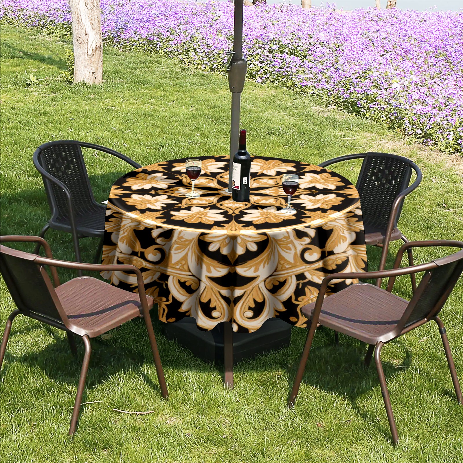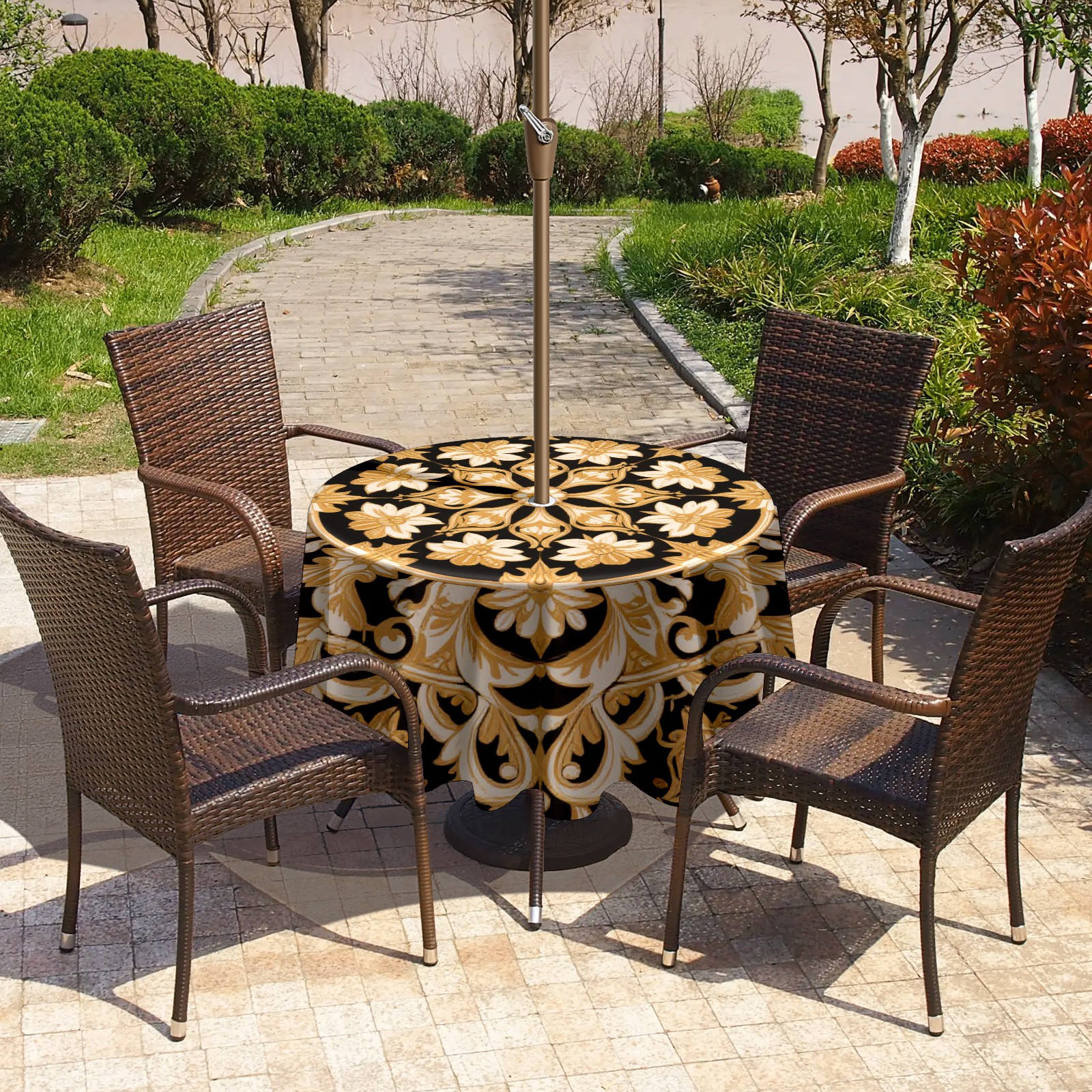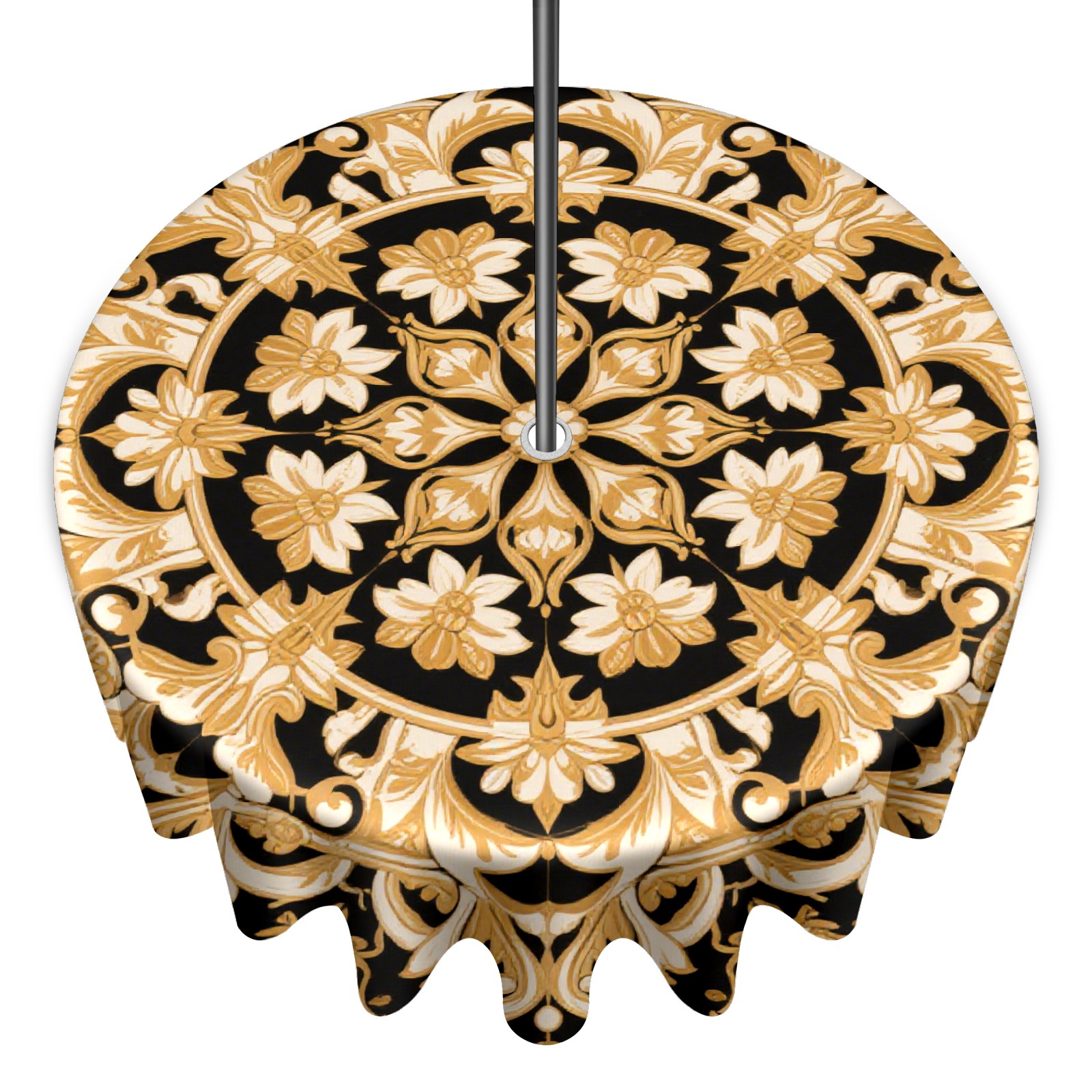 Round Tablecloth with Adjustable Zippered Hole - Durable Polyester for Patio, Restaurant & Outdoor Dining Black Gold Floral Pattern (60in)