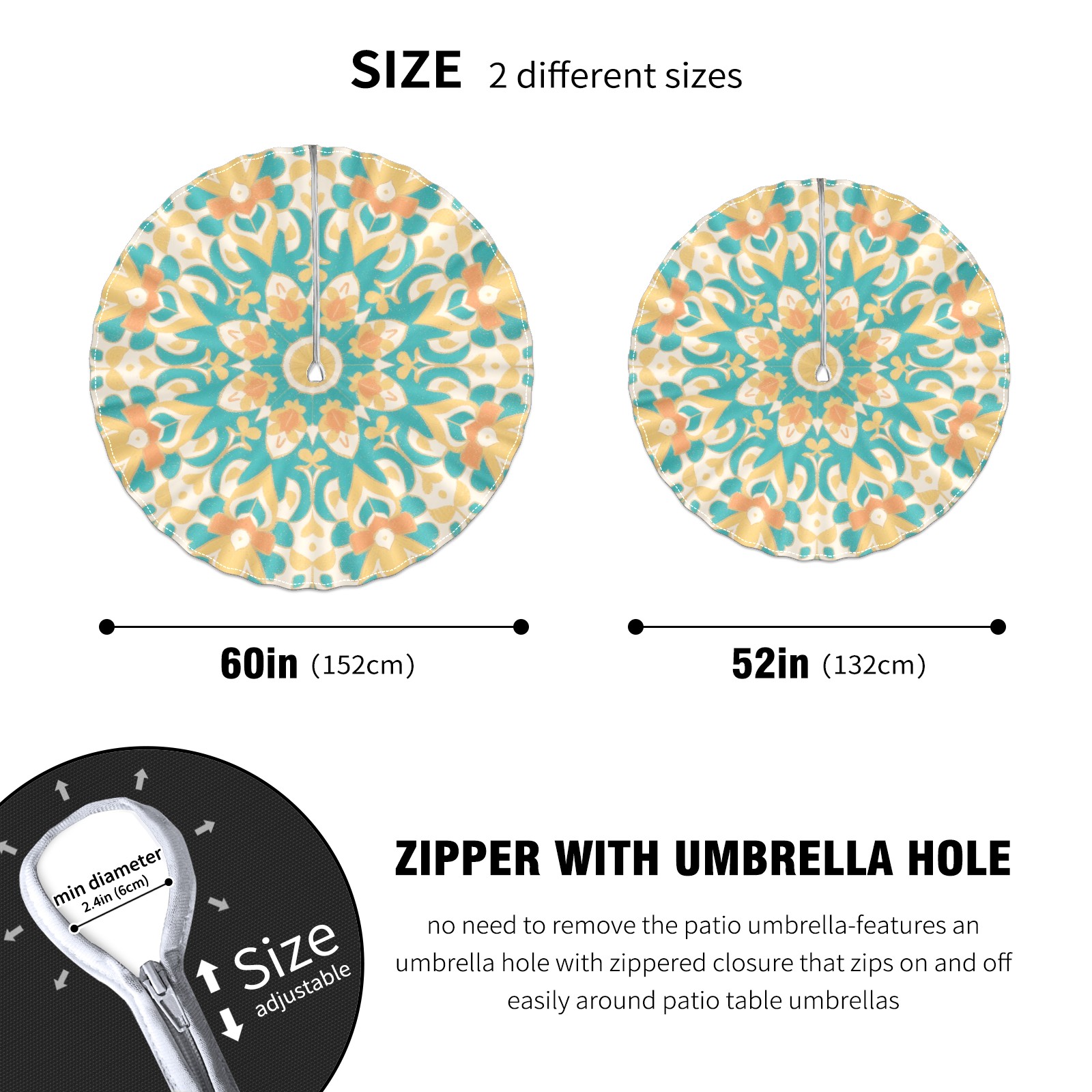 • <p>Constructed with heavy-duty polyester fabric, this tablecloth withstands outdoor wear while maintaining a clean appearance. The adjustable zipper hole accommodates umbrella poles of varying thickness, allowing installation without disassembling the umbrella stand.</p> <p>Ideal for backyard BBQs or cafe patios, this tablecloth elevates table presentation instantly. Available in two classic sizes, the precision circular cut ensures full table coverage. </p> <p>Machine washable in cold water without color fading or shape distortion. The lightweight fabric folds compactly for space-efficient storage between uses.</p>