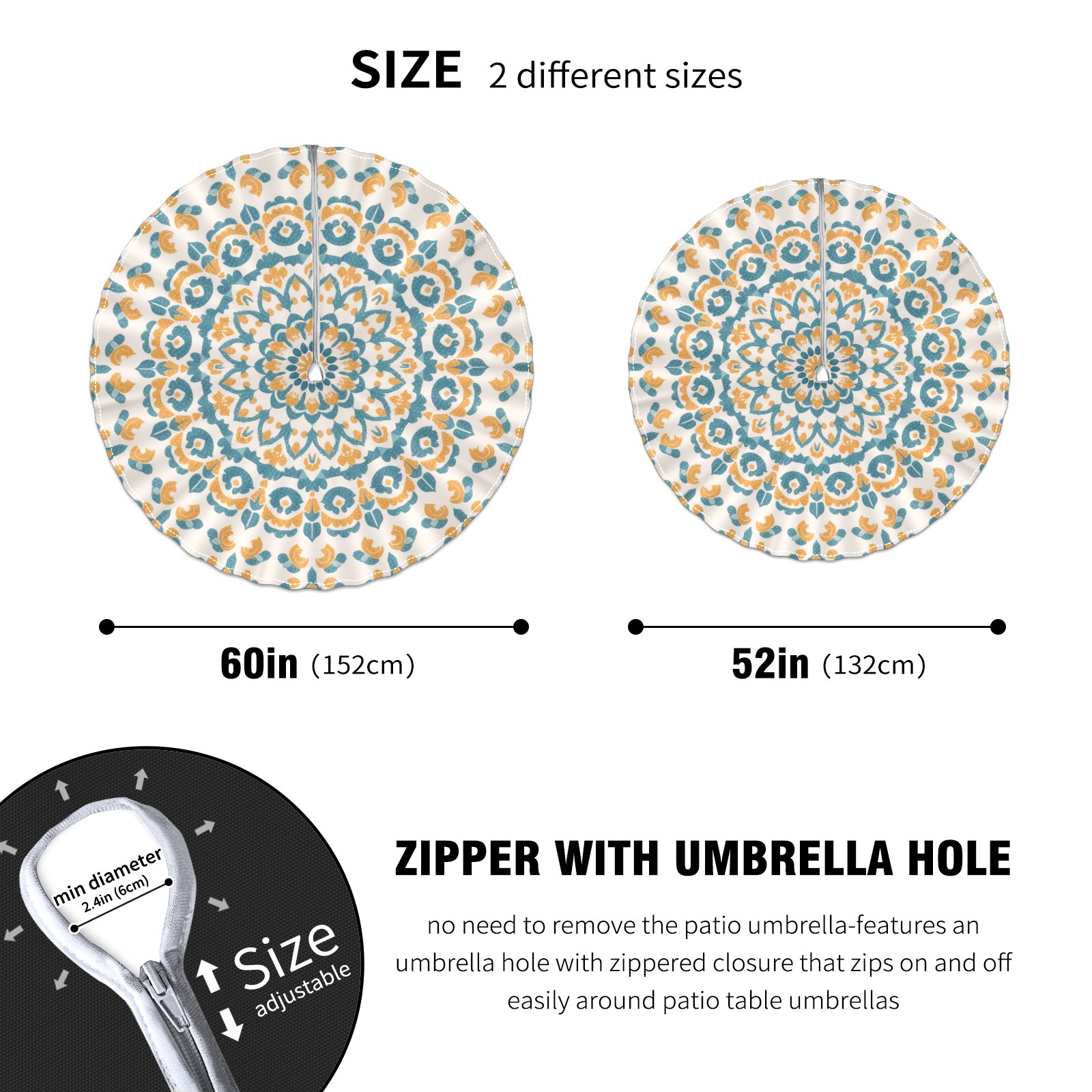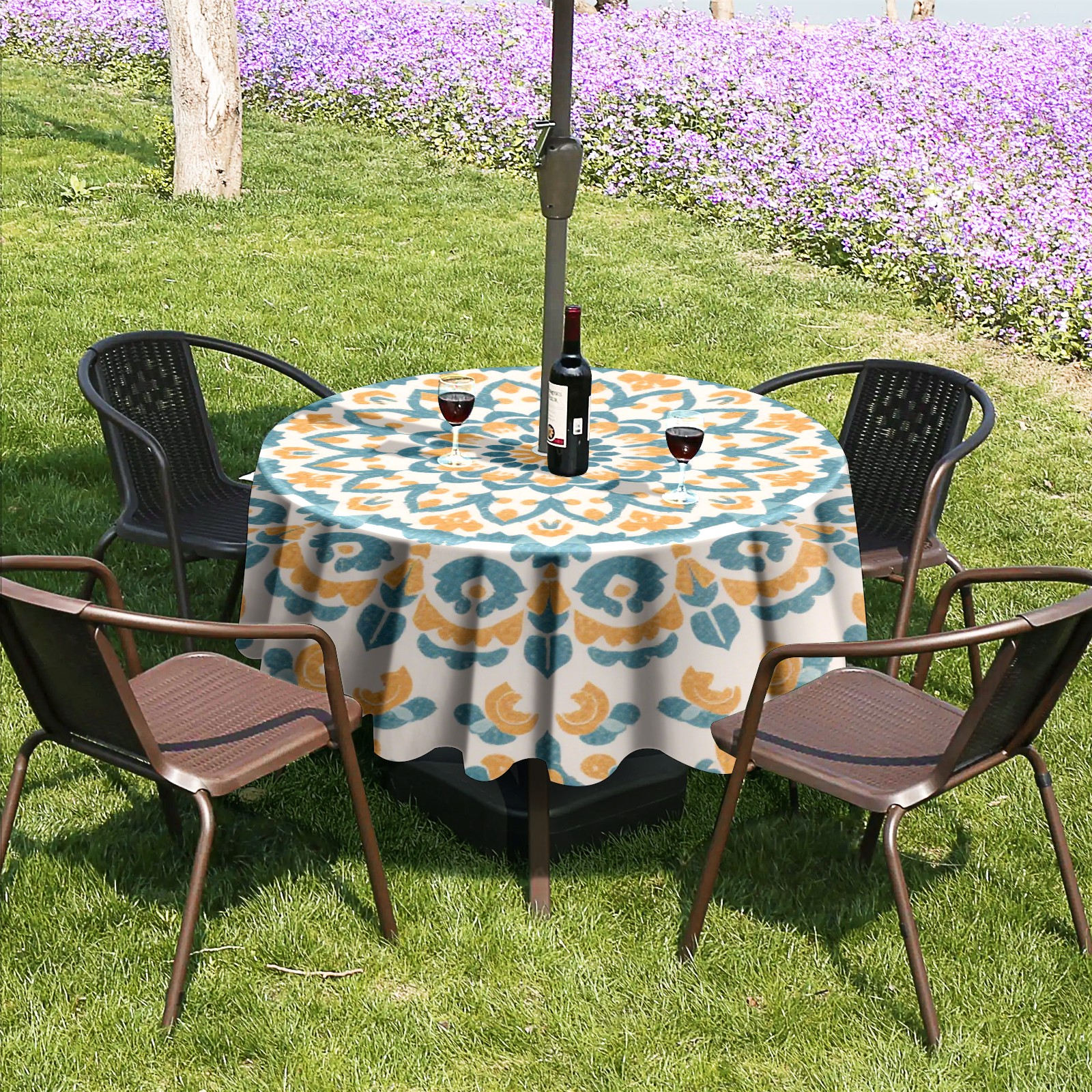 • <p>Constructed with heavy-duty polyester fabric, this tablecloth withstands outdoor wear while maintaining a clean appearance. The adjustable zipper hole accommodates umbrella poles of varying thickness, allowing installation without disassembling the umbrella stand.</p> <p>Ideal for backyard BBQs or cafe patios, this tablecloth elevates table presentation instantly. Available in two classic sizes, the precision circular cut ensures full table coverage. </p> <p>Machine washable in cold water without color fading or shape distortion. The lightweight fabric folds compactly for space-efficient storage between uses.</p>