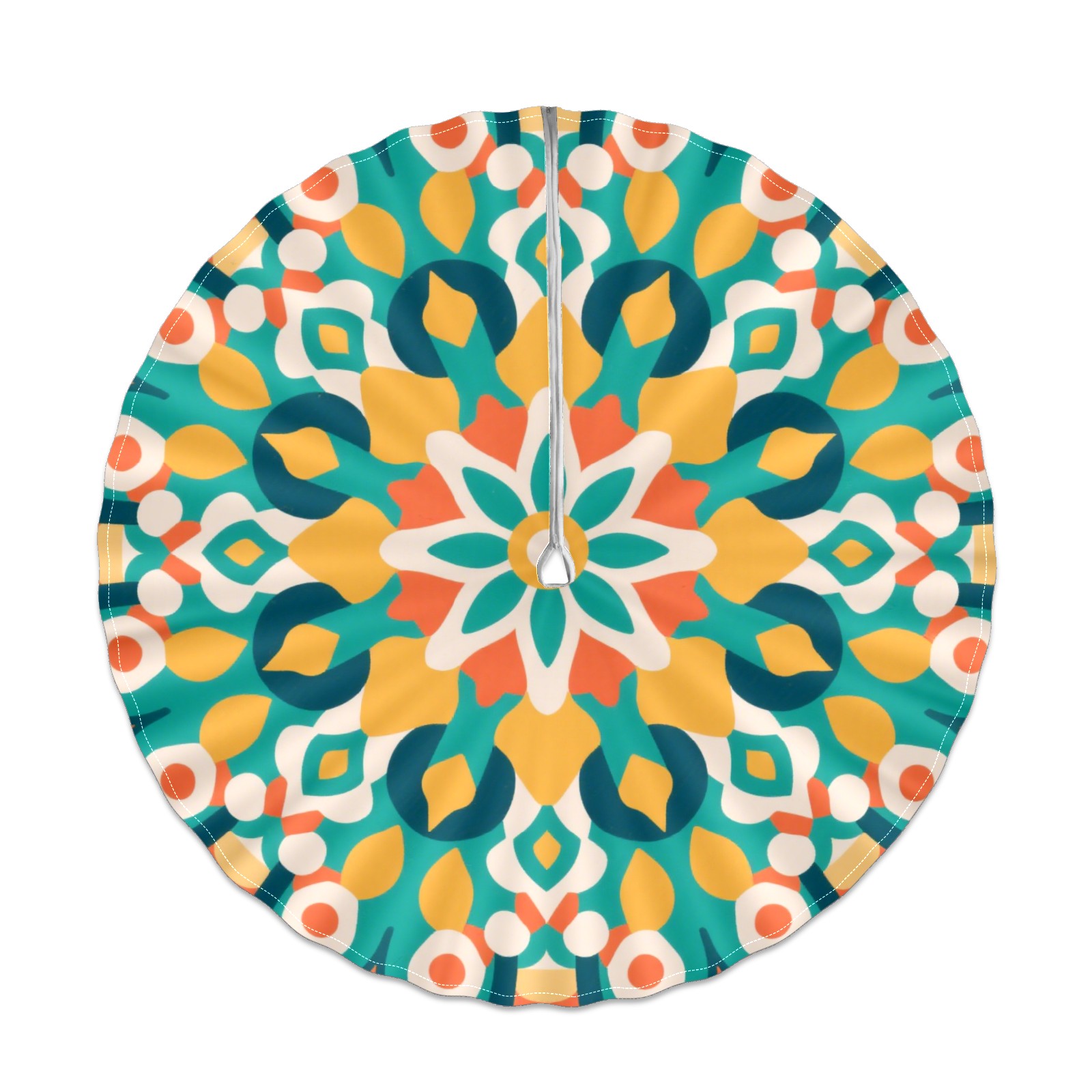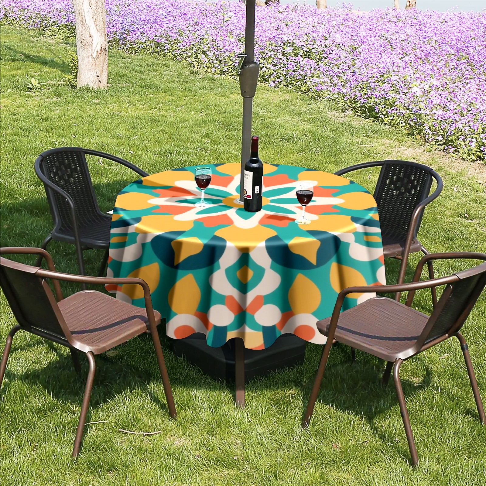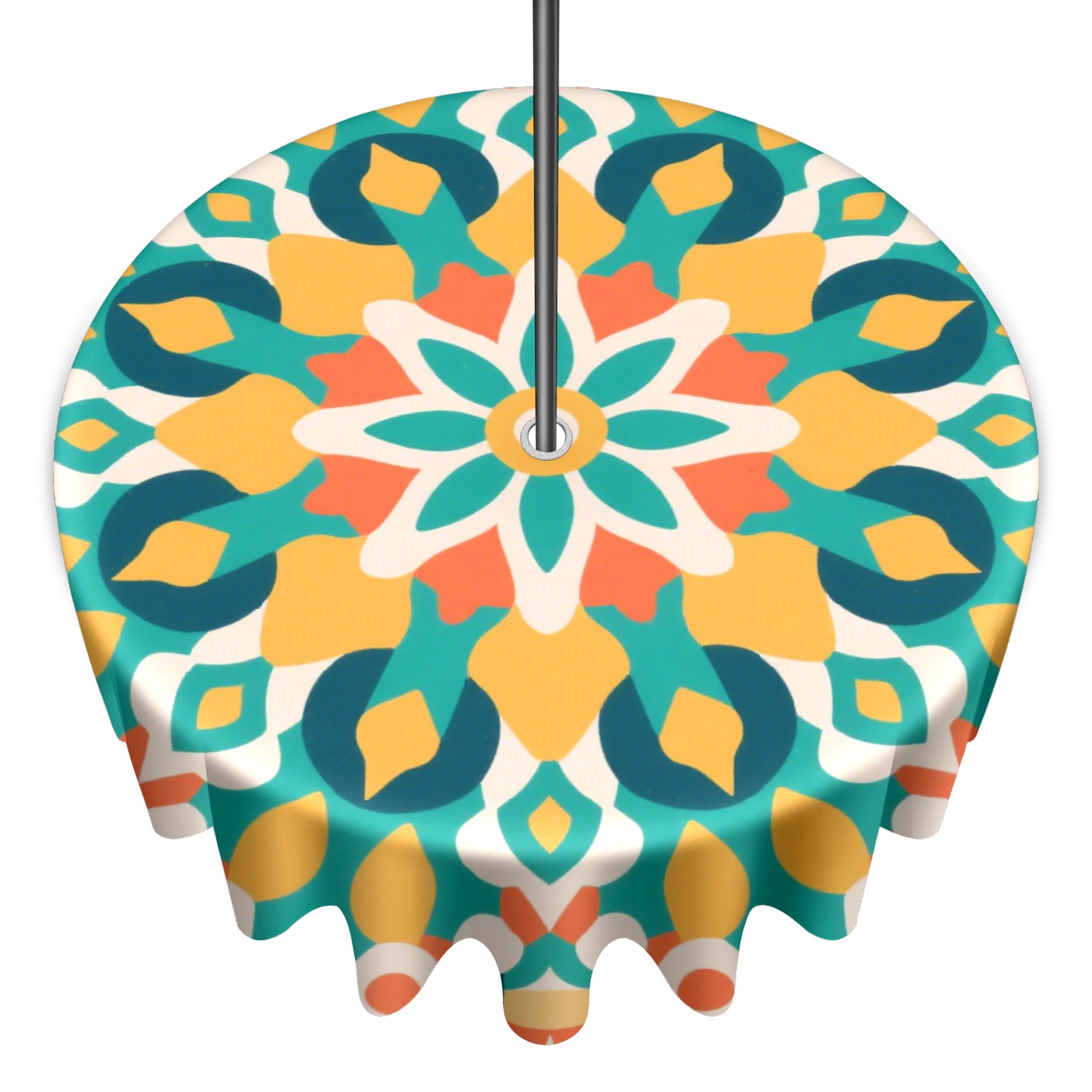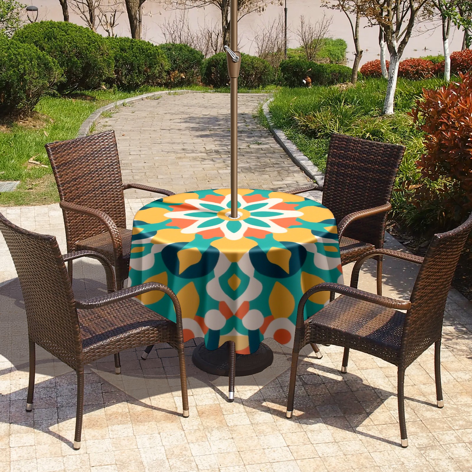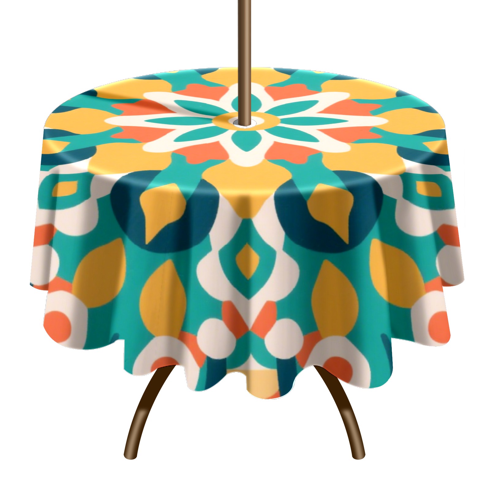 Round Tablecloth with Adjustable Zippered Hole - Durable Polyester for Patio, Restaurant & Outdoor Dining Yellow Geometric Green Pattern (60in)
