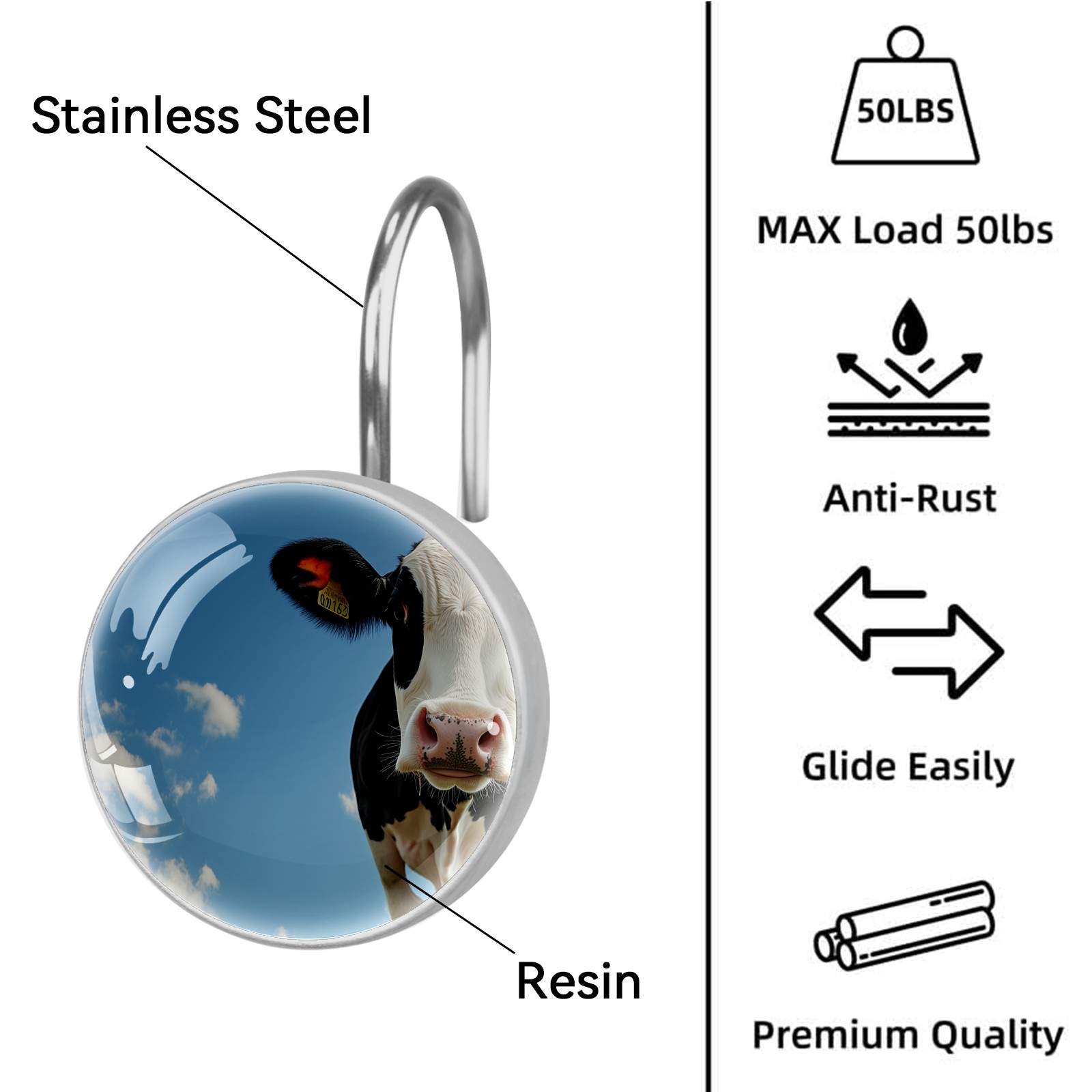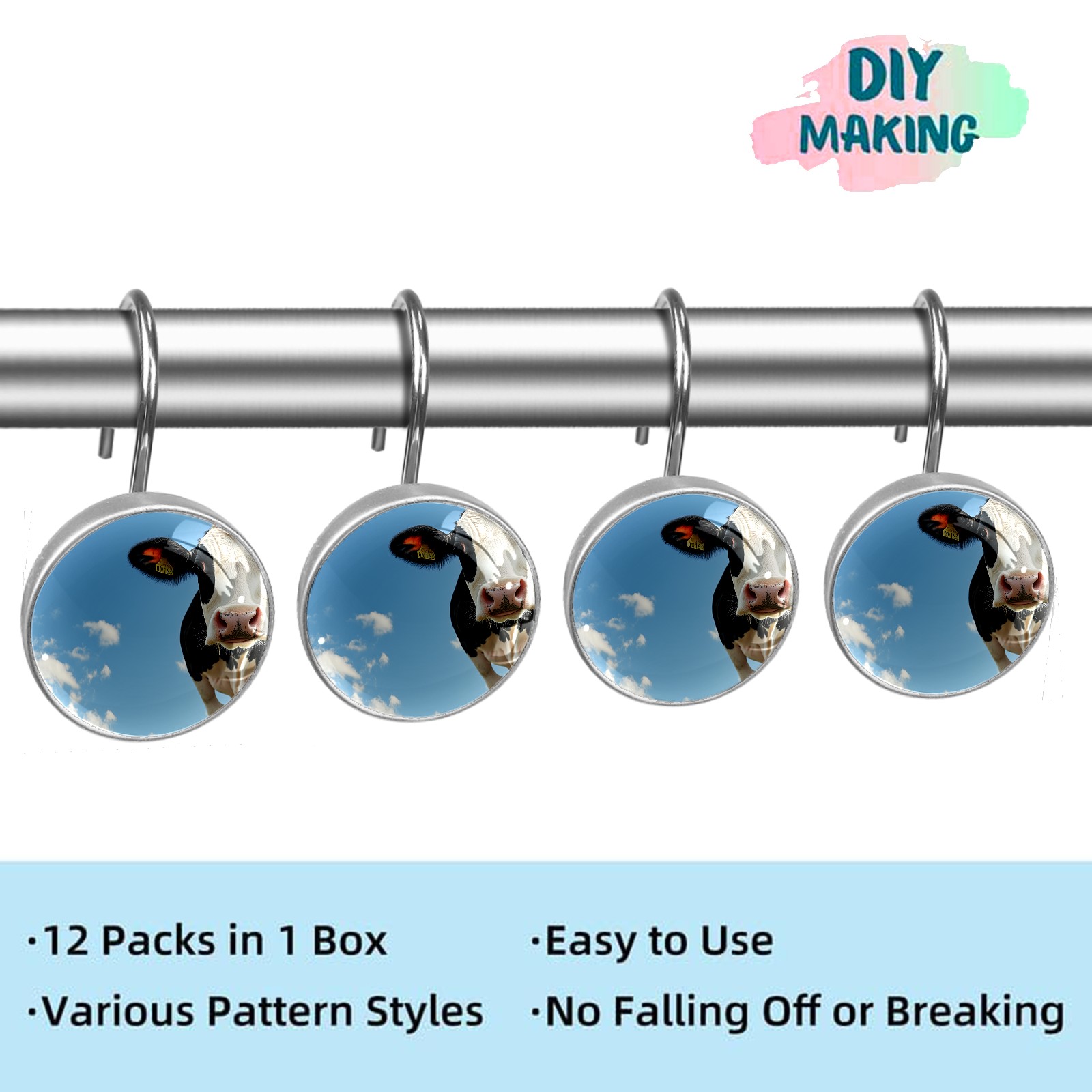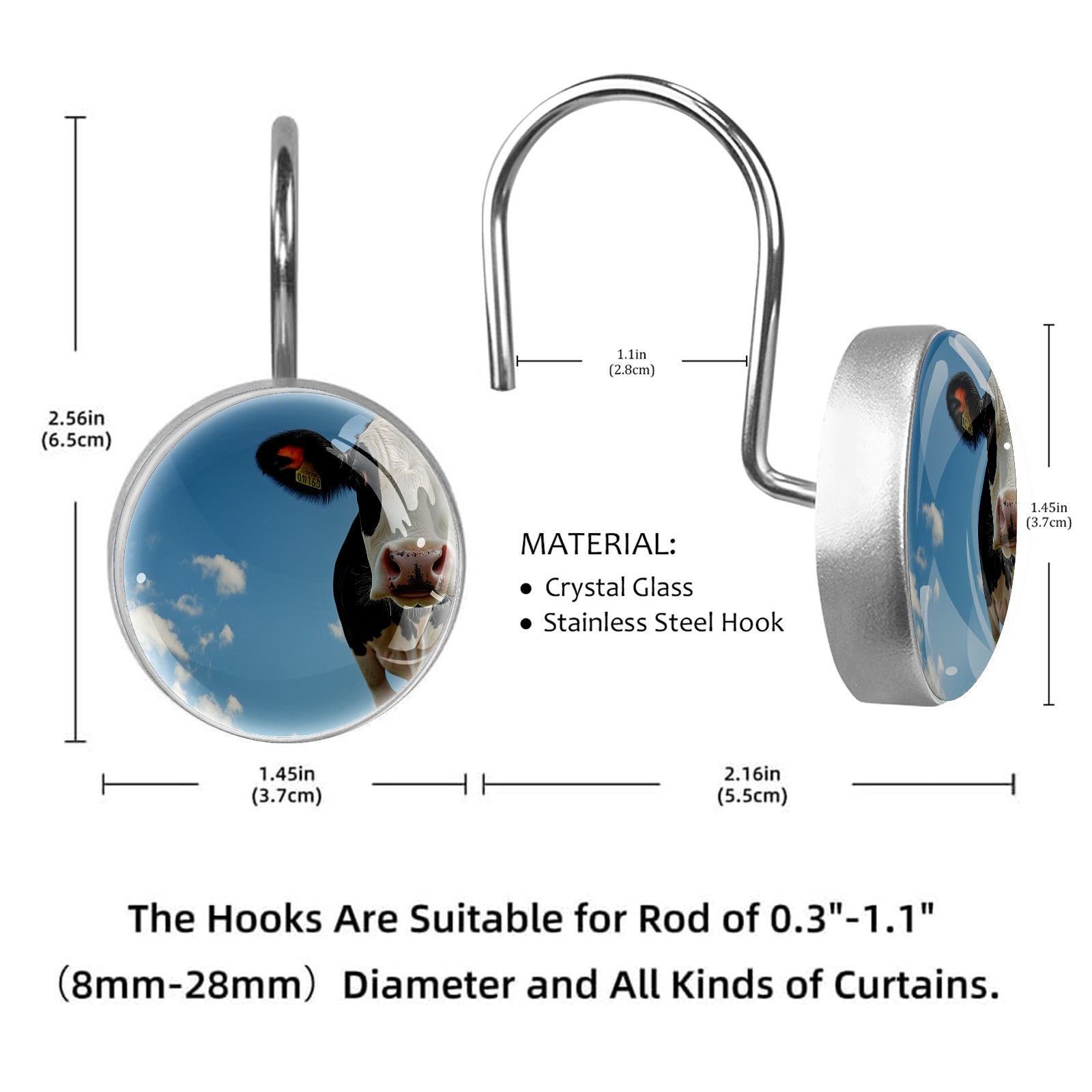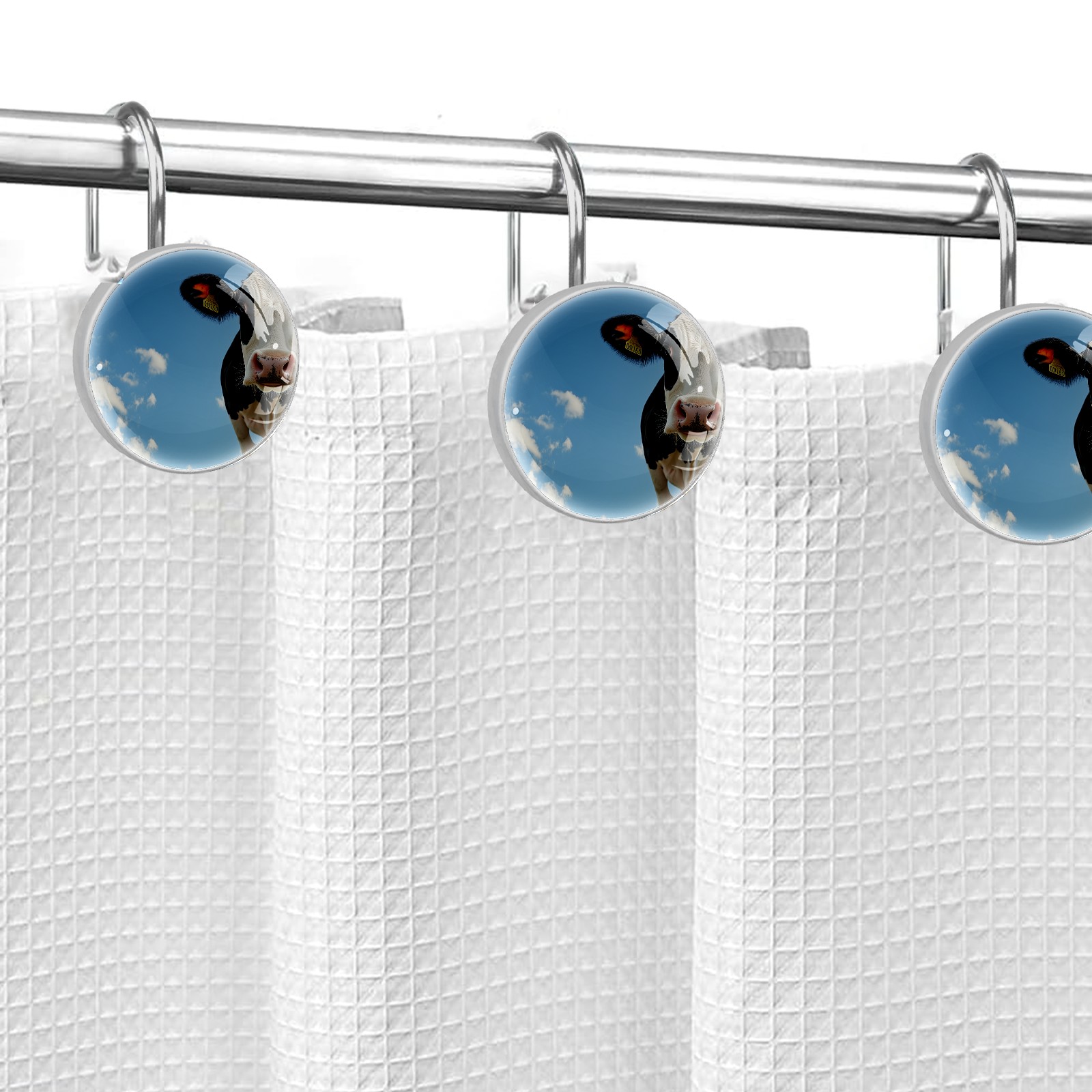Decorative Black White Cow Shower Curtain Hooks 12pcs Crystal Glass Rustproof Shower Hooks for Bathroom Home Decor Stainless Steel Resin Shower Curtain Rings