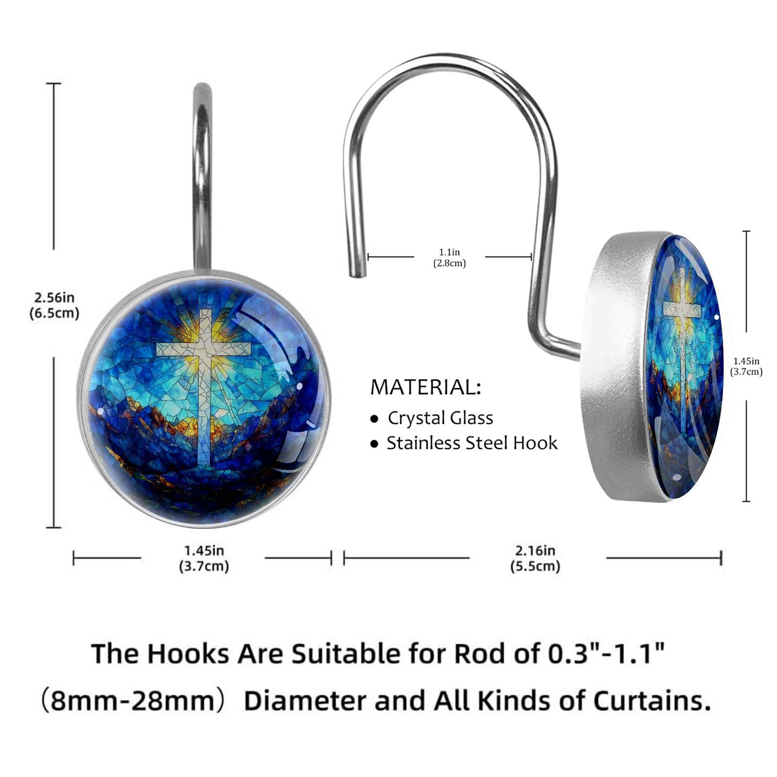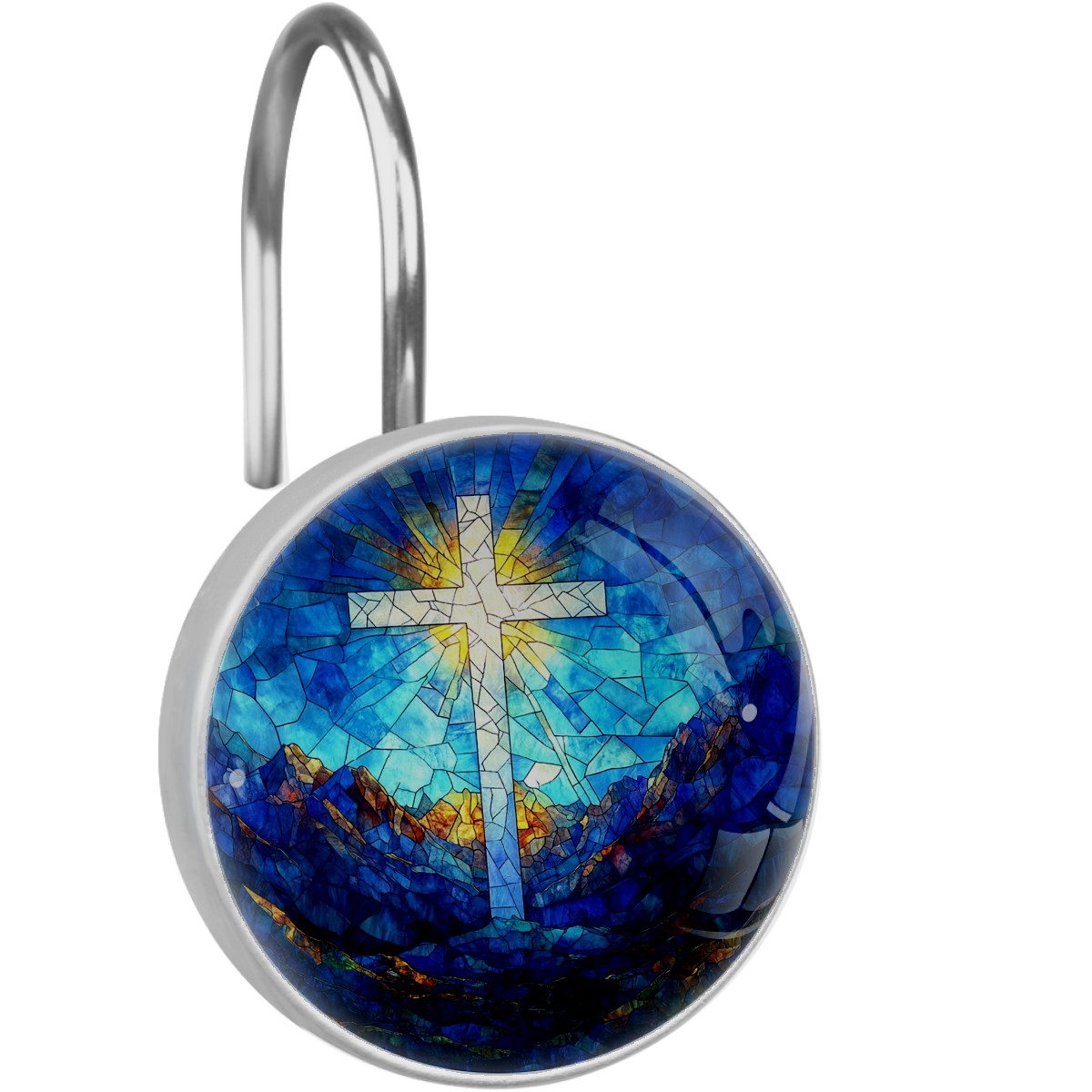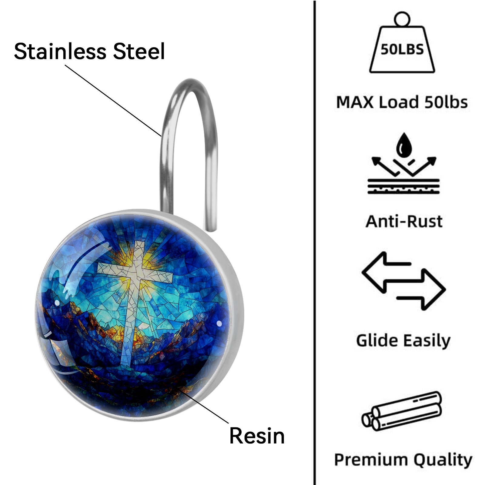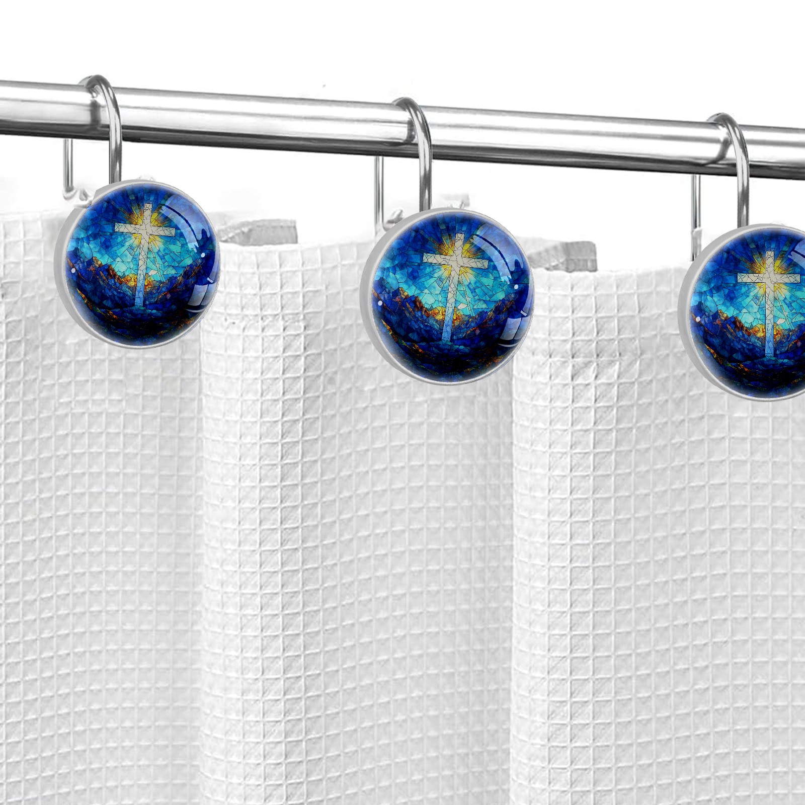 Decorative Stained Glass Cross Shower Curtain Hooks 12pcs Crystal Glass Rustproof Shower Hooks for Bathroom Home Decor Stainless Steel Resin Shower Curtain Rings
