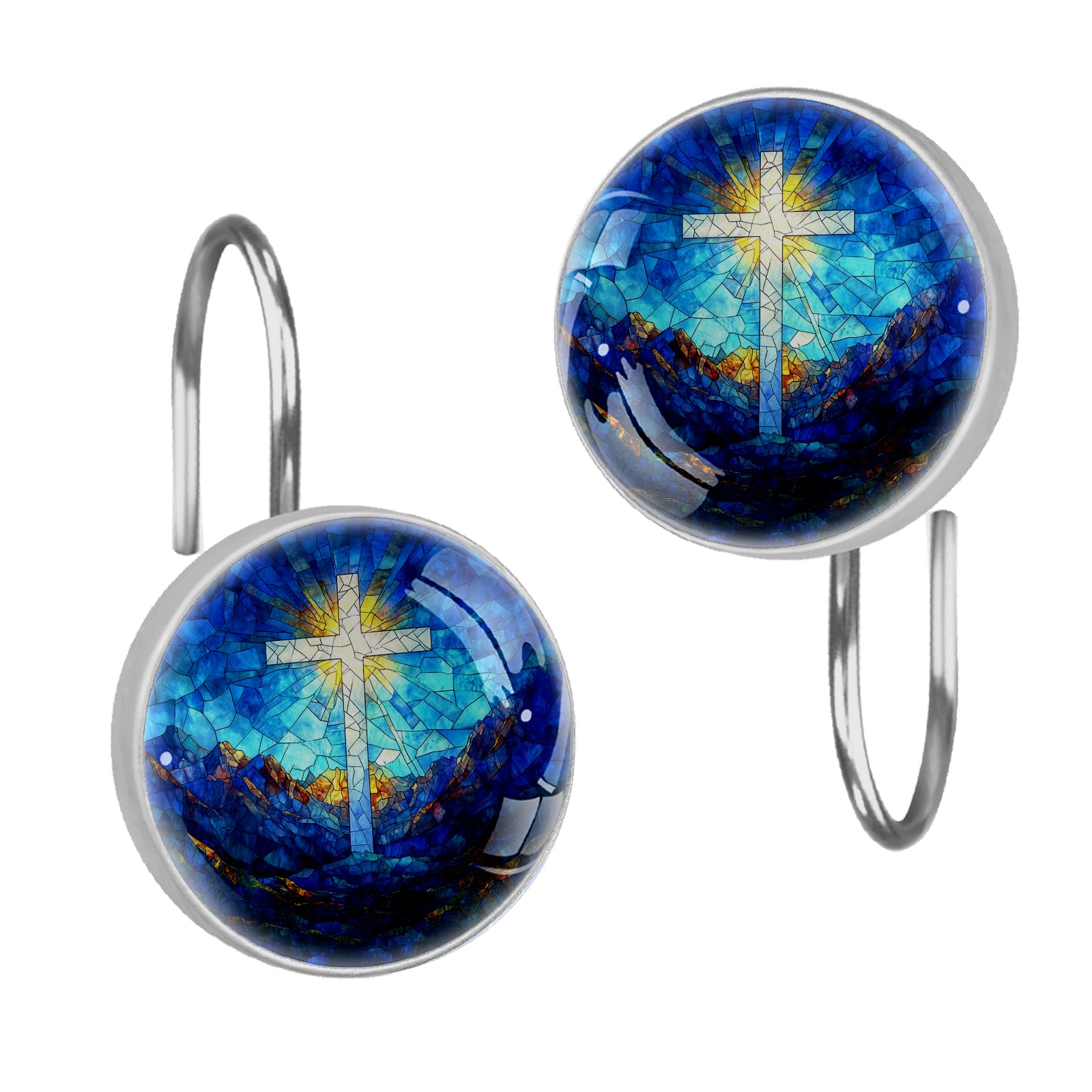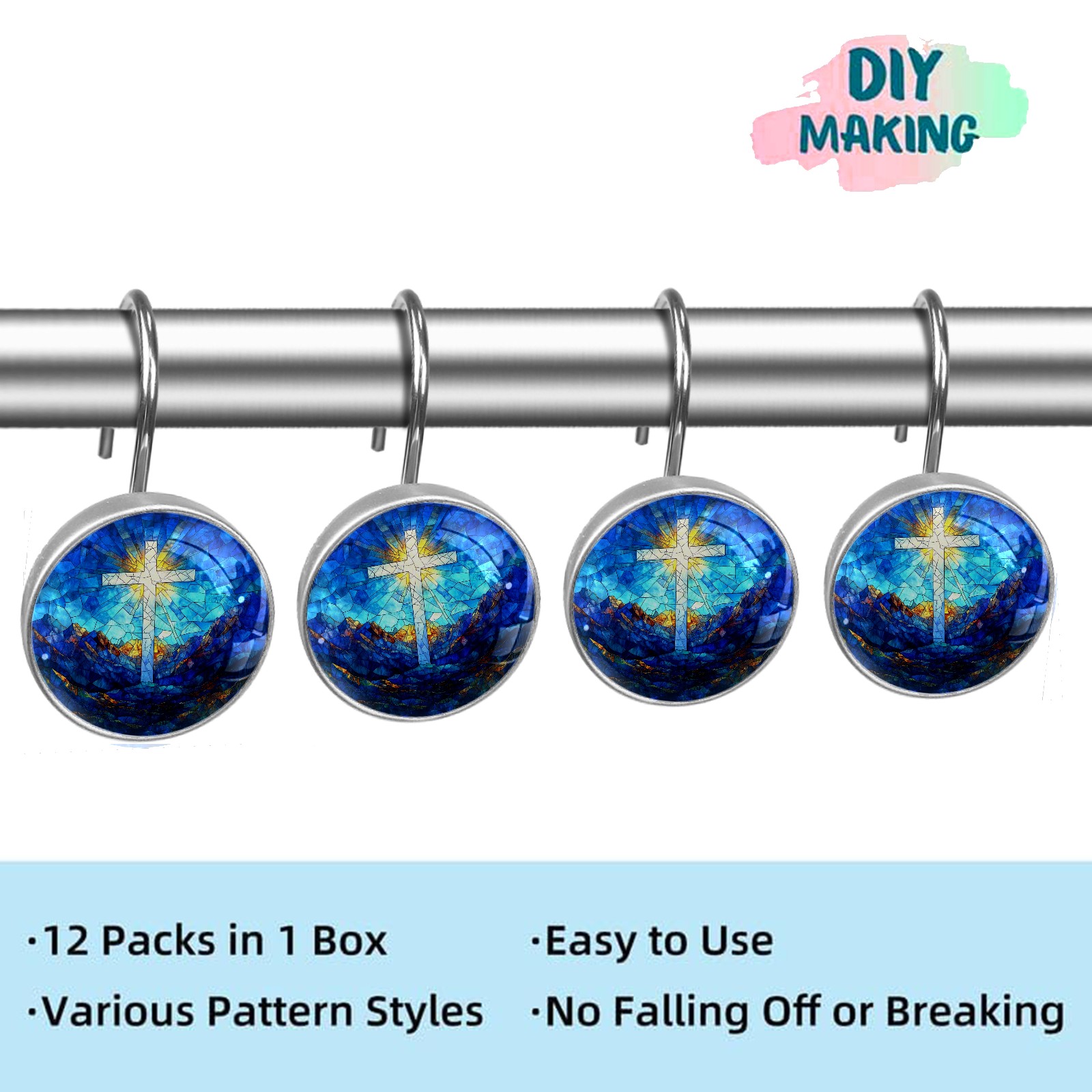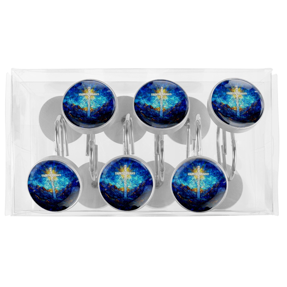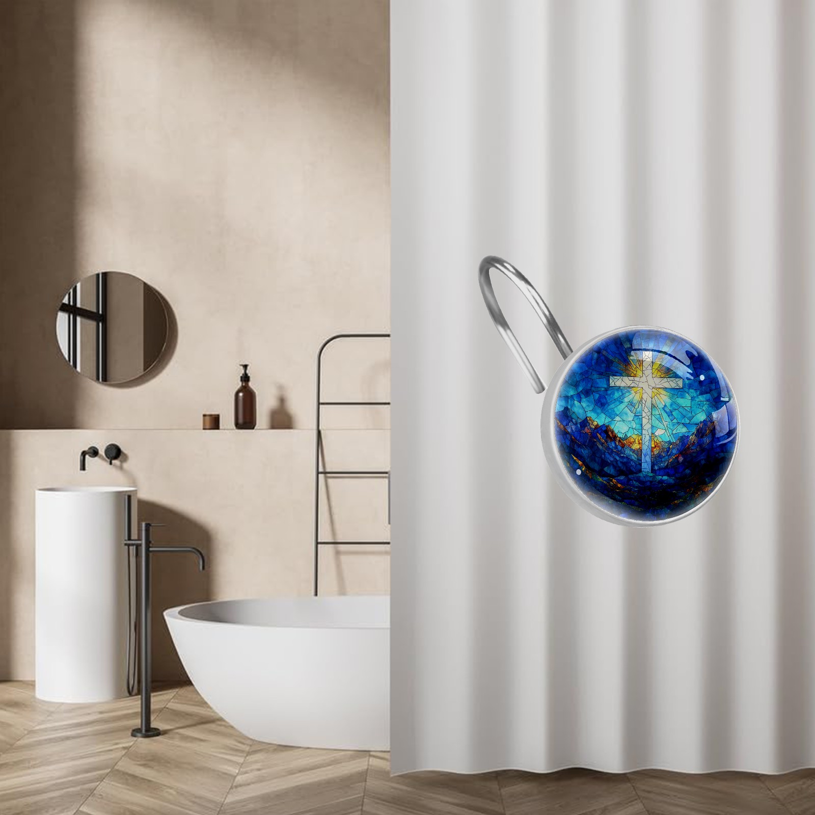 Decorative Stained Glass Cross Shower Curtain Hooks 12pcs Crystal Glass Rustproof Shower Hooks for Bathroom Home Decor Stainless Steel Resin Shower Curtain Rings