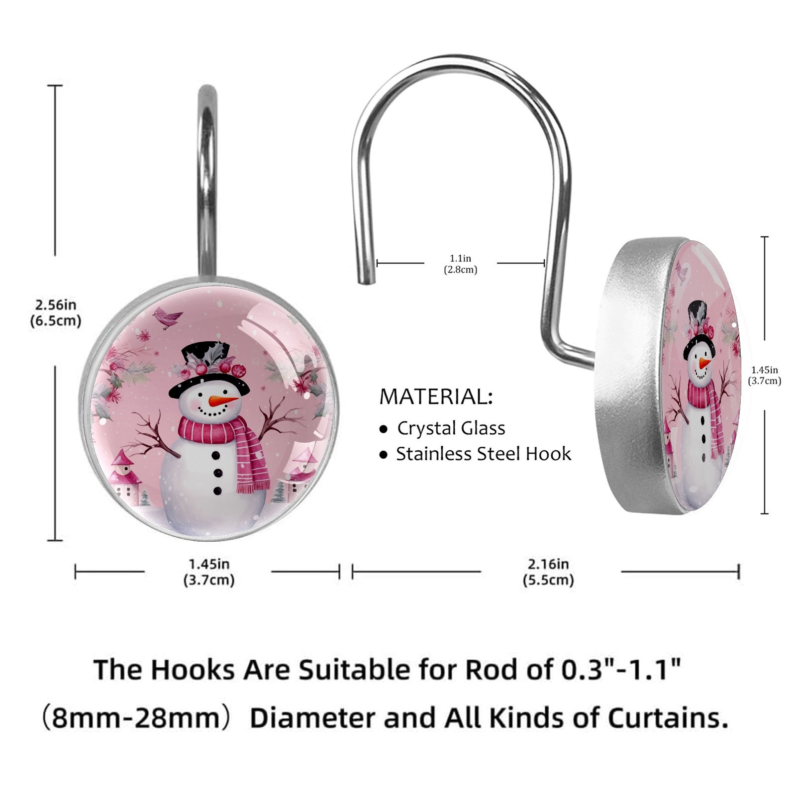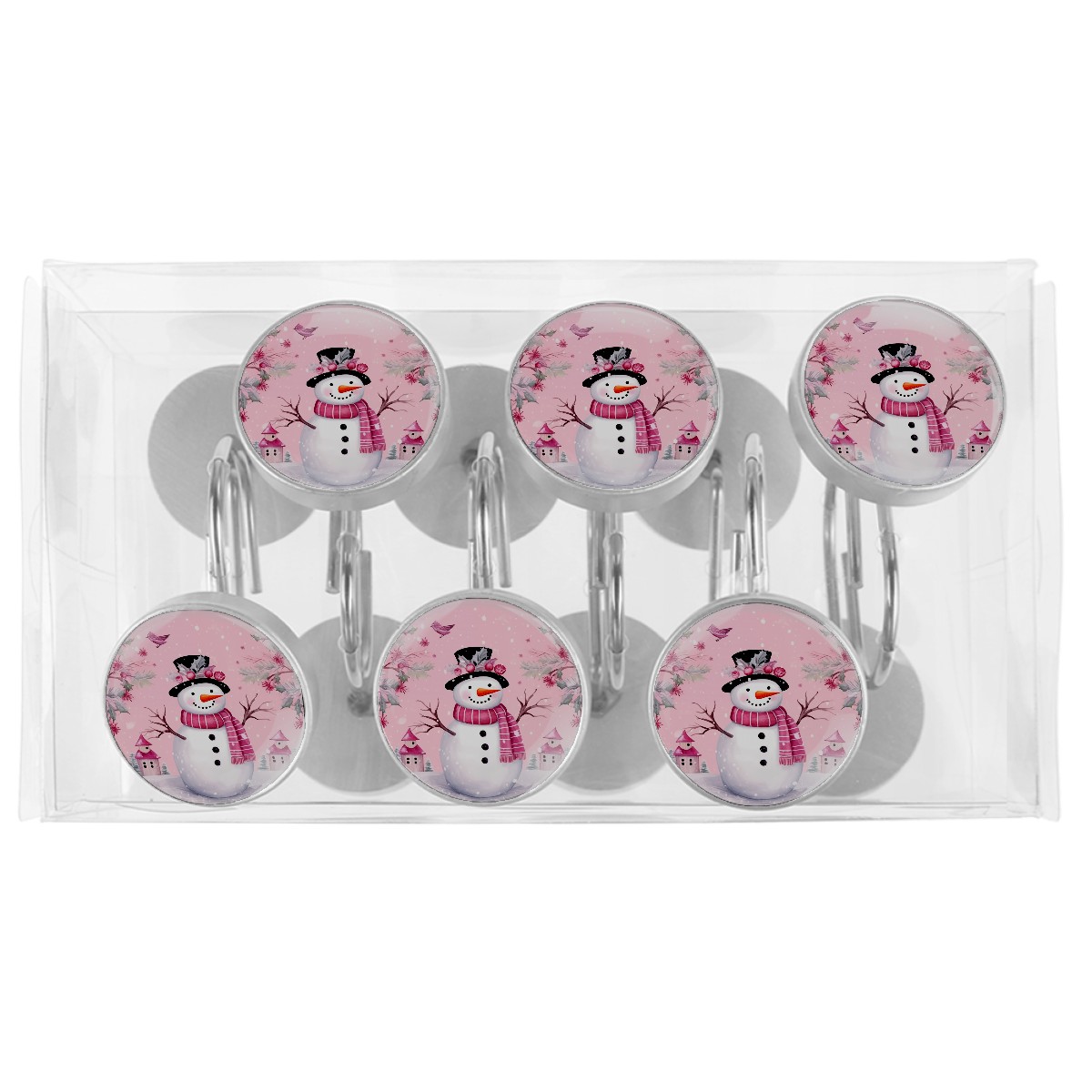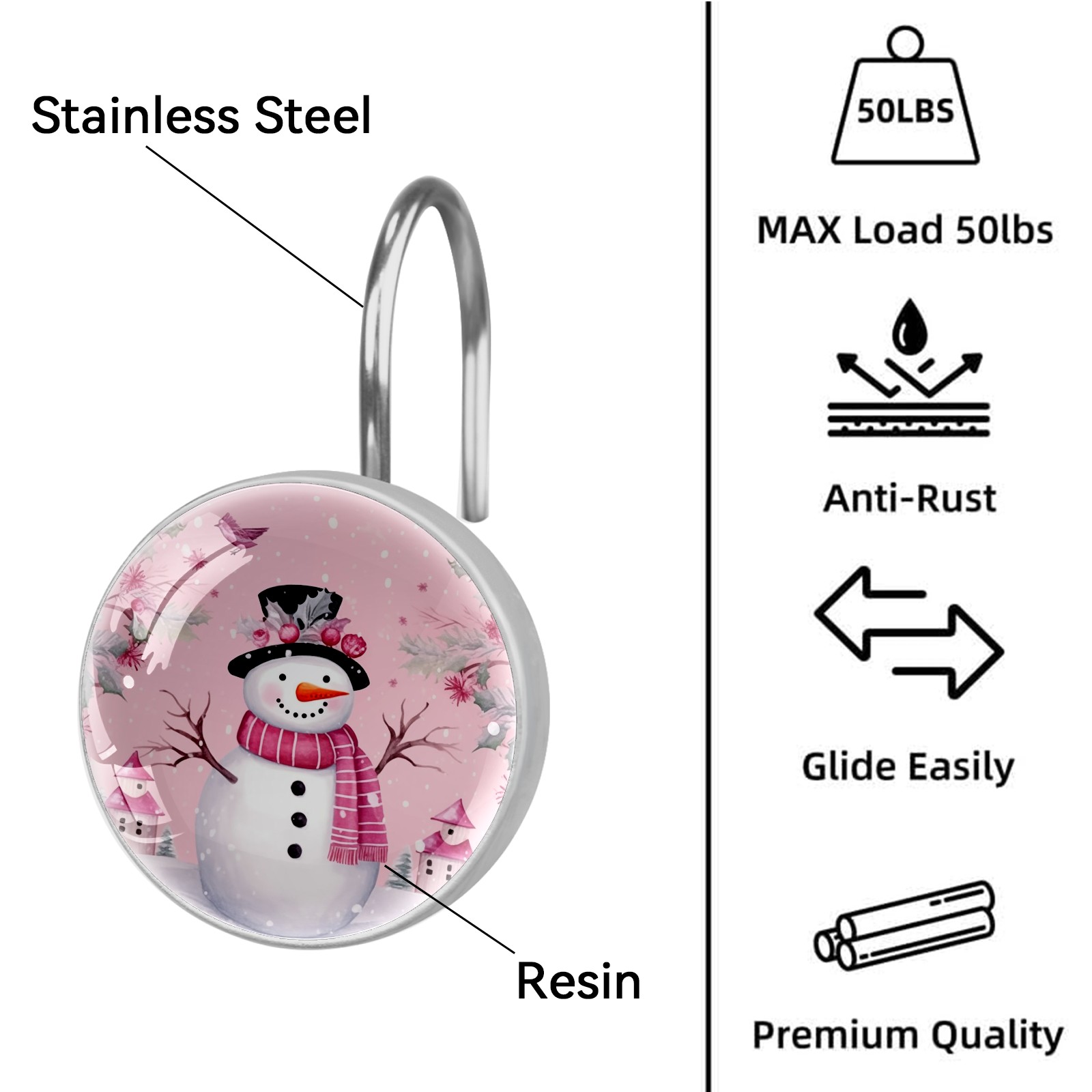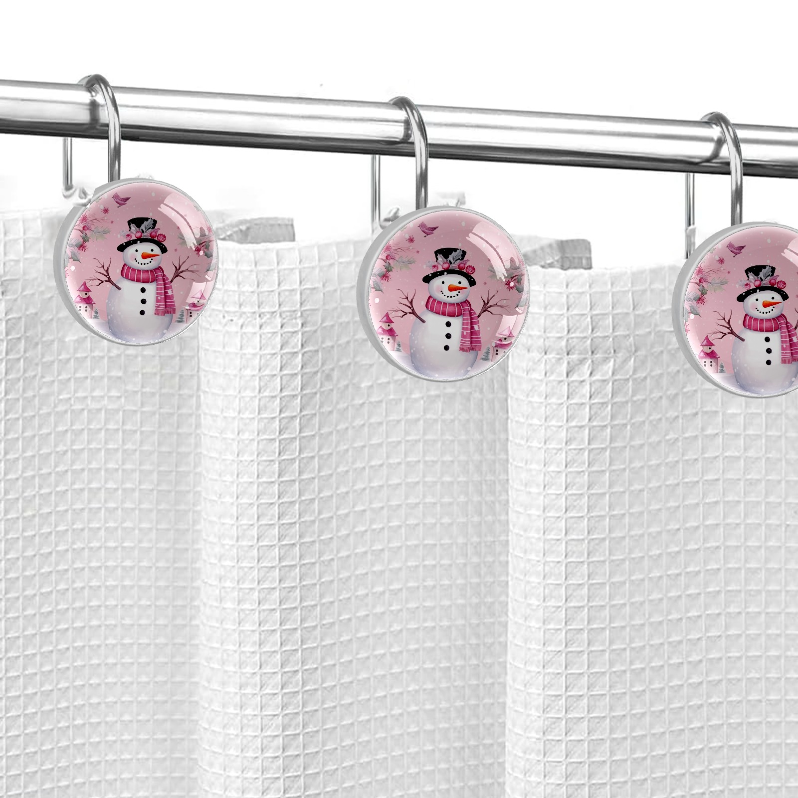 Decorative Christmas Snowman Pink (2) Shower Curtain Hooks 12pcs Crystal Glass Rustproof Shower Hooks for Bathroom Home Decor Stainless Steel Resin Shower Curtain Rings