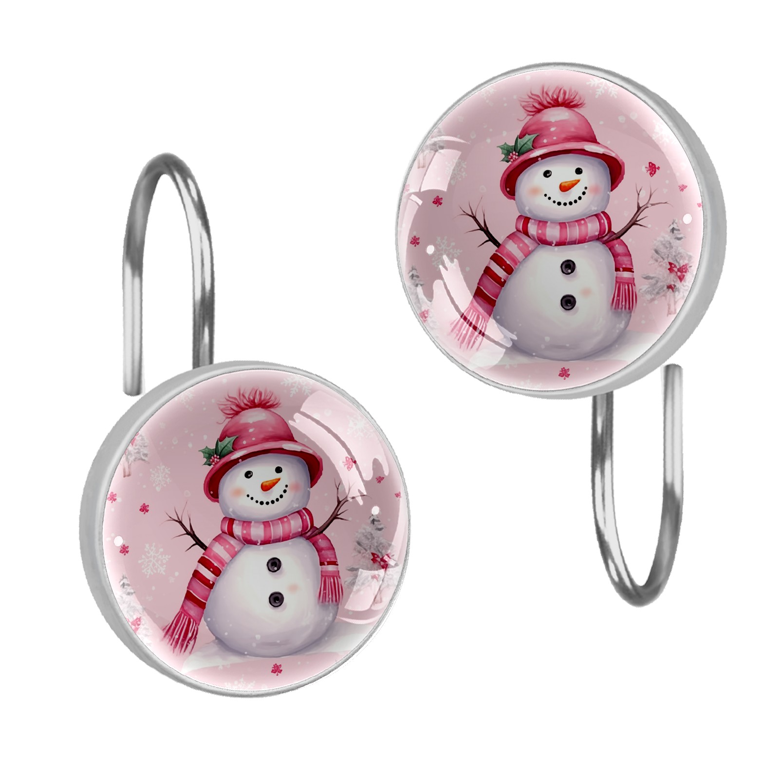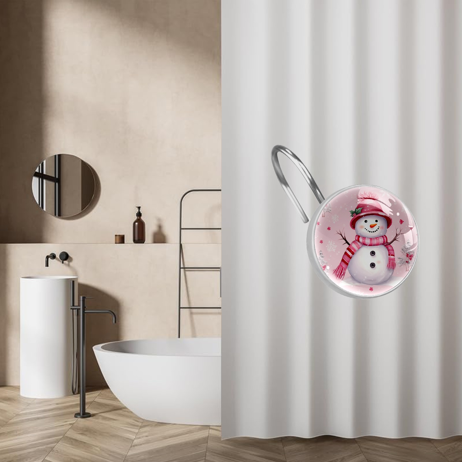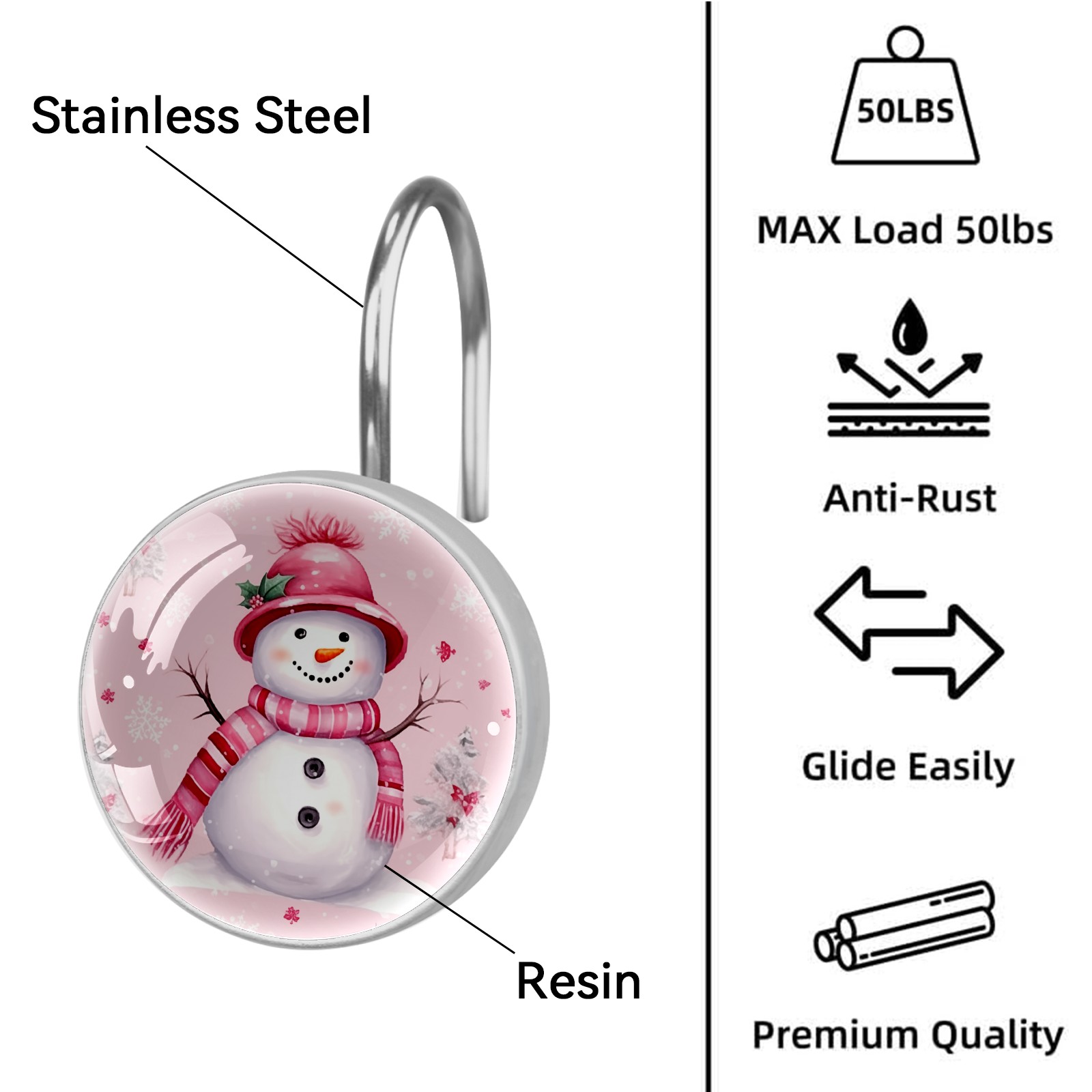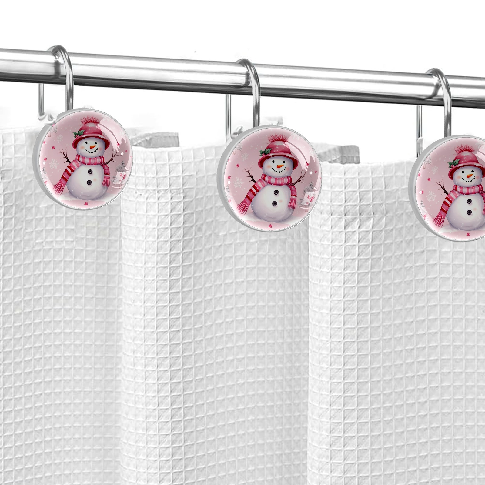 Decorative Christmas Snowman Pink (1) Shower Curtain Hooks 12pcs Crystal Glass Rustproof Shower Hooks for Bathroom Home Decor Stainless Steel Resin Shower Curtain Rings