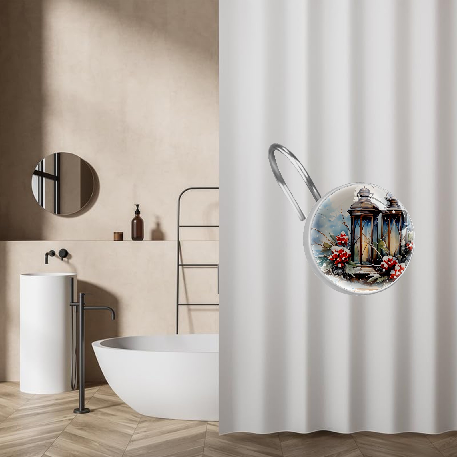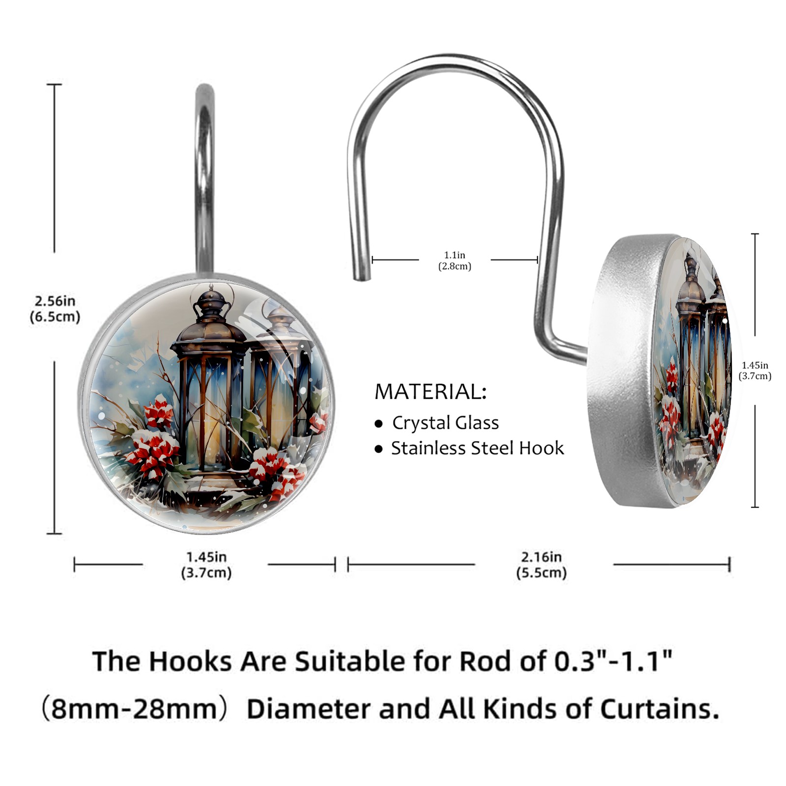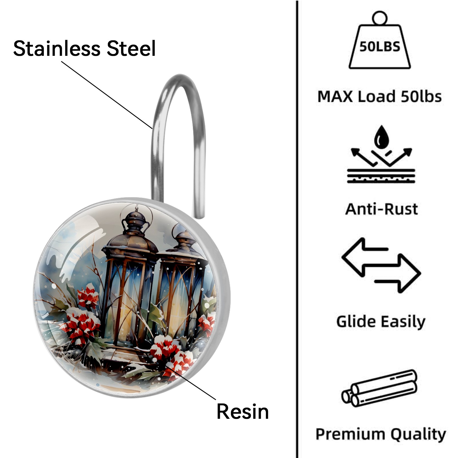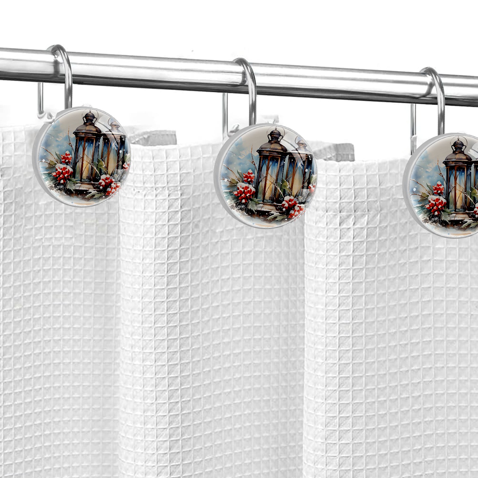 Decorative Vintage Christmas Winter Shower Curtain Hooks 12pcs Crystal Glass Rustproof Shower Hooks for Bathroom Home Decor Stainless Steel Resin Shower Curtain Rings