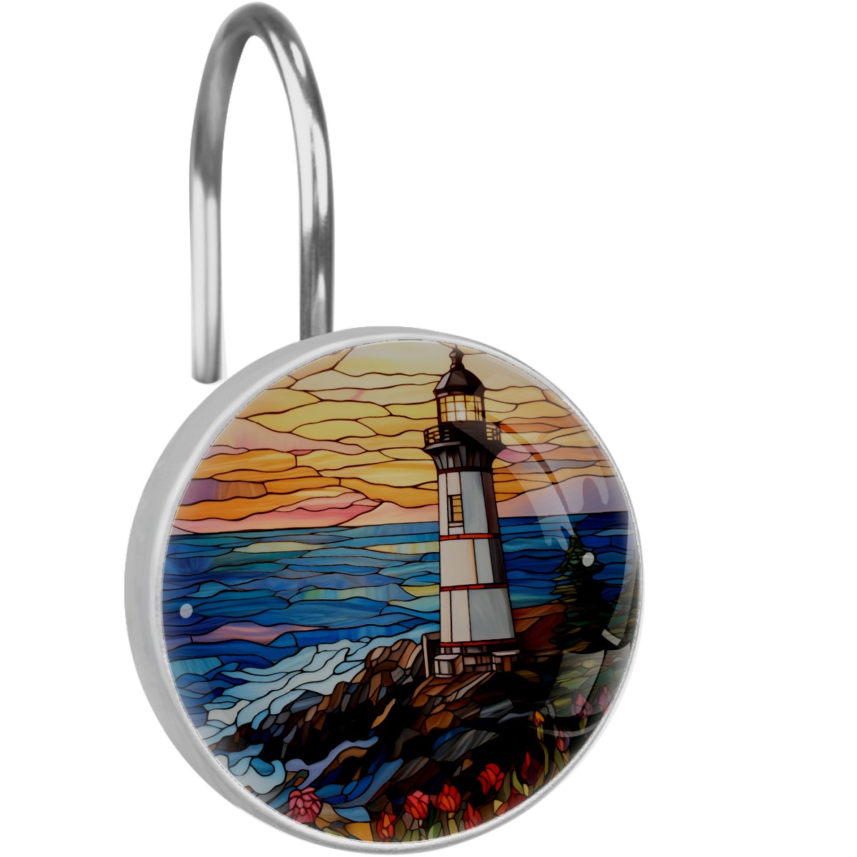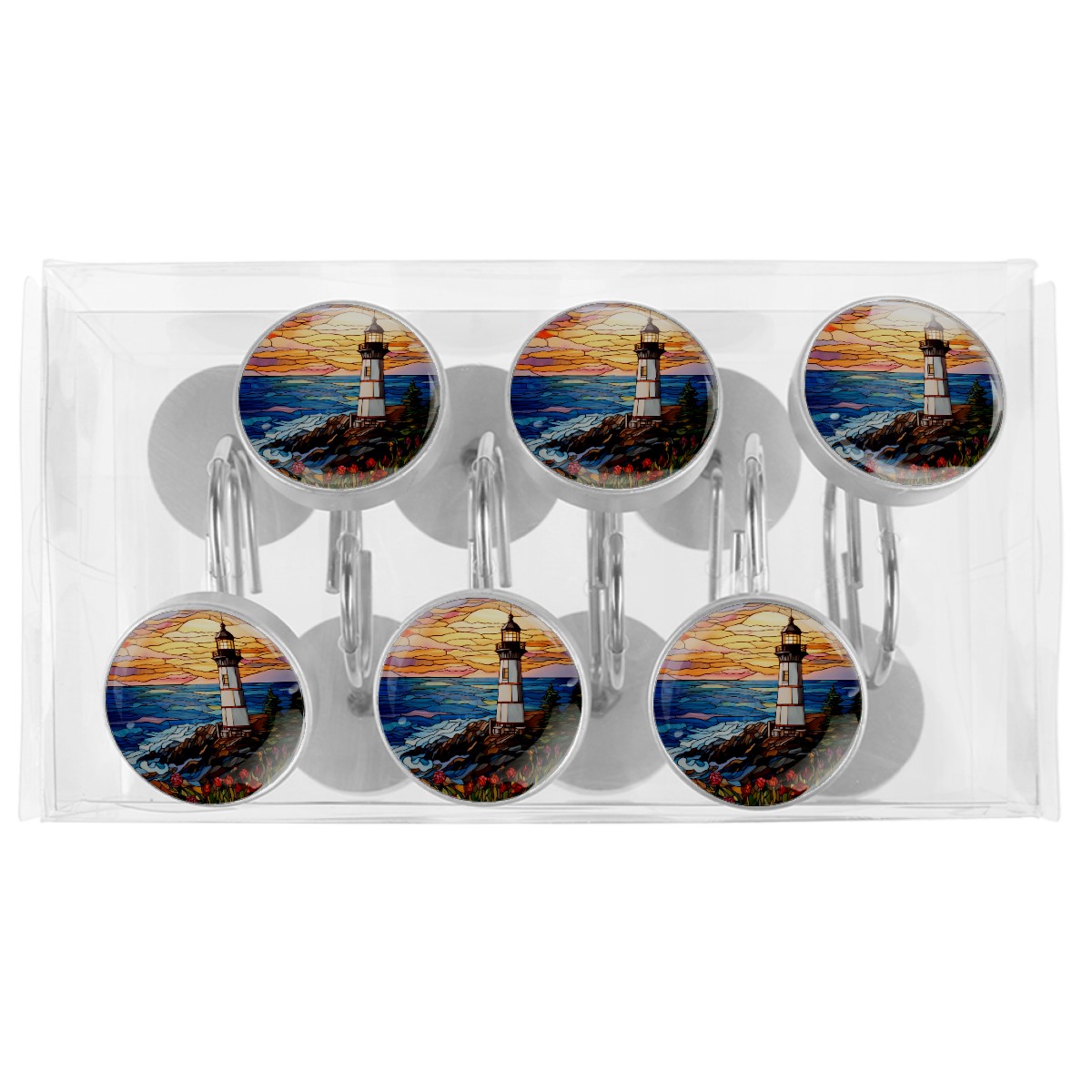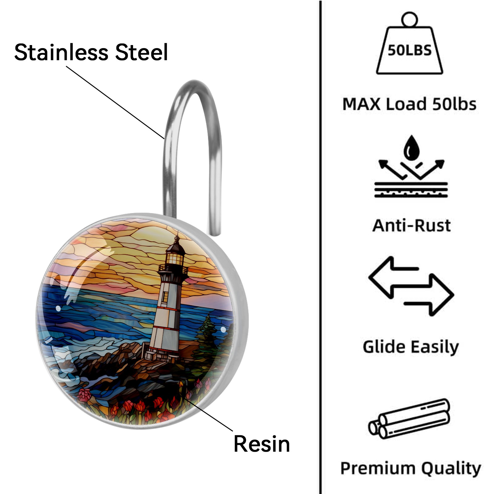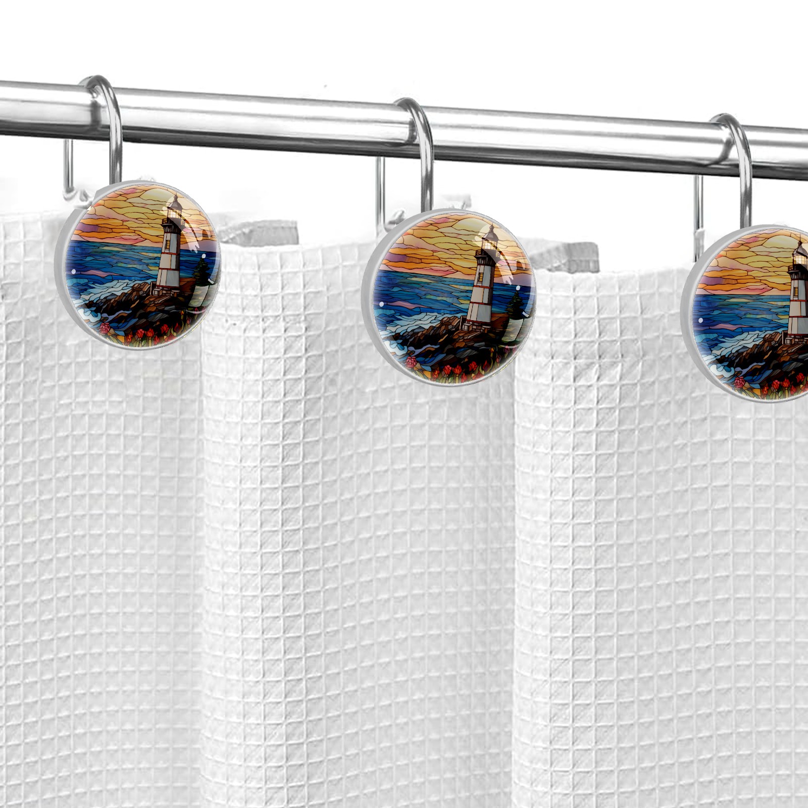 Decorative Stained Glass Lighthouse Shower Curtain Hooks 12pcs Crystal Glass Rustproof Shower Hooks for Bathroom Home Decor Stainless Steel Resin Shower Curtain Rings